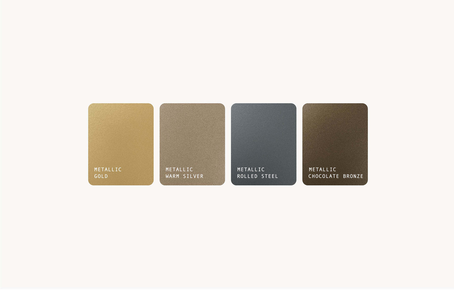 Elevated yet grounded, this palette brings a sense of raw luxury to any space. Featuring metallic gold, warm silver, rolled steel, and chocolate bronze, these finishes offer a rich materiality that feels both modern and timeless. Designed to adapt across verticals from sleek hospitality settings to elevated commercial environments, each tone adds depth, warmth, and a subtle touch of glamour. The Elementals are about quiet confidence: finishes that stand out without shouting, and invite designers to layer texture and tone, into every project.
