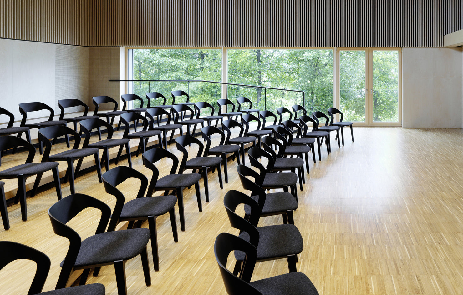 With its generous proportions and clean, open silhouette, Mixis combines comfort with practicality. The chair stacks four high for easy storage, while optional seat upholstery replaces the MDF base with a foam pad for protection and visual continuity. Choose polyethylene or felt glides for floor compatibility; a trolley is available upon request.