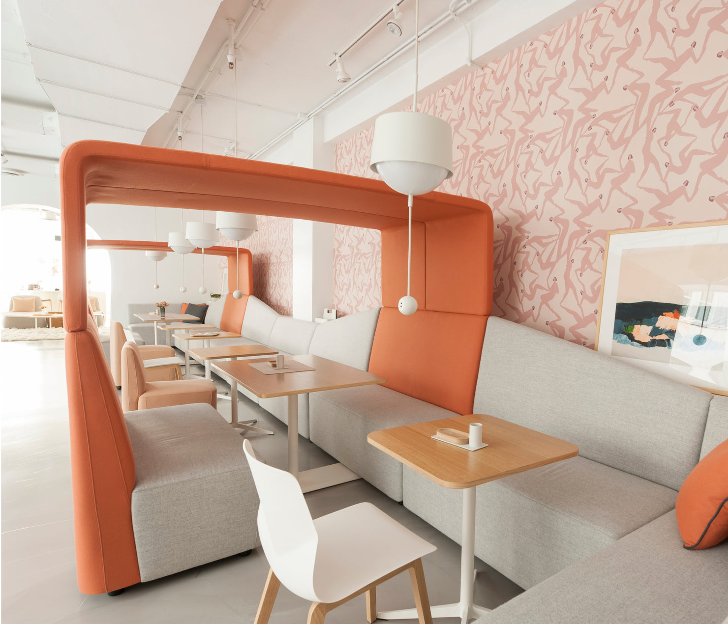 Products from our European brand partners helped bring the Atrium space to life. The FourLikes Modular Collection created a banquette style seating area, complete with a meeting booth with canopy for those private moments of calm. The Nest Easy Chairs from +Halle made for a comfortable space to tuck away from the chaos for a moment and recharge.