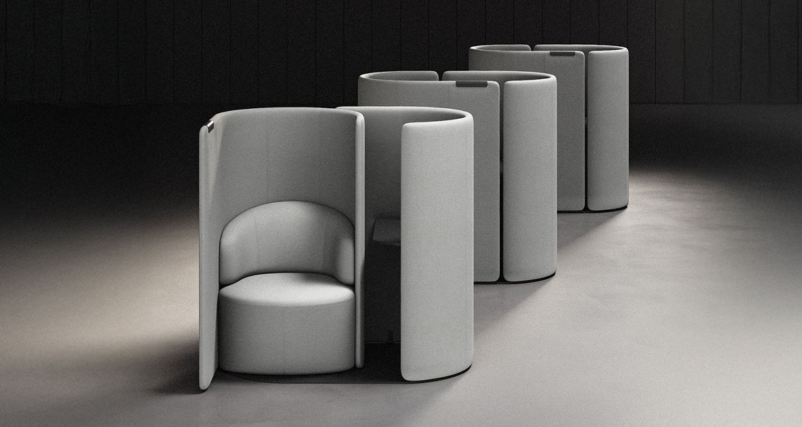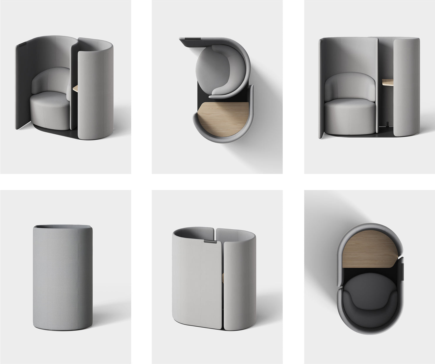Within its sculptural form, Tulipan combines a swivel seat, small table, and rotating enclosure with an integrated handle for intuitive entry. Soft yet defined, it dampens sound and filters sightlines, offering comfort and focus without isolation — a refined, human-centered retreat for today’s open environments.