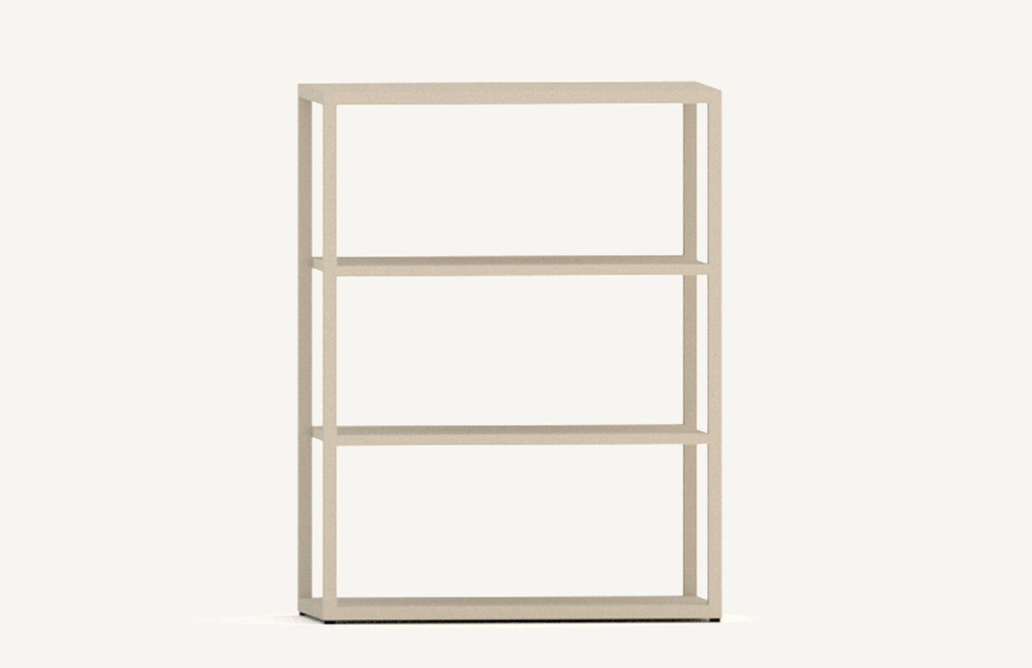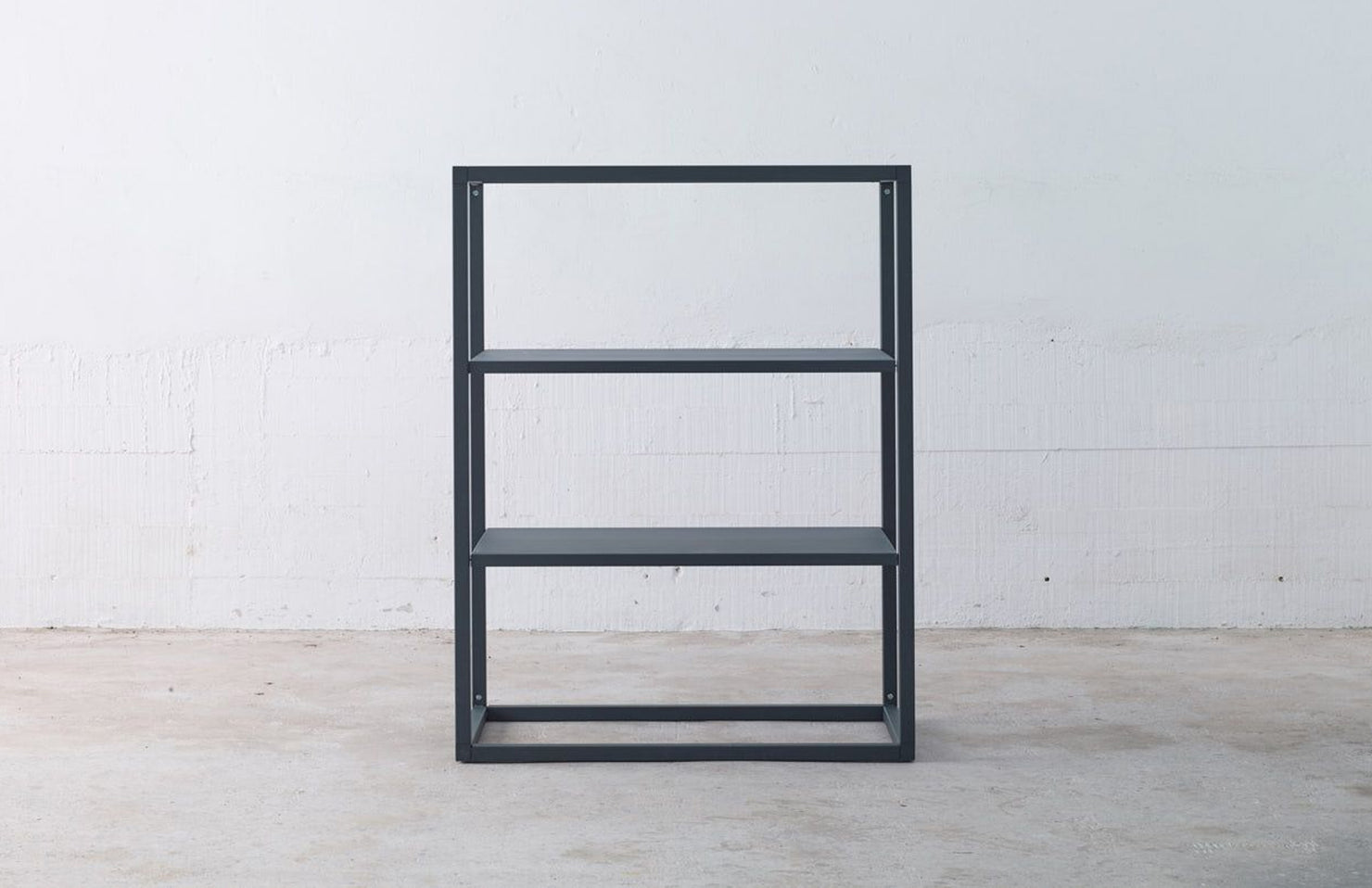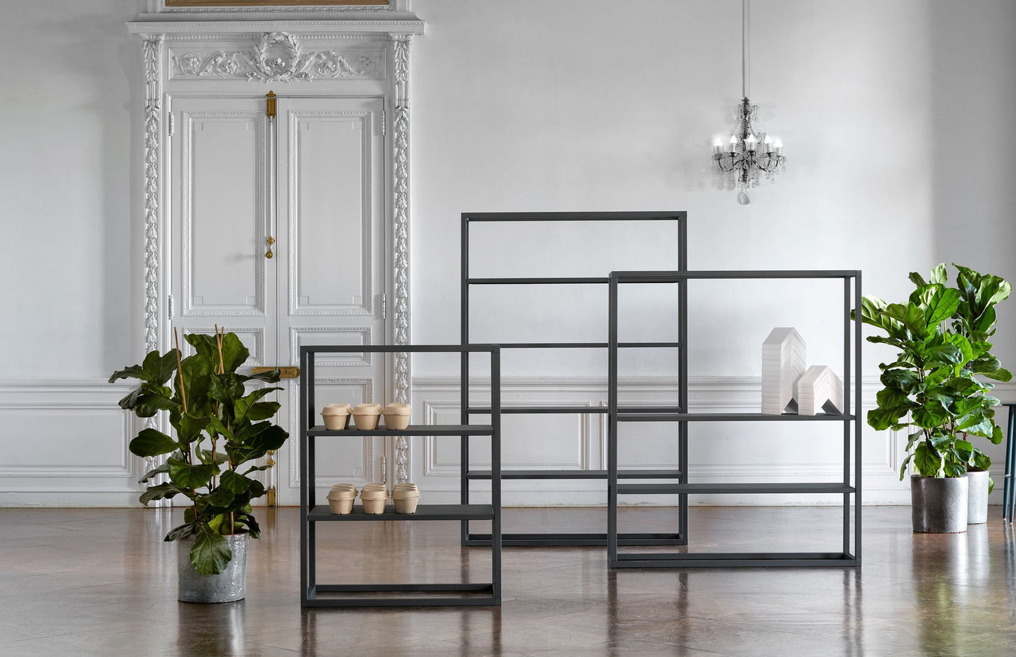 A beautifully minimal modular shelving system with endless options for customization and accessories, including planters, drawers, and ganging tables.