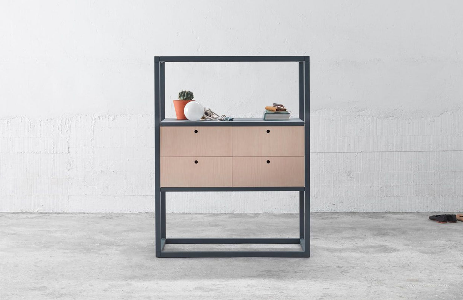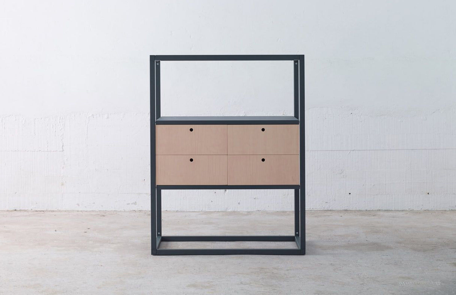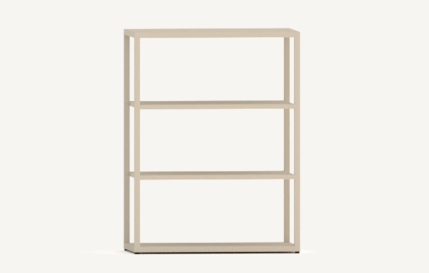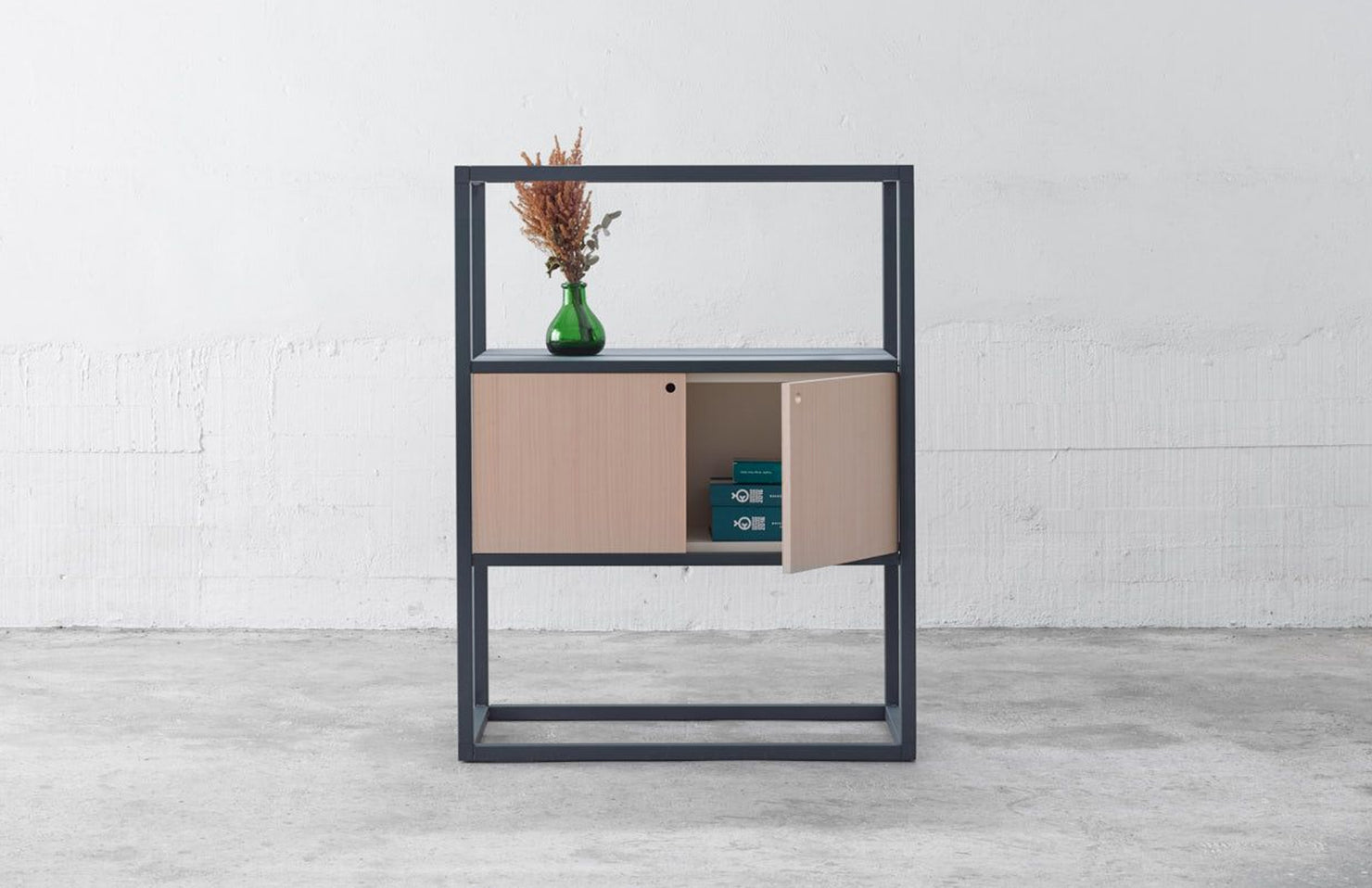 A beautifully minimal modular shelving system with endless options for customization and accessories, including planters, drawers, and ganging tables.