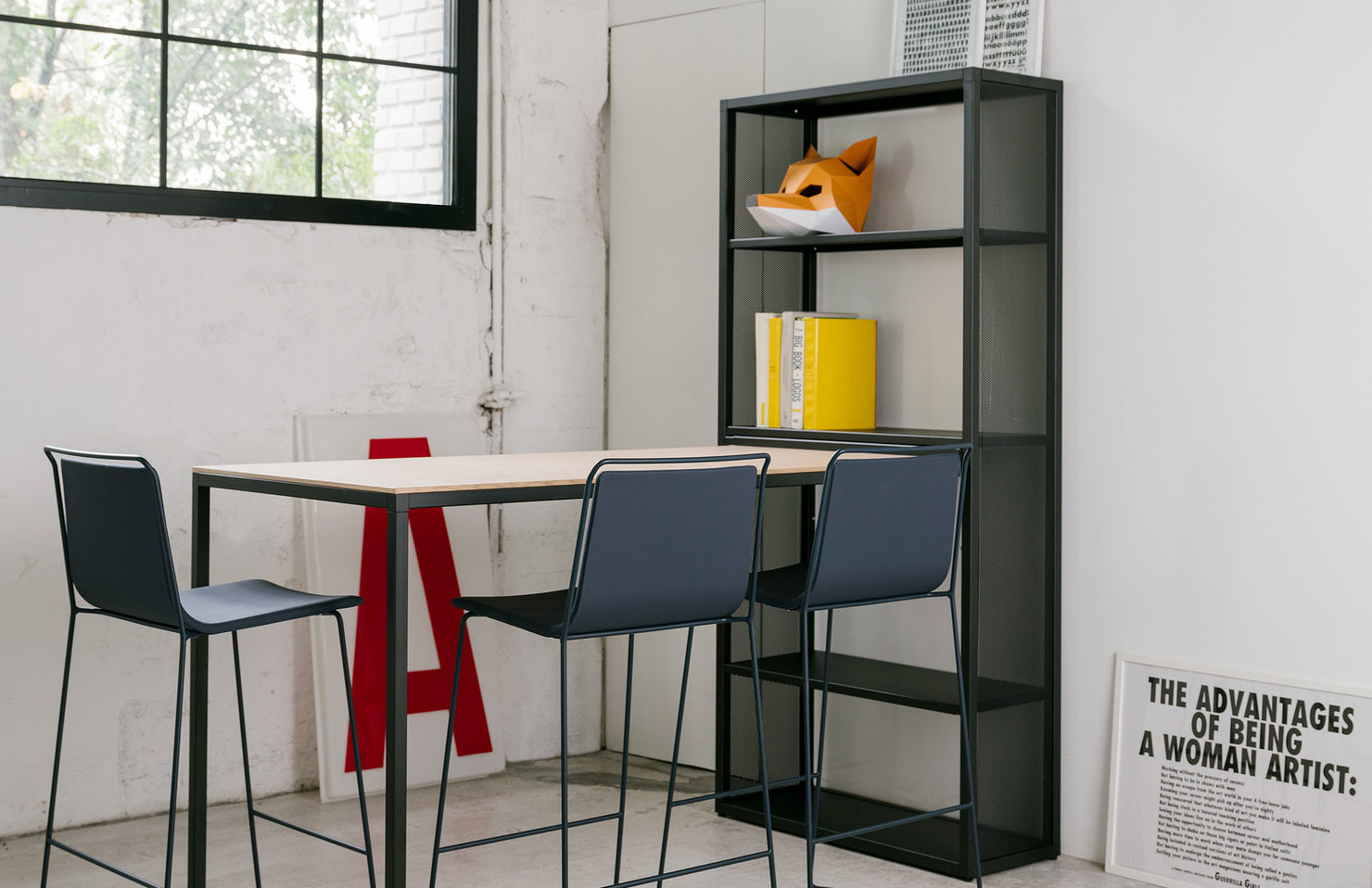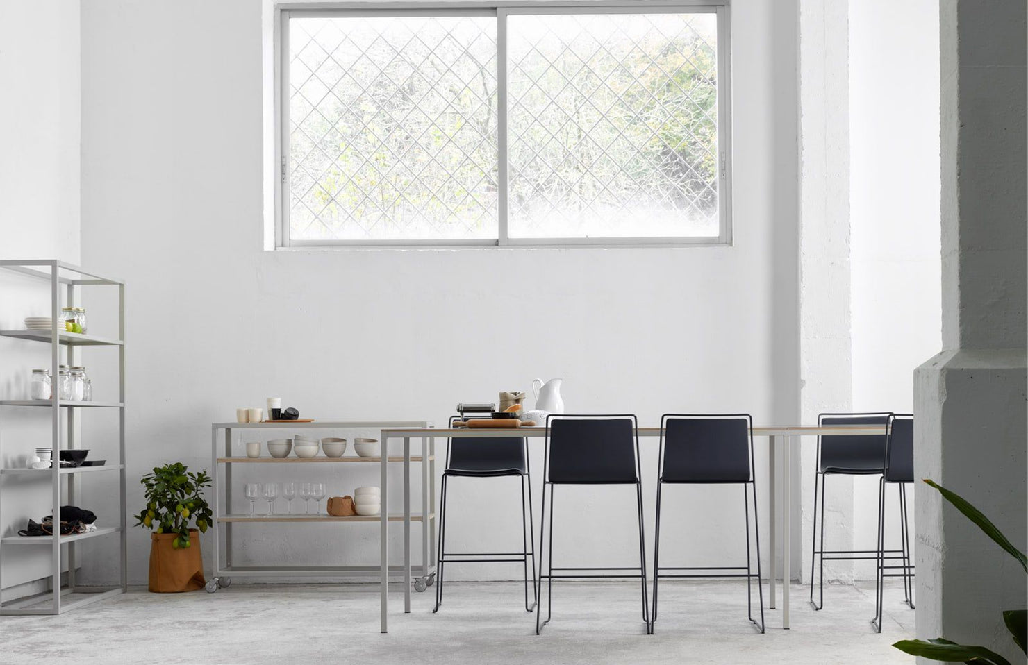 A beautifully minimal modular shelving system with endless options for customization and accessories, including planters, drawers, and ganging tables.
