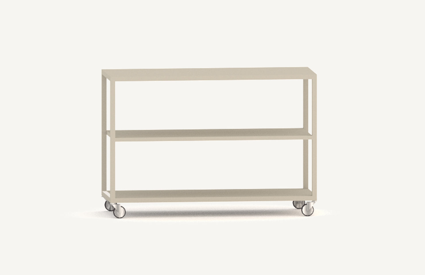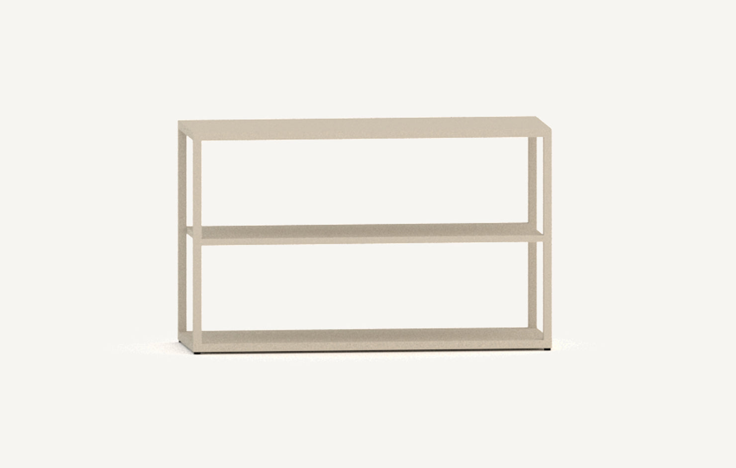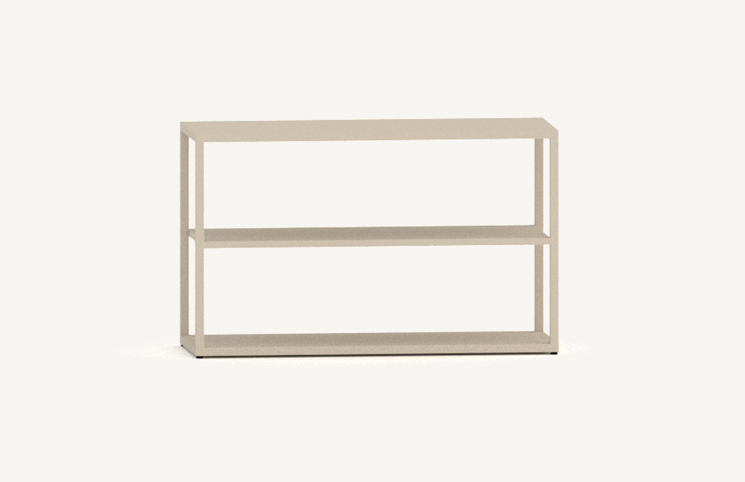 A beautifully minimal modular shelving system with endless options for customization and accessories, including planters, drawers, and ganging tables.