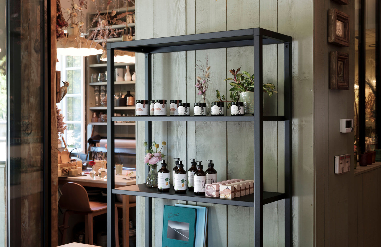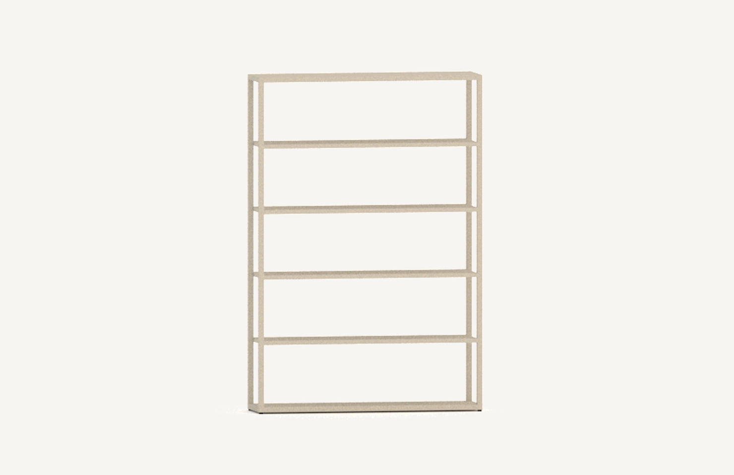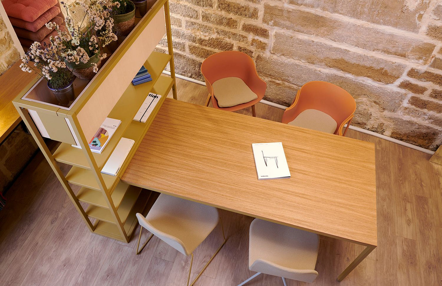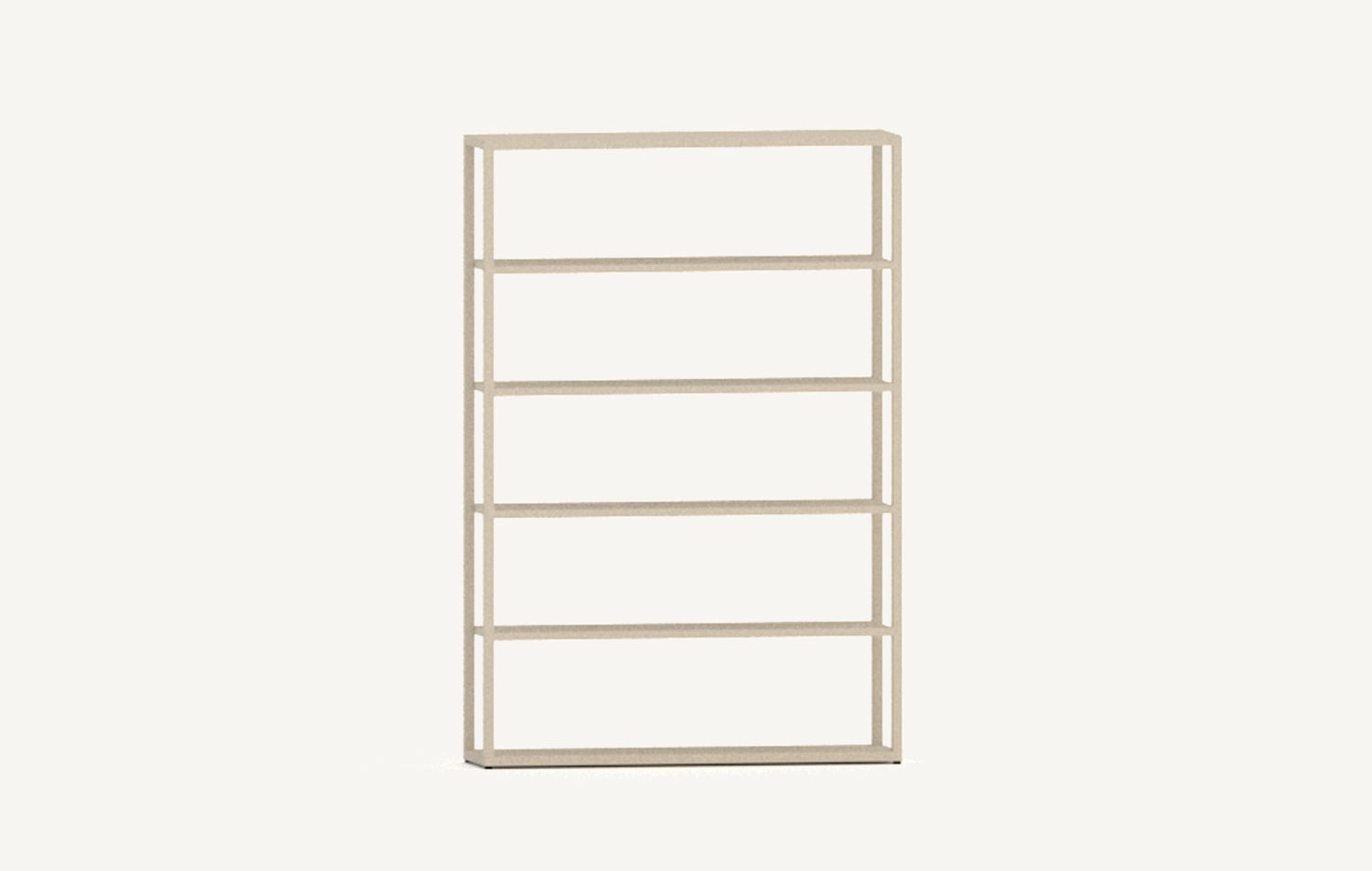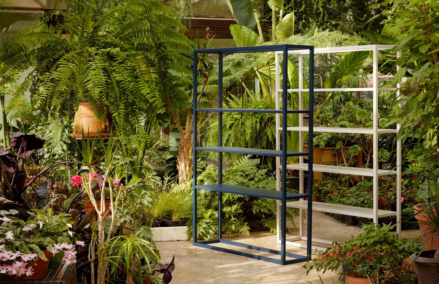 A beautifully minimal modular shelving system with endless options for customization and accessories, including planters, drawers, and ganging tables.