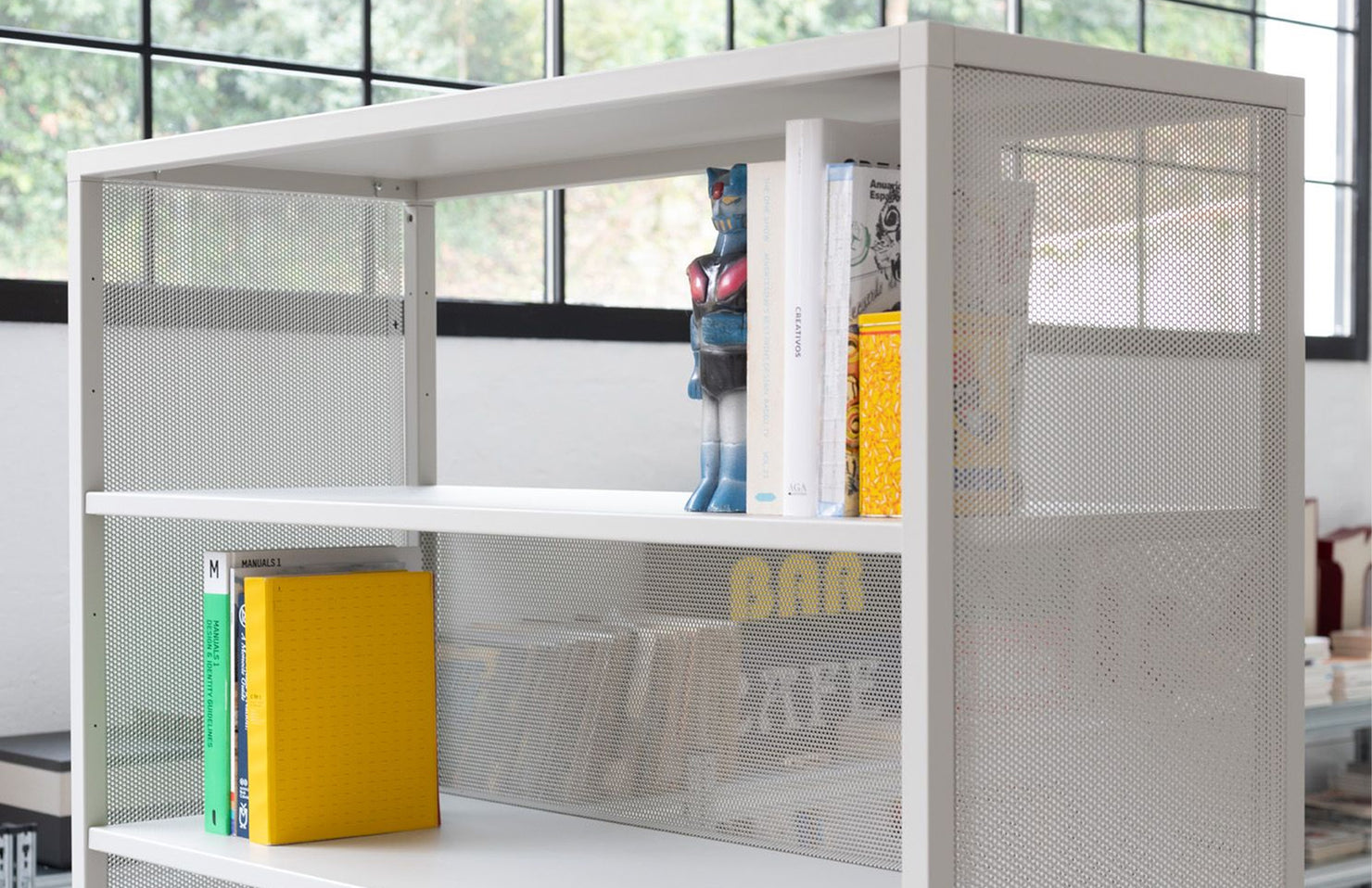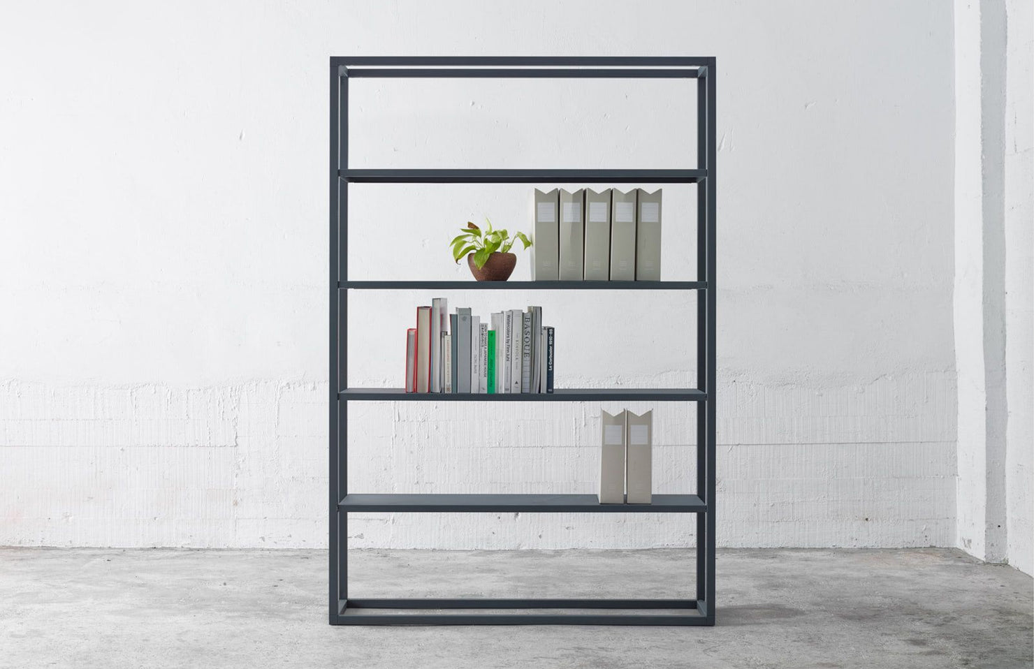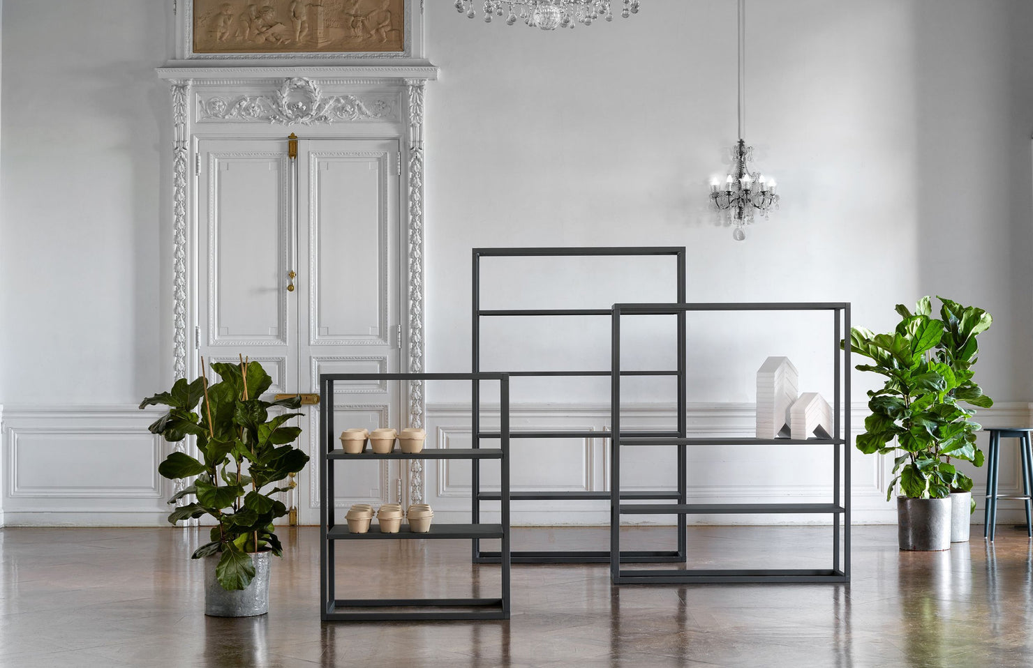 A beautifully minimal modular shelving system with endless options for customization and accessories, including planters, drawers, and ganging tables.