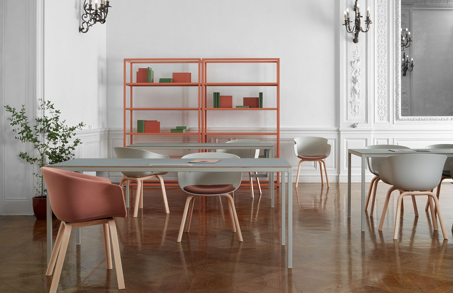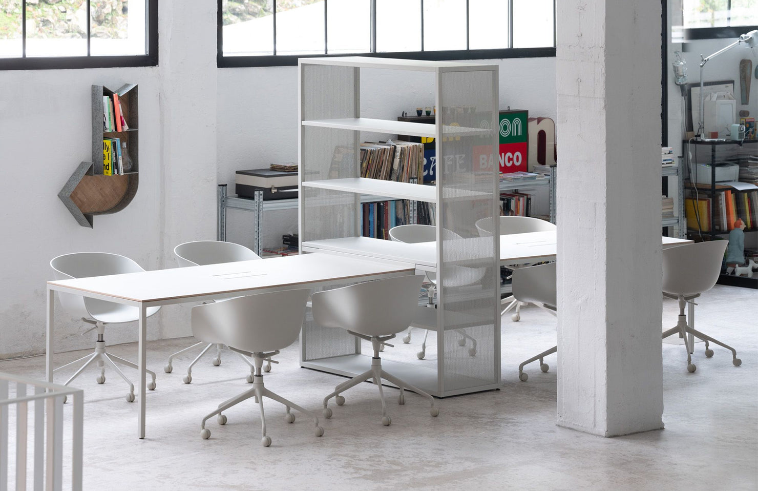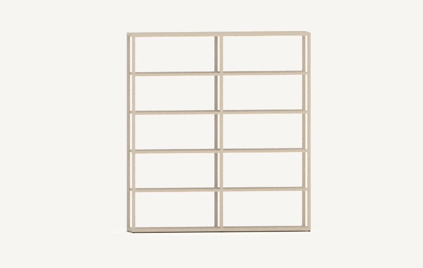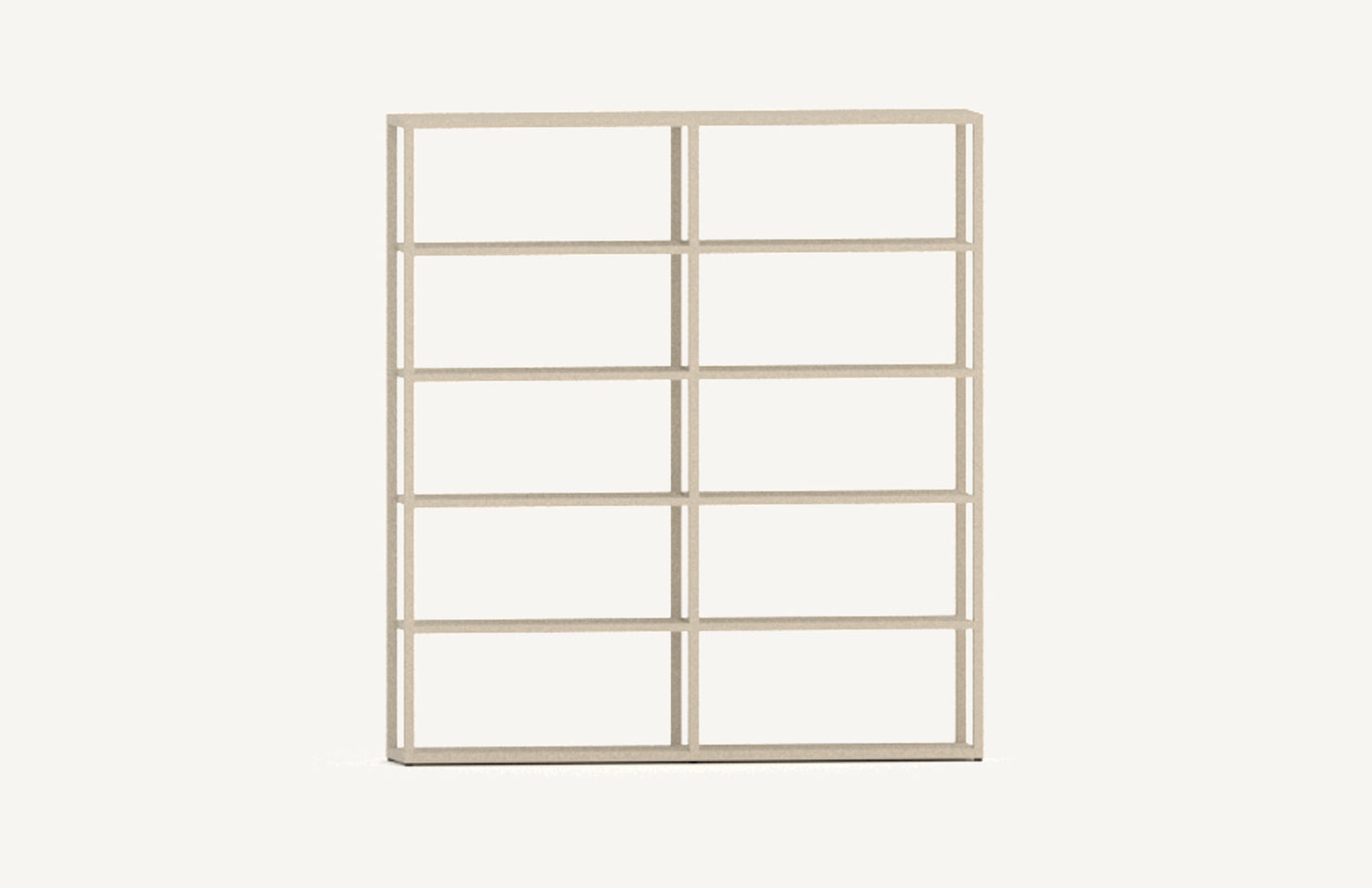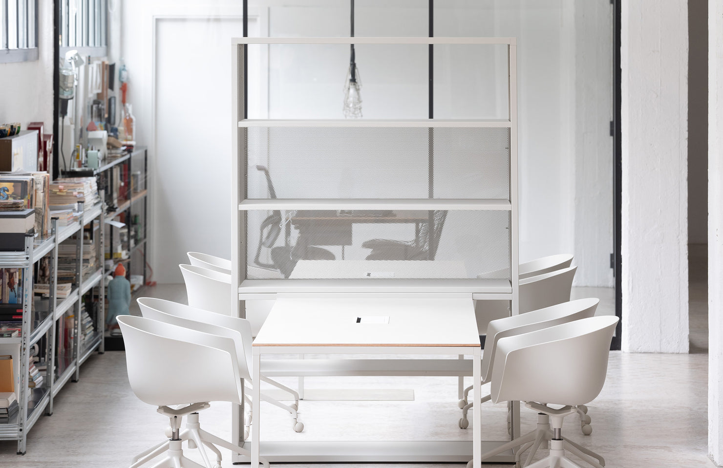 A beautifully minimal modular shelving system with endless options for customization and accessories, including planters, drawers, and ganging tables.