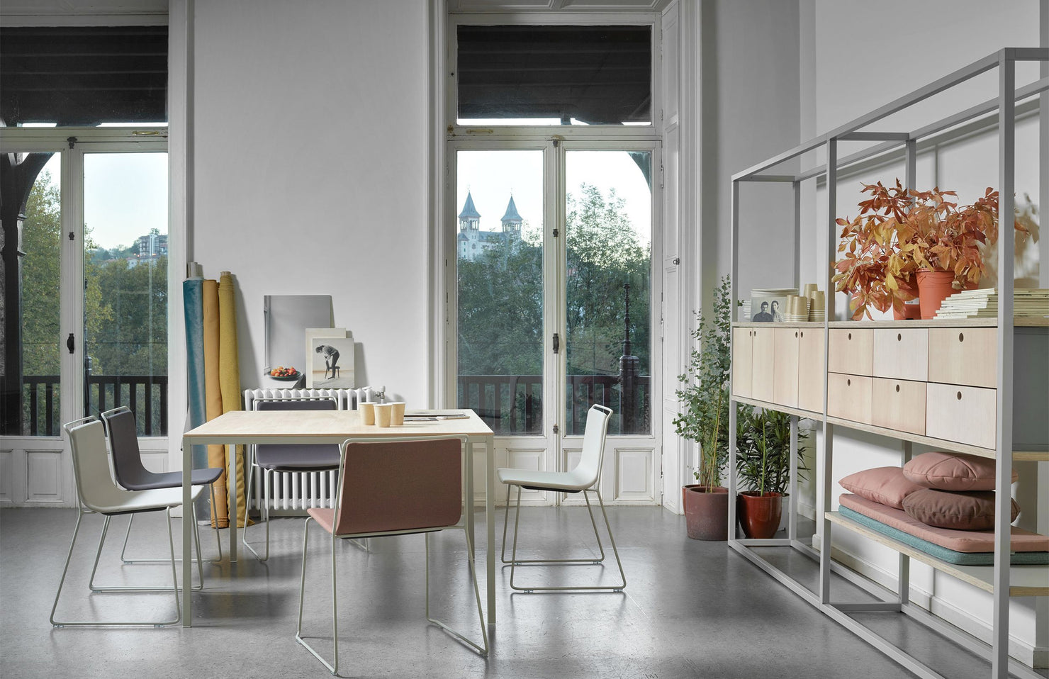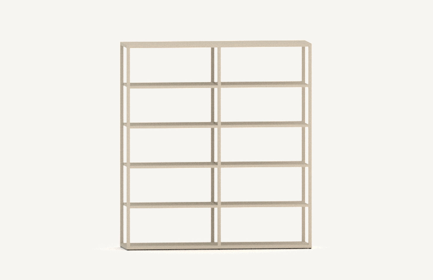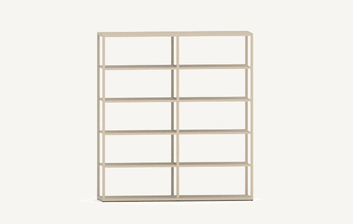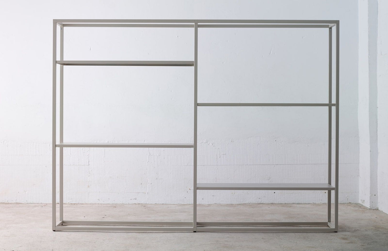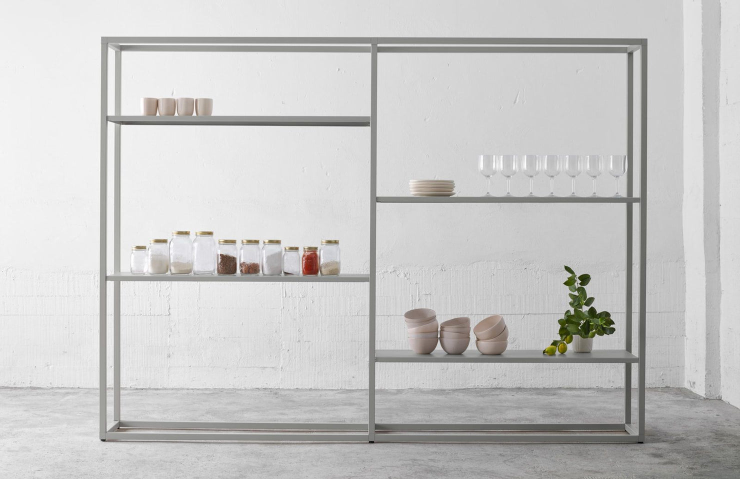 A beautifully minimal modular shelving system with endless options for customization and accessories, including planters, drawers, and ganging tables.