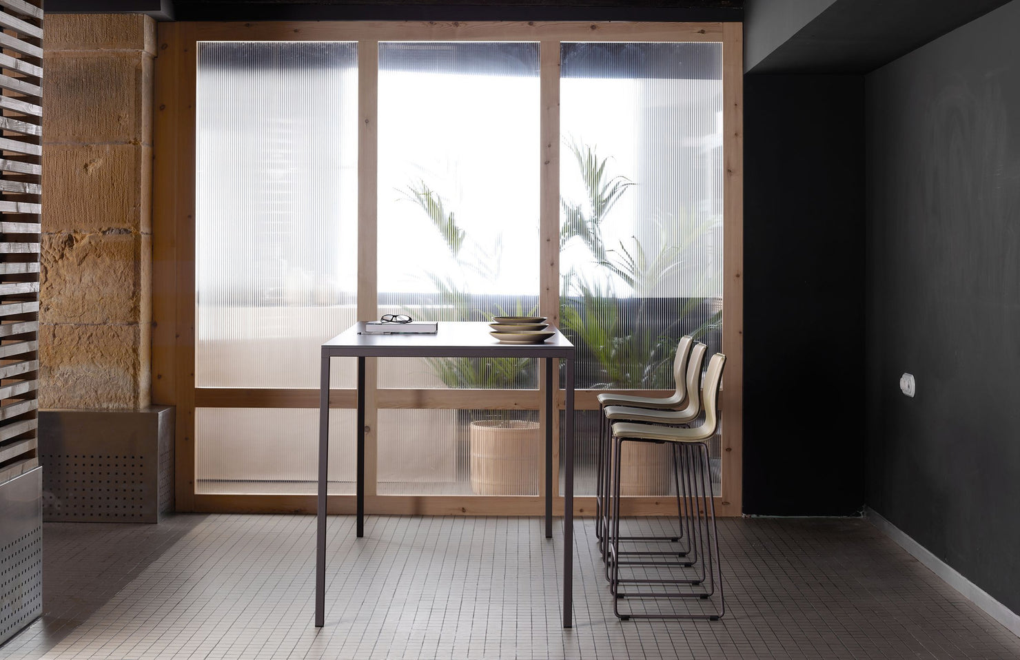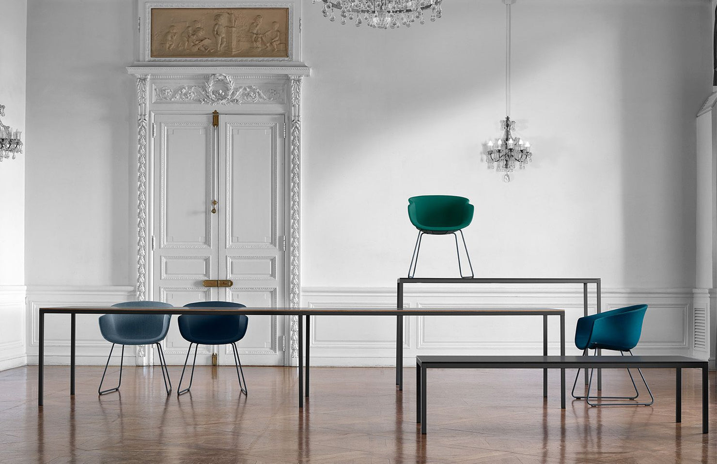 A minimal and sophisticated table design with numerous customization and sizing options, allowing for a cohesive design throughout a space.