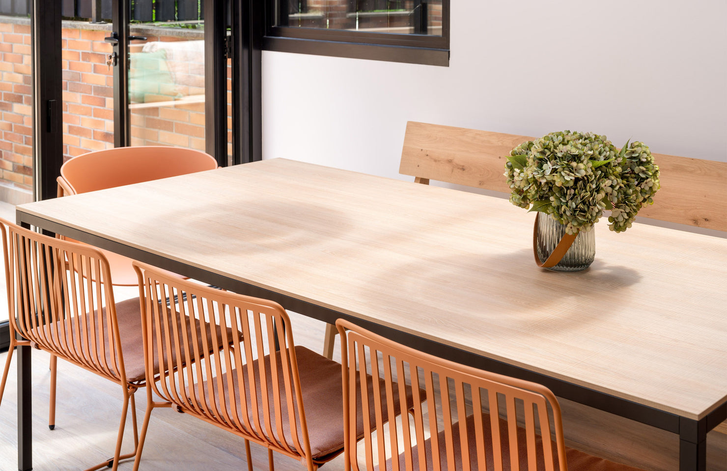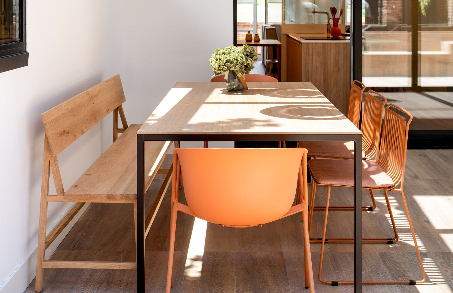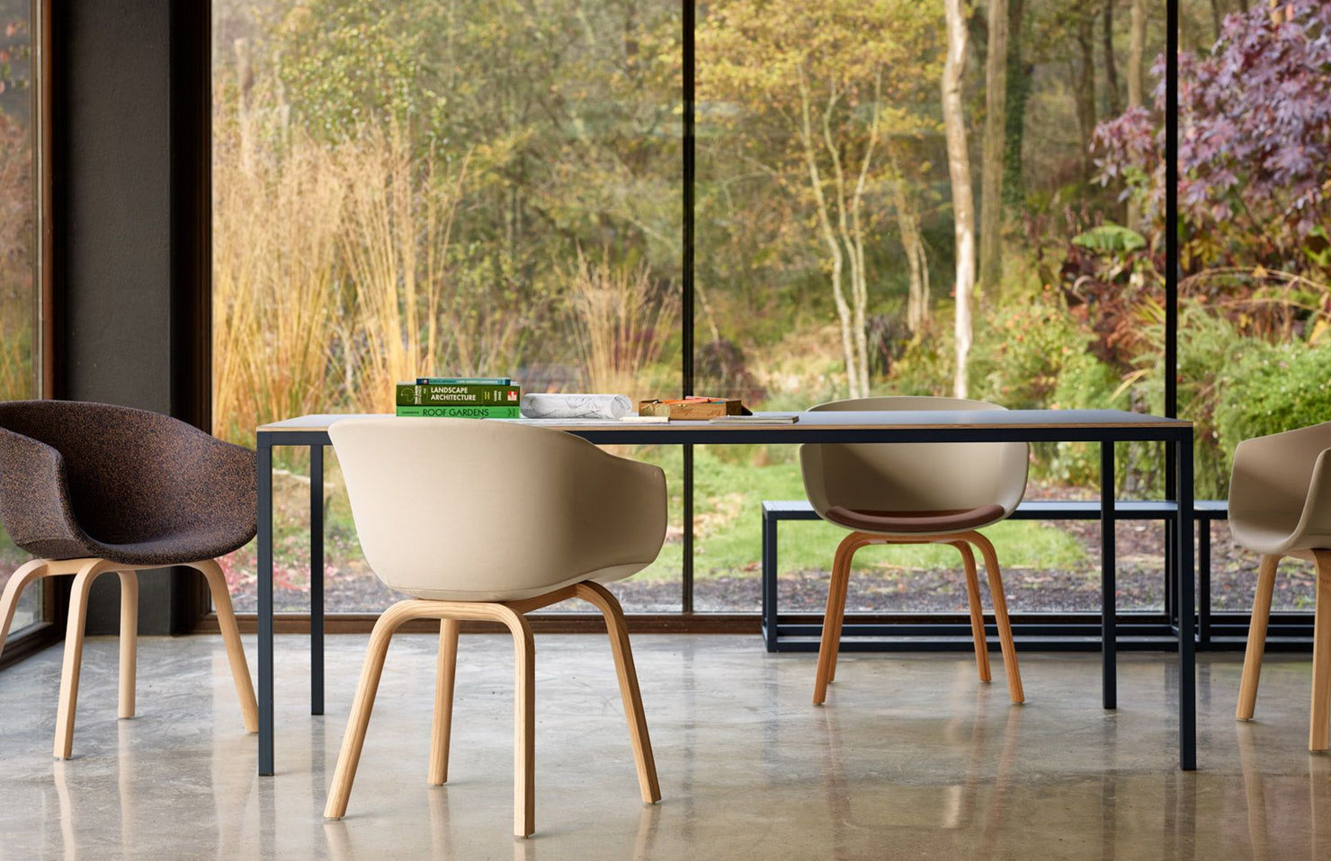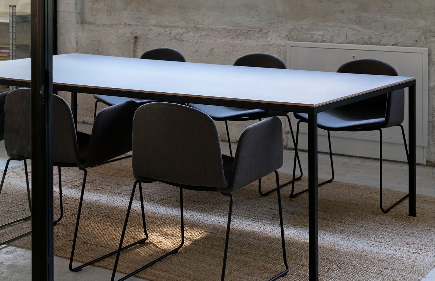 A minimal and sophisticated table design with numerous customization and sizing options, allowing for a cohesive design throughout a space.