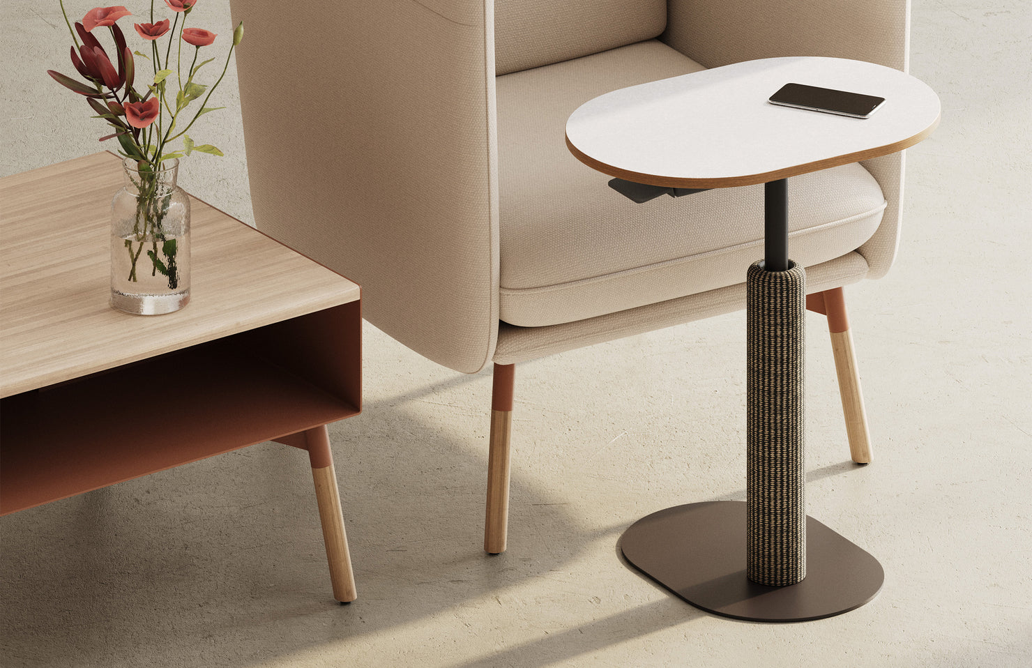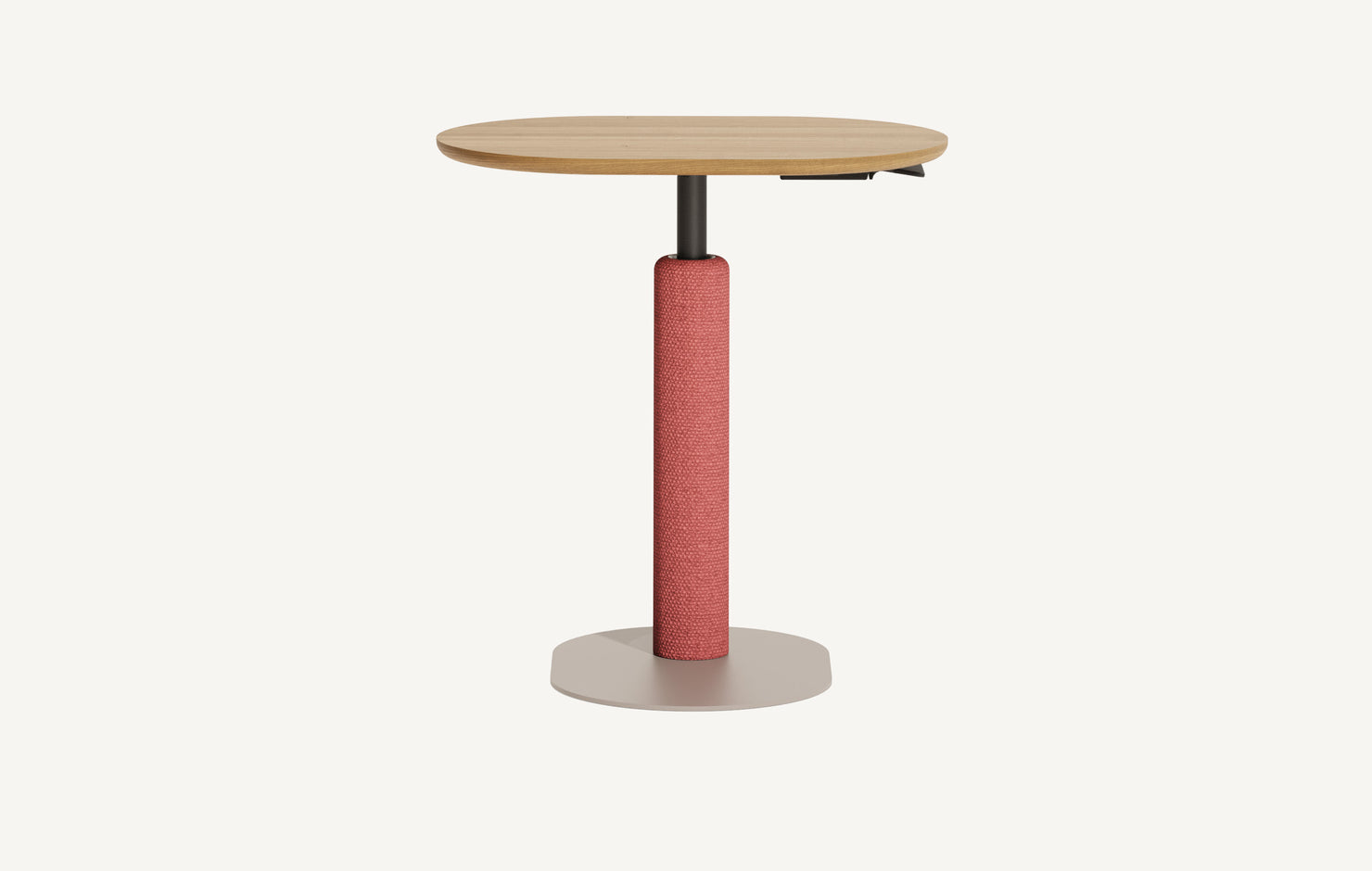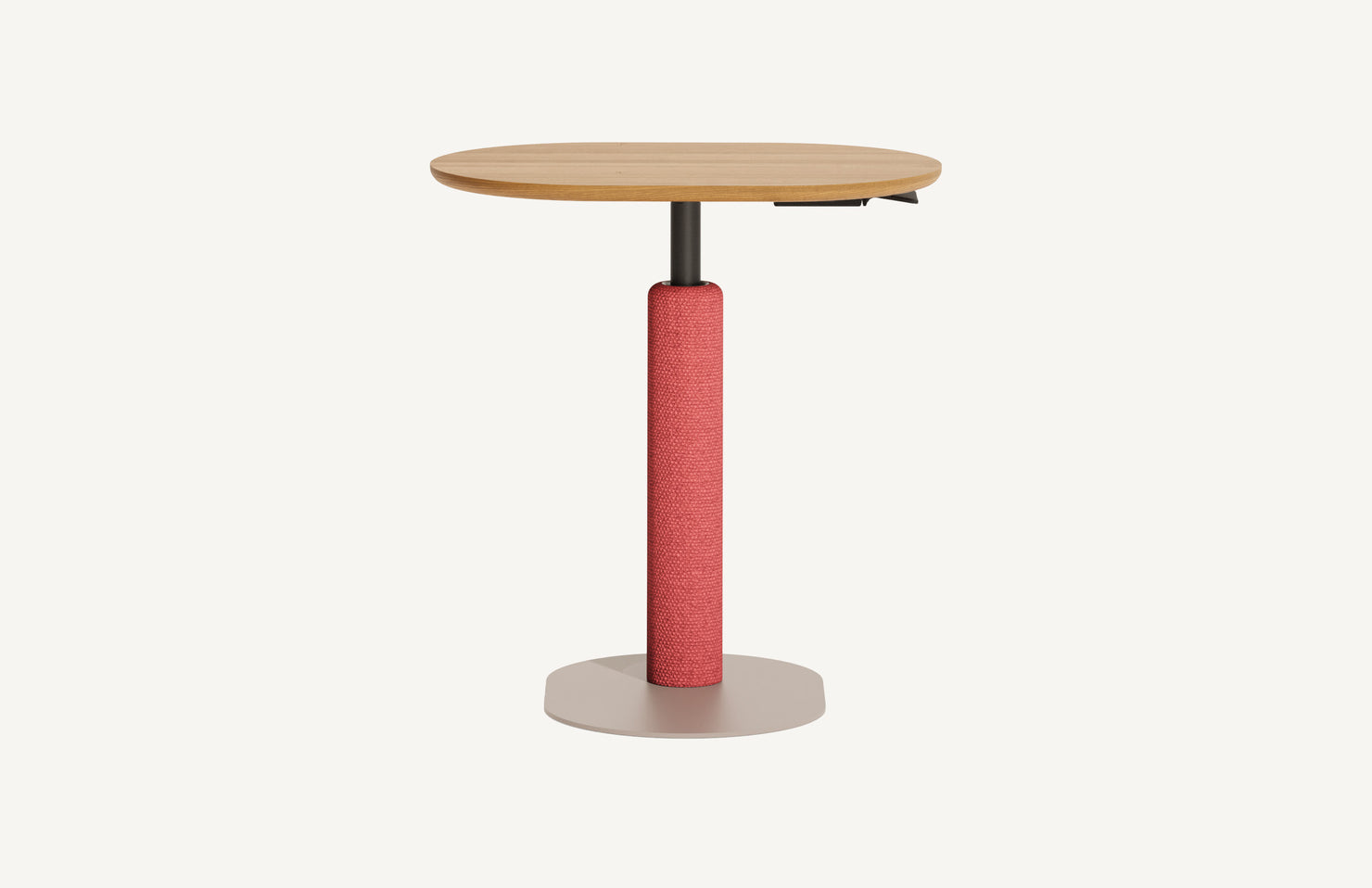 An adjustable-height laptop table with a playful upholstered sleeve and a pill-shaped base.