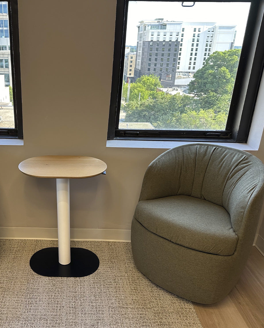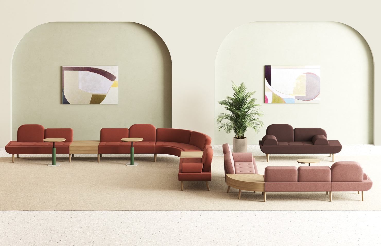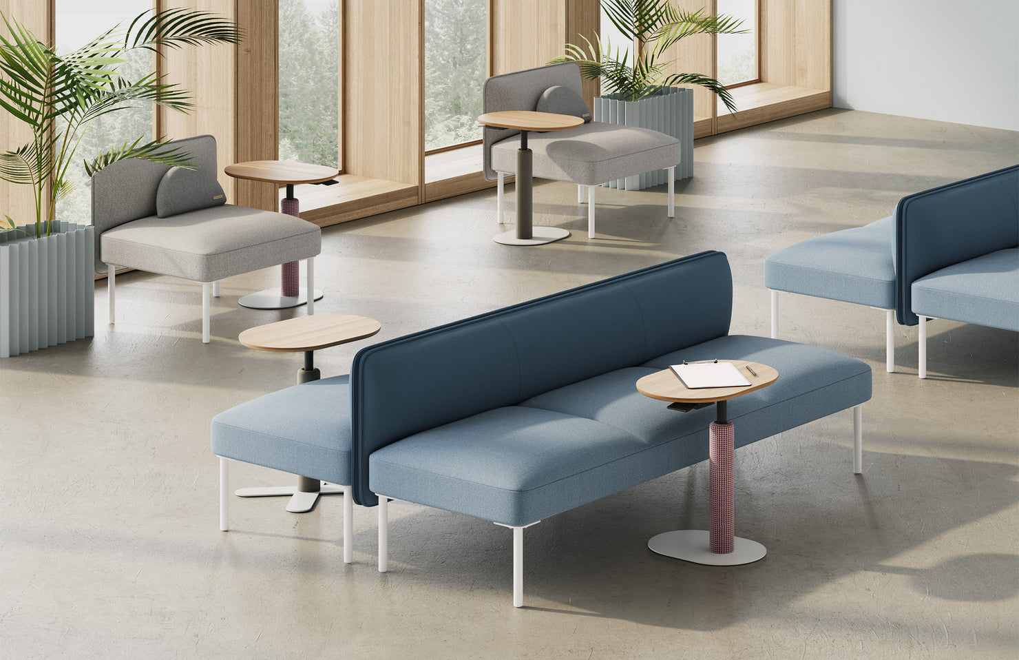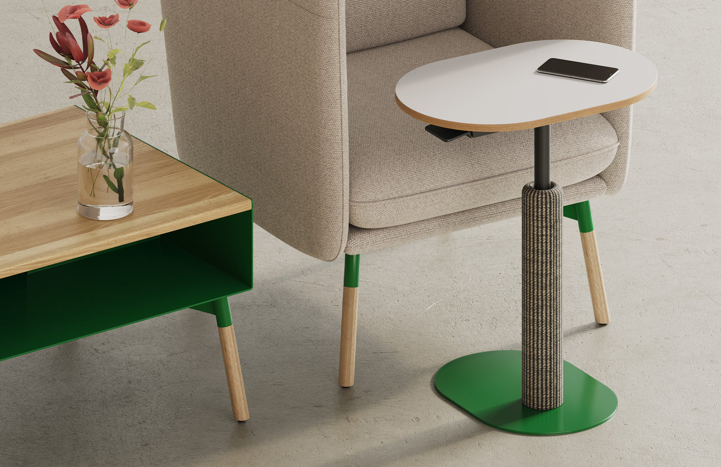 An adjustable-height laptop table with a playful upholstered sleeve and a pill-shaped base.