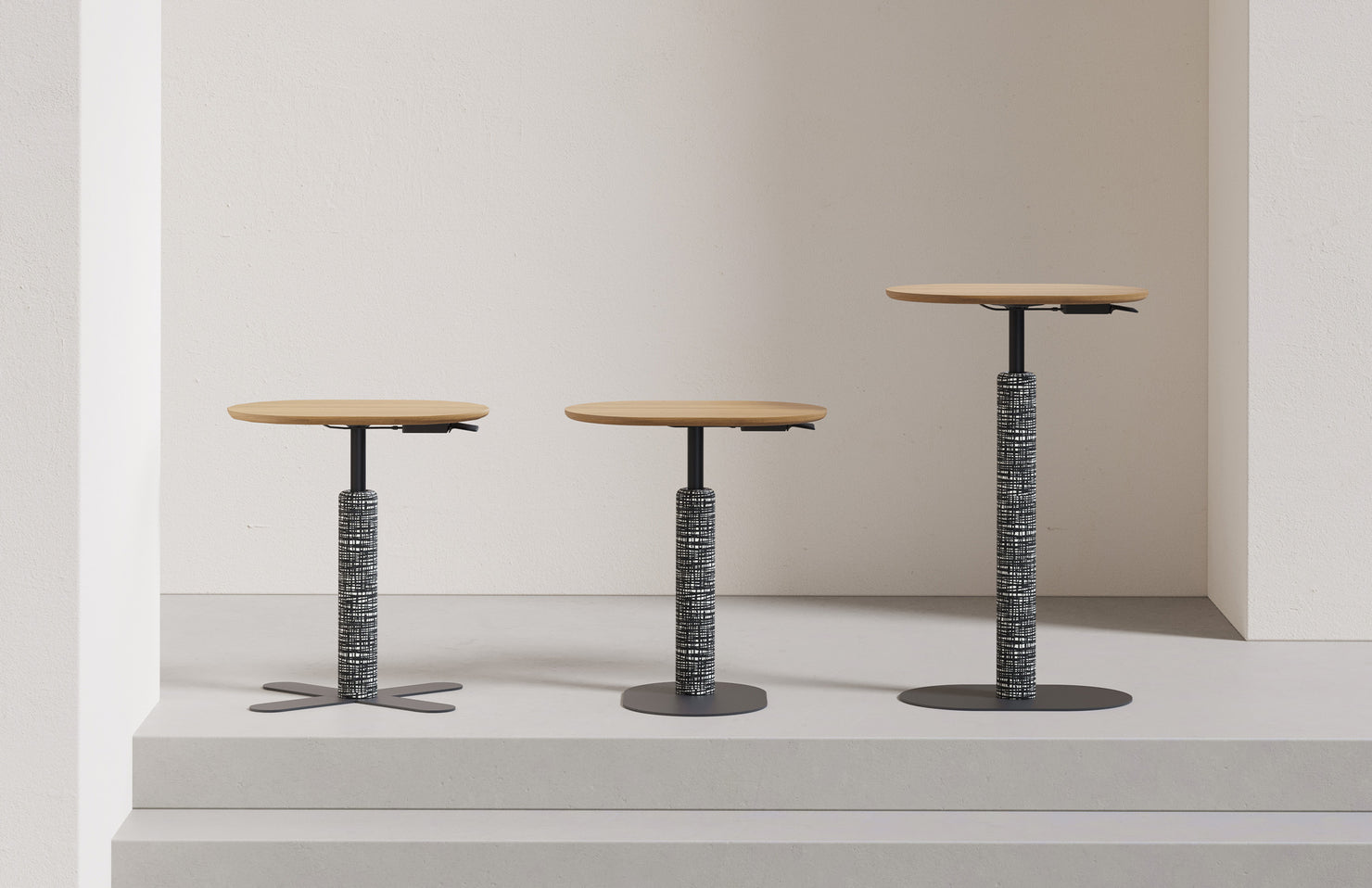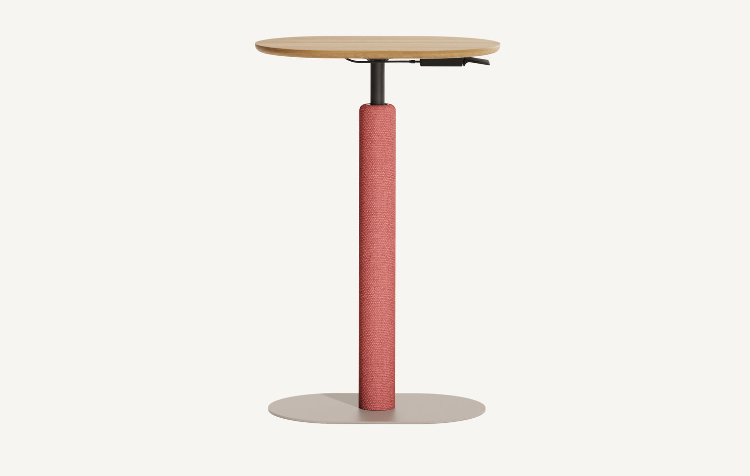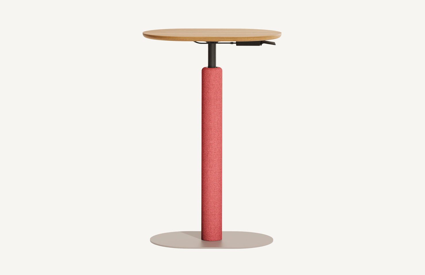 An adjustable-height table with a playful upholstered sleeve that allows a user to go from sitting to standing effortlessly.