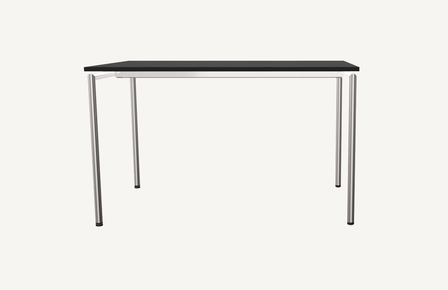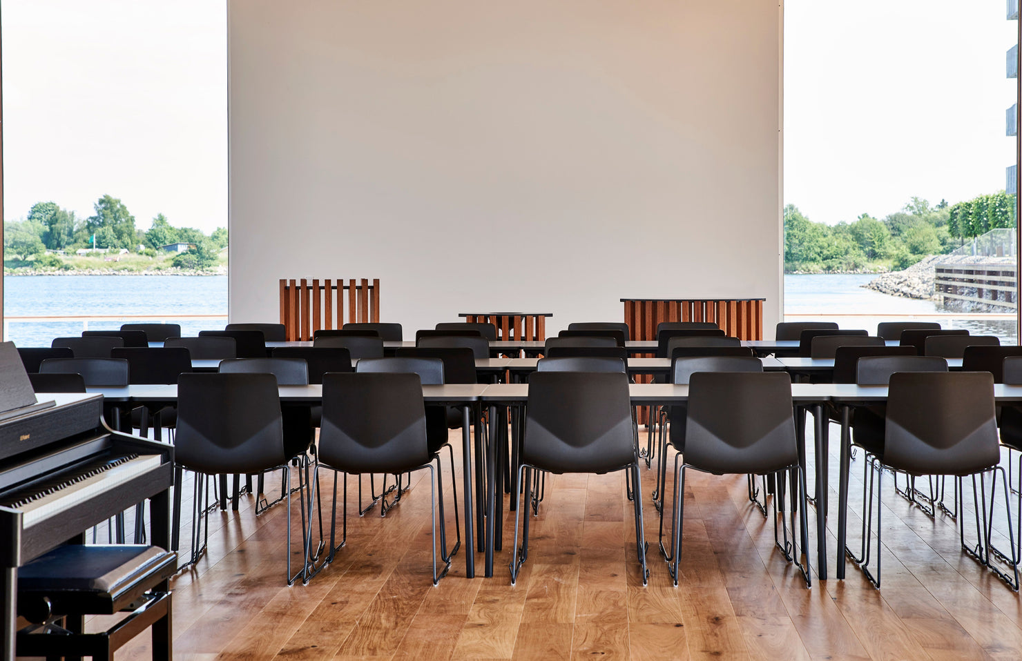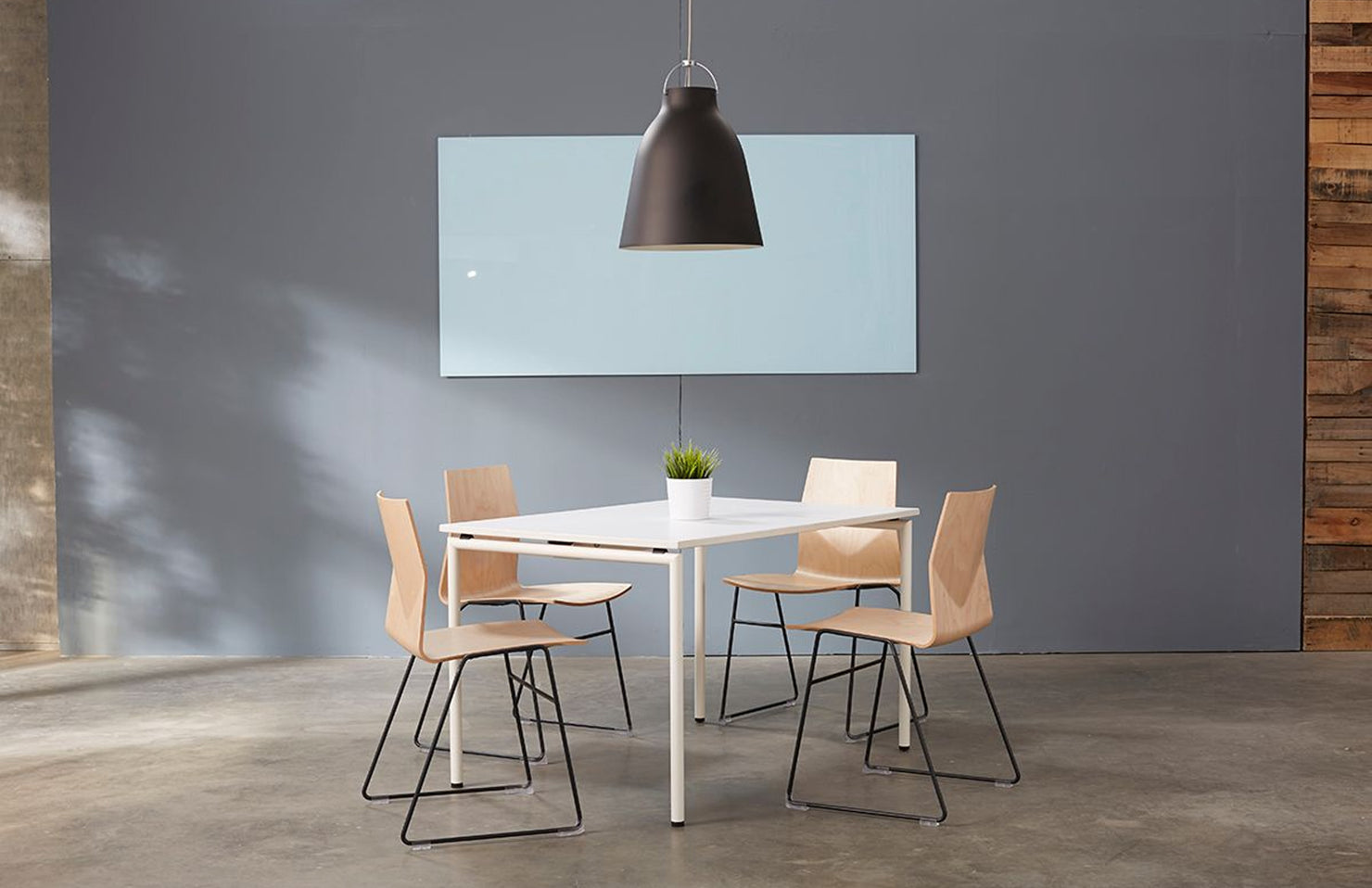 A durable folding table with hidden casters and optional chair suspension tracks for easy cleaning.
