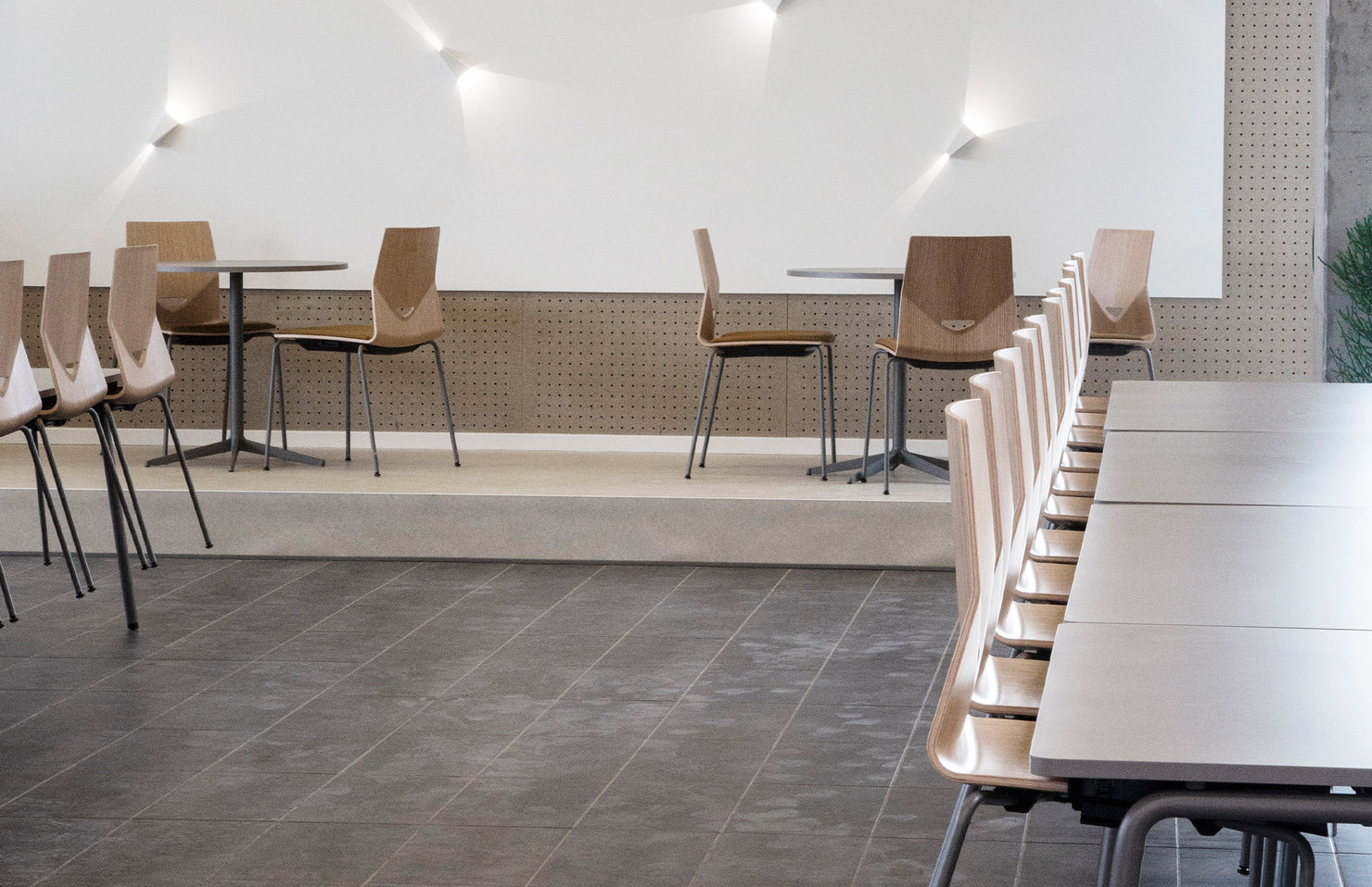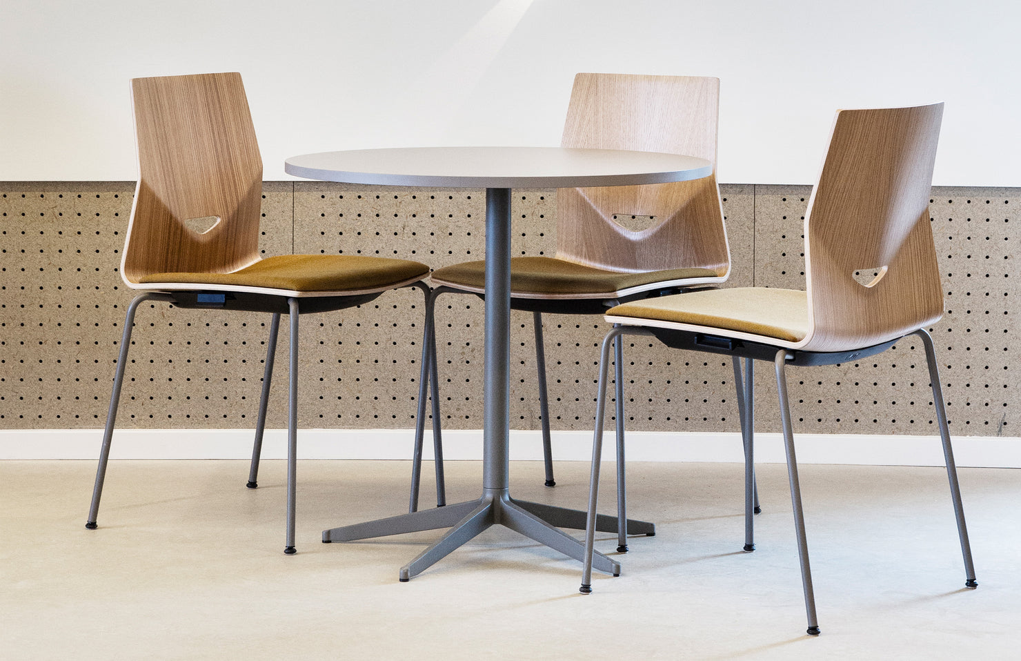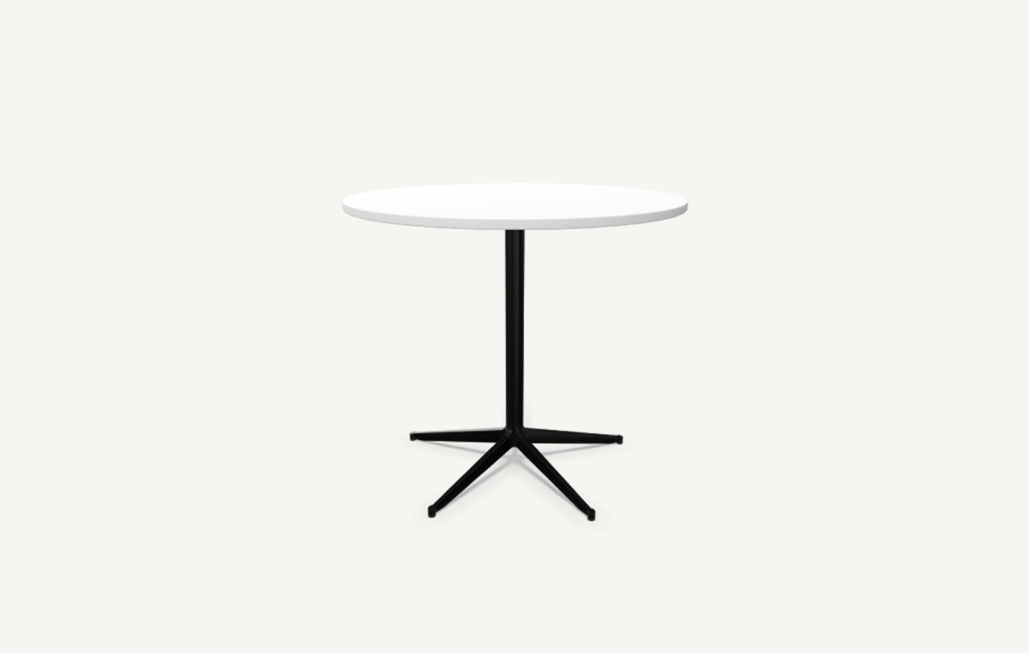 A functional pedestal table with a clean, modern design aesthetic and clever details.