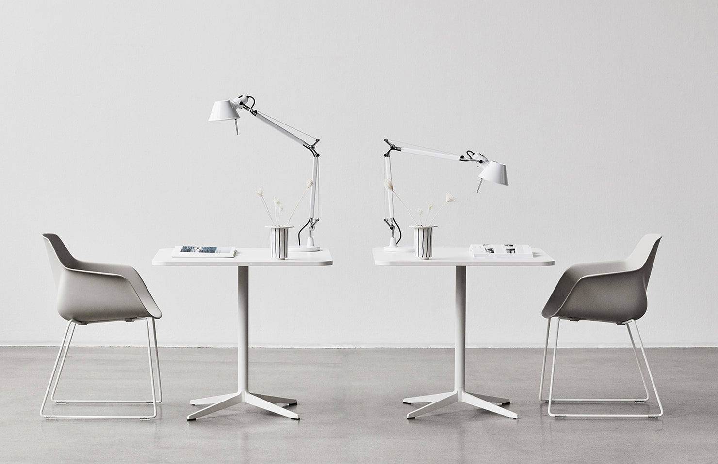 A functional pedestal table with a clean, modern design aesthetic and clever details.