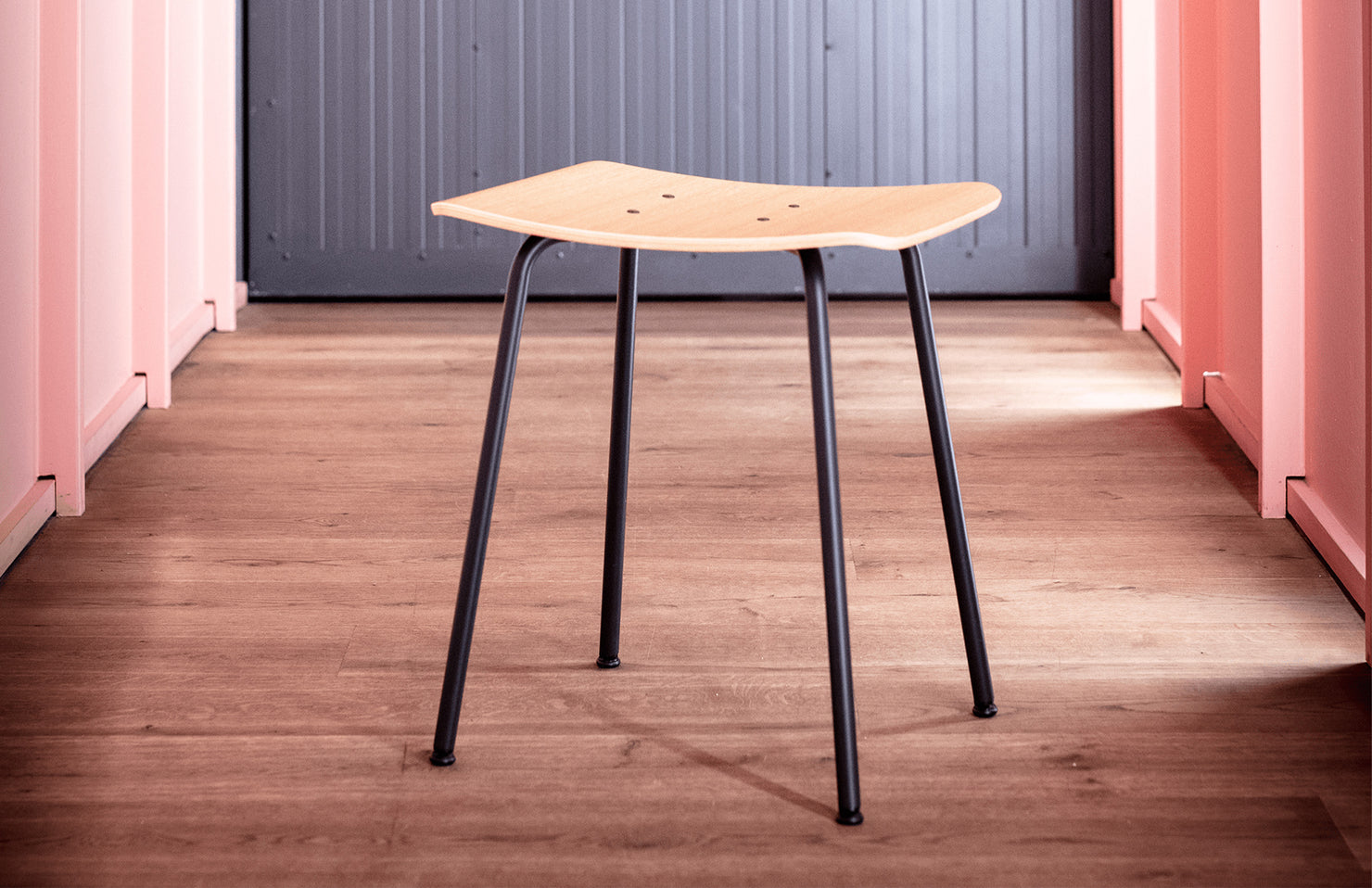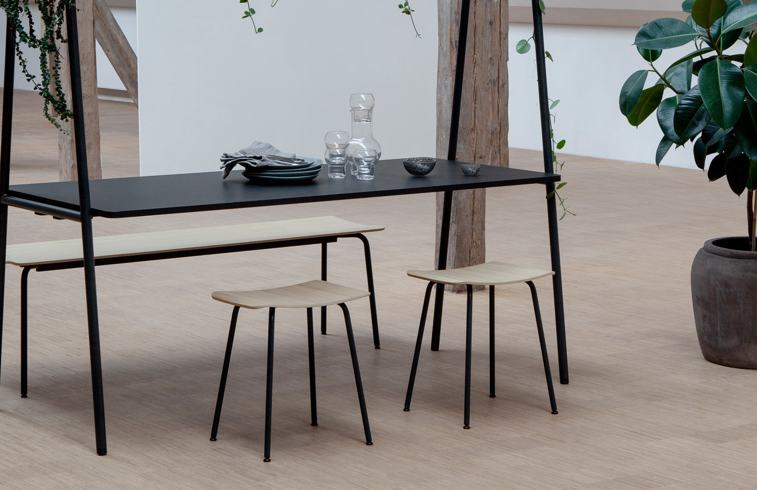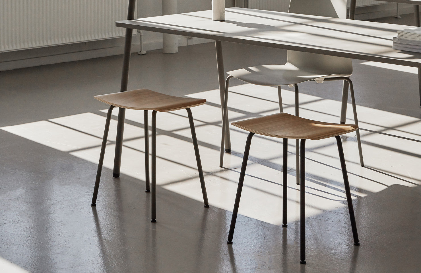 Designed with bent oak seats and tubular steel frames, Four Stool is the perfect minimal companion to Four Design Tables.