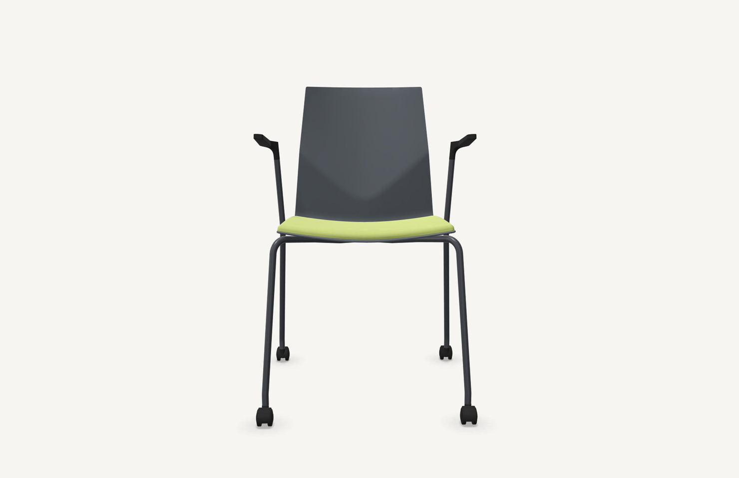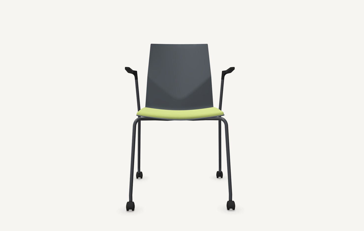 Known for its versatility, durability, and comfort, the FourCast collection can be specified in endless ways and for any type of public setting. Featured here with a 4-leg caster base and polypropylene shell, seat pad, and arms.
