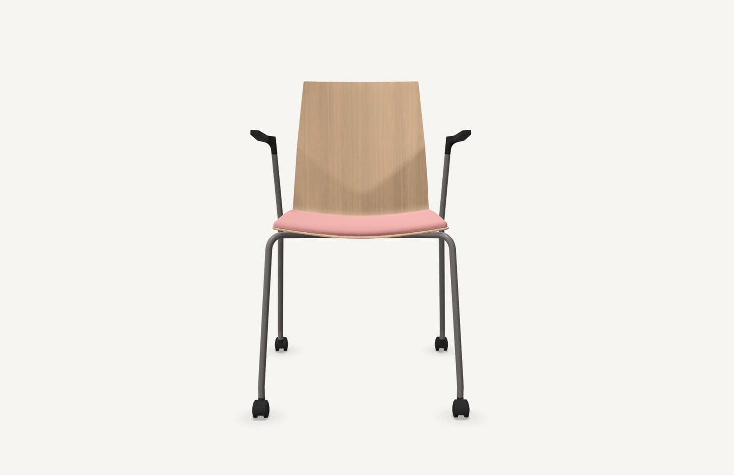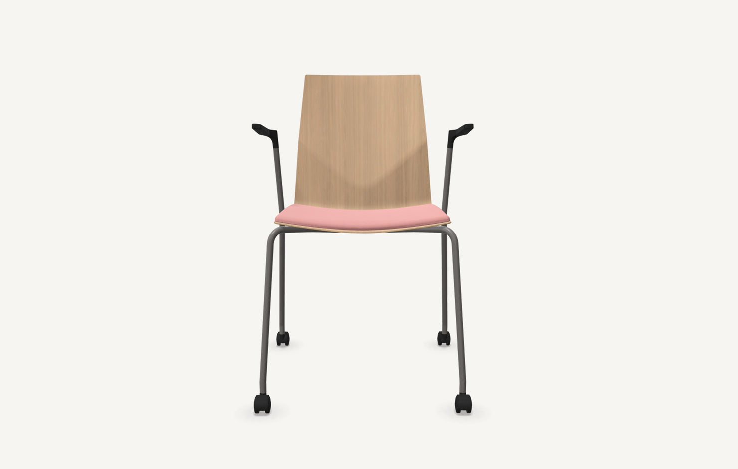 Known for its versatility, durability, and comfort, the FourCast collection can be specified in endless ways and for any type of public setting. Featured here with a 4-leg caster base, bentwood shell with seat pad, and arms.