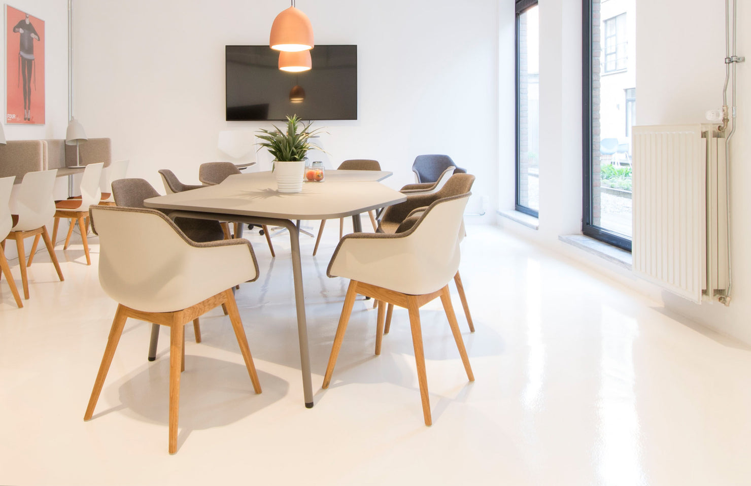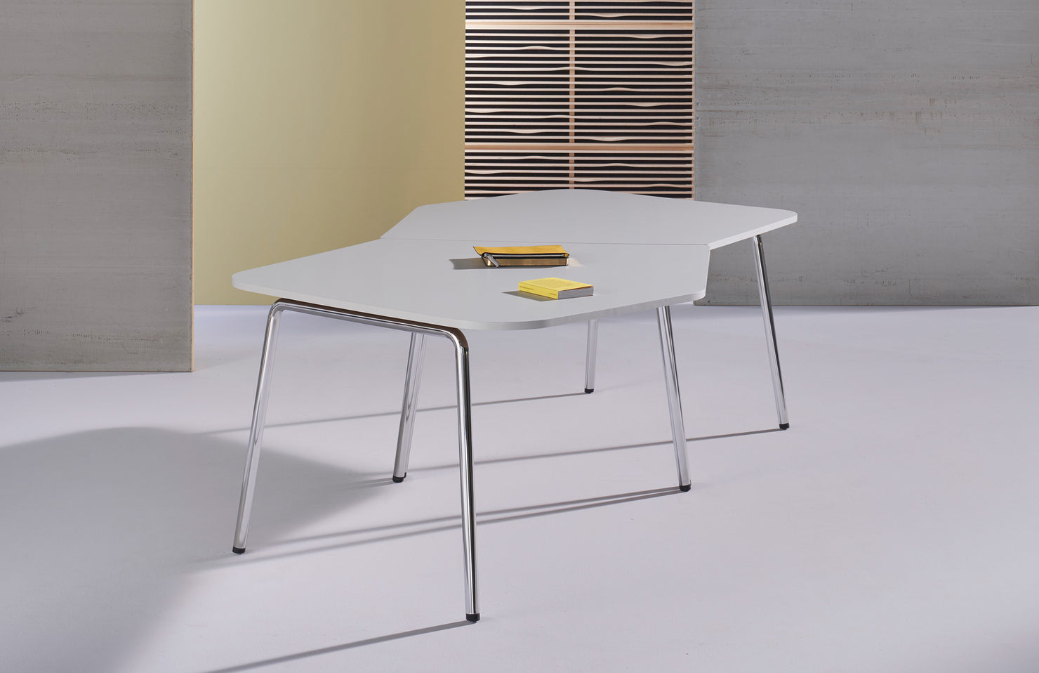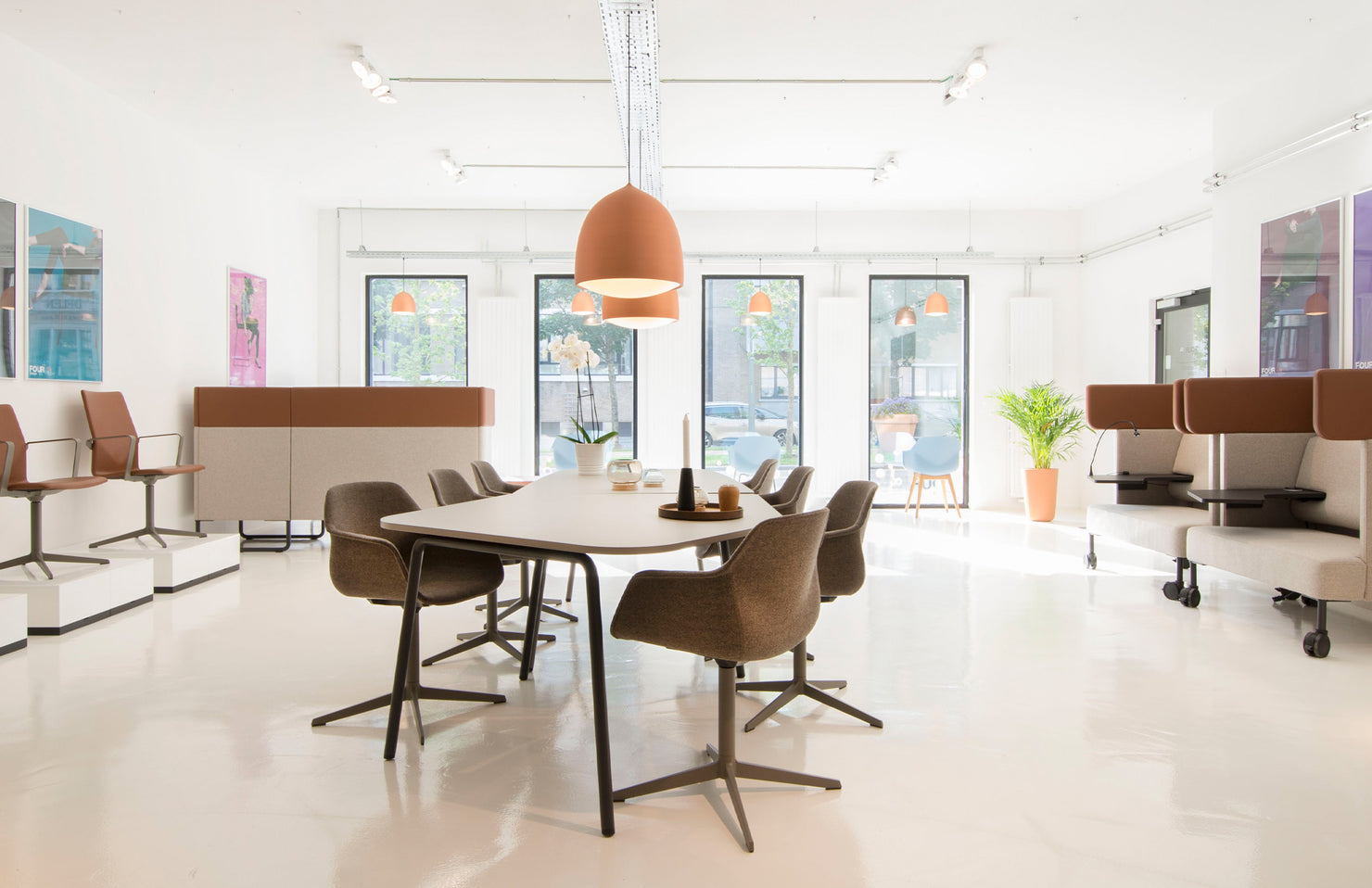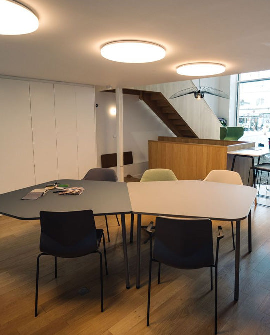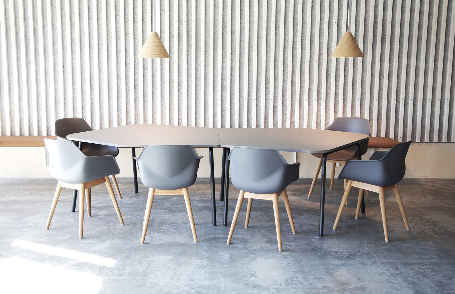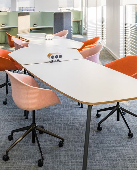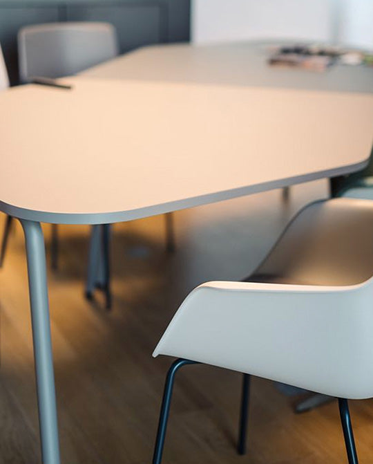 An organic shape allows more comfortable, roomier seating than many traditionally straight-angled conference tables.