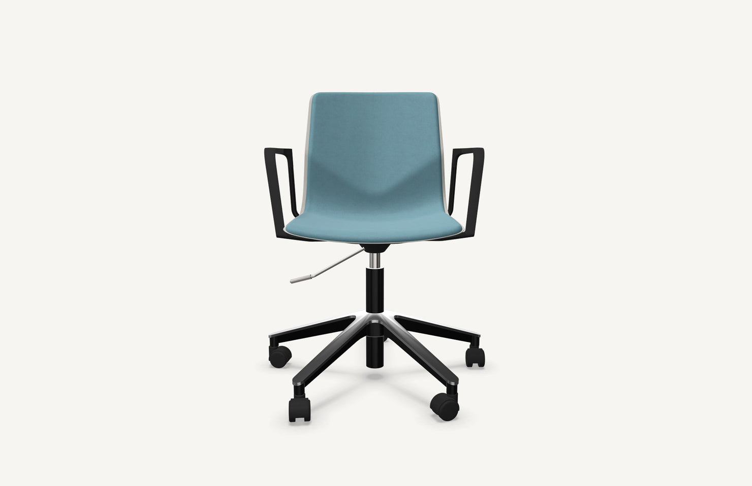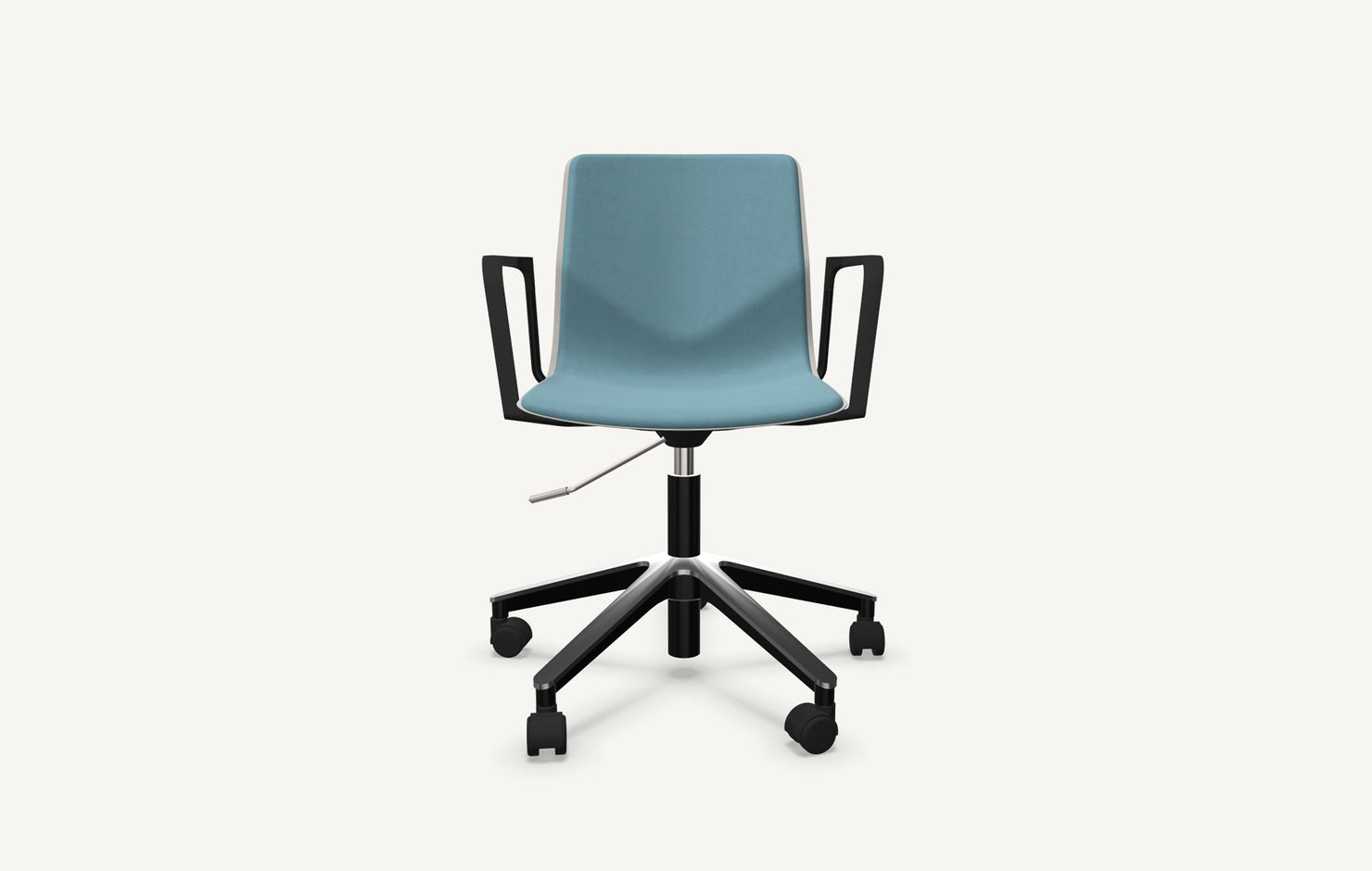 FourSure® has a durable seat shell with a generous seat and organic curves. Featured here with a swiveling wheeler base, polypropylene shell with an upholstered interior, and arms.