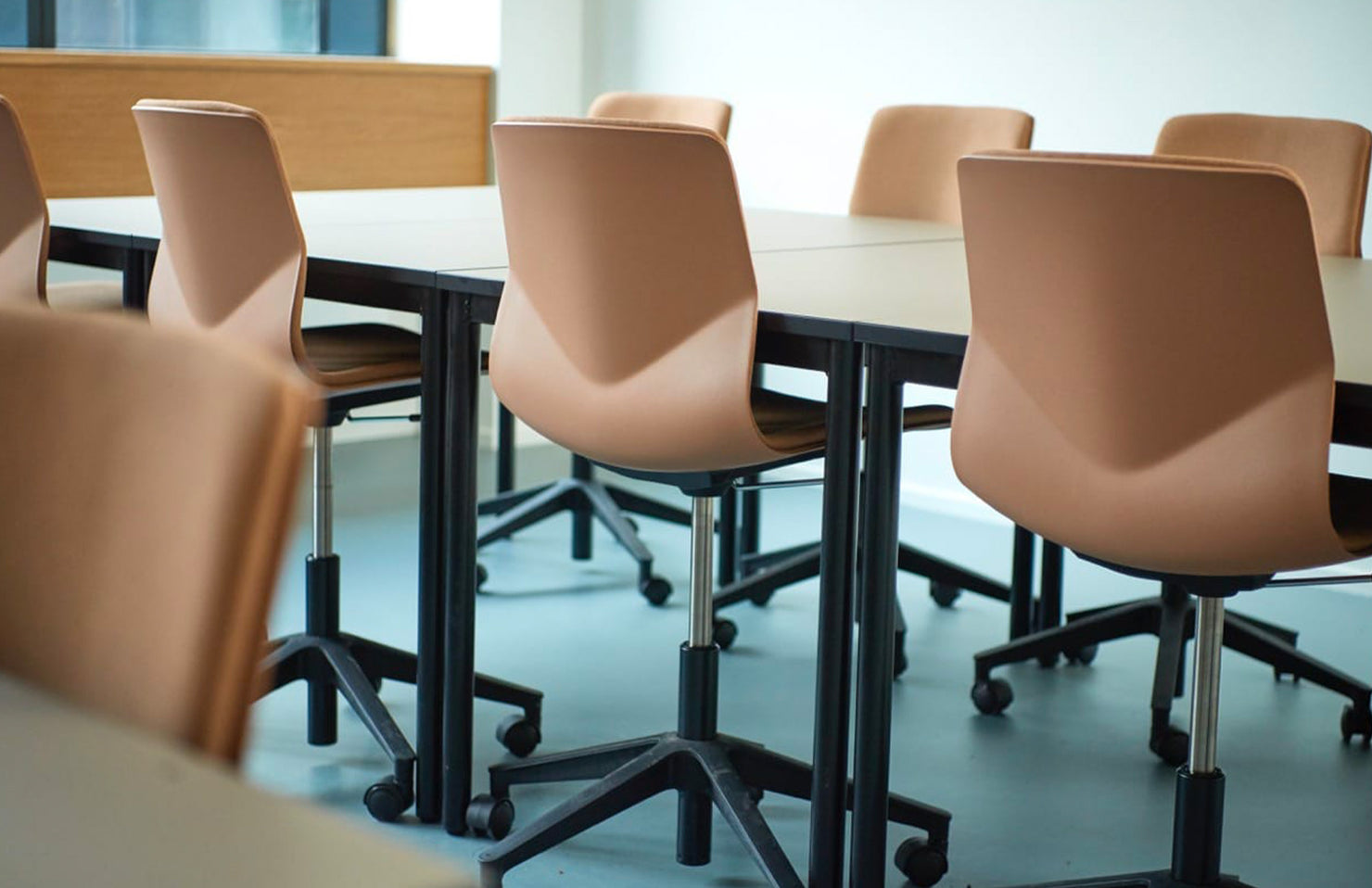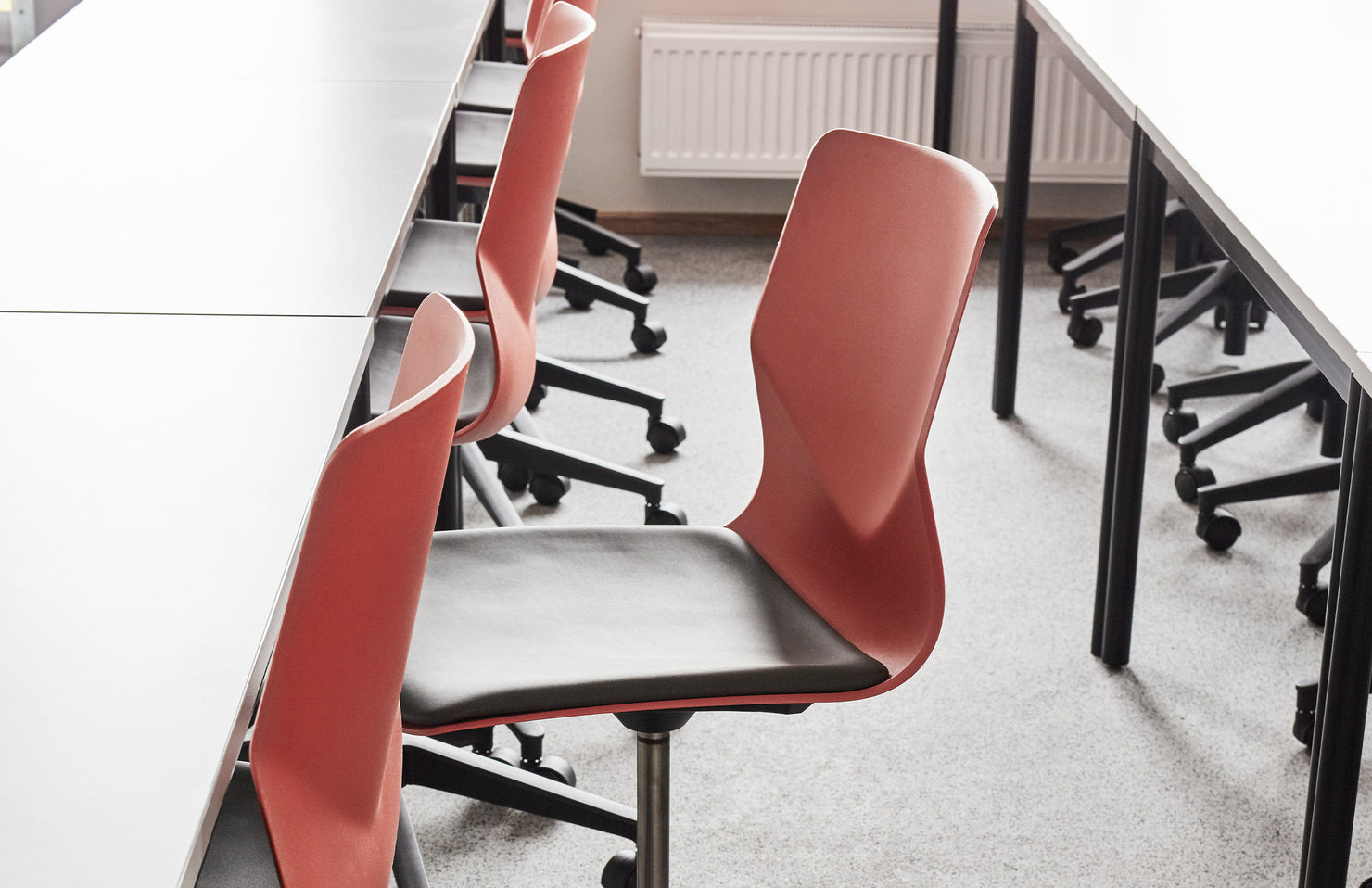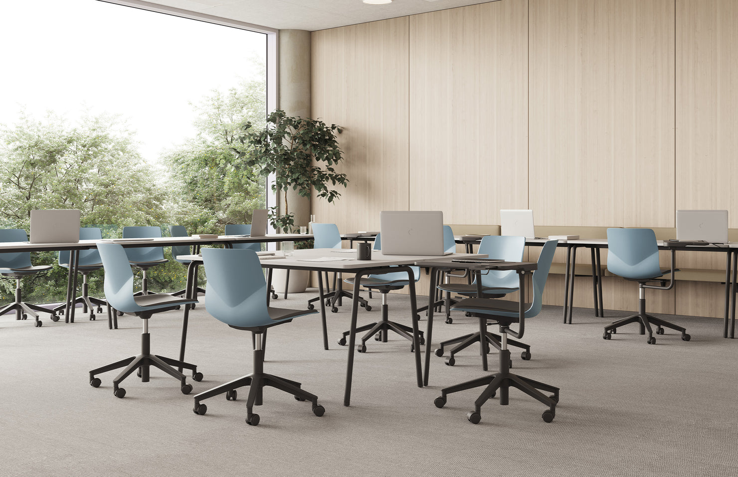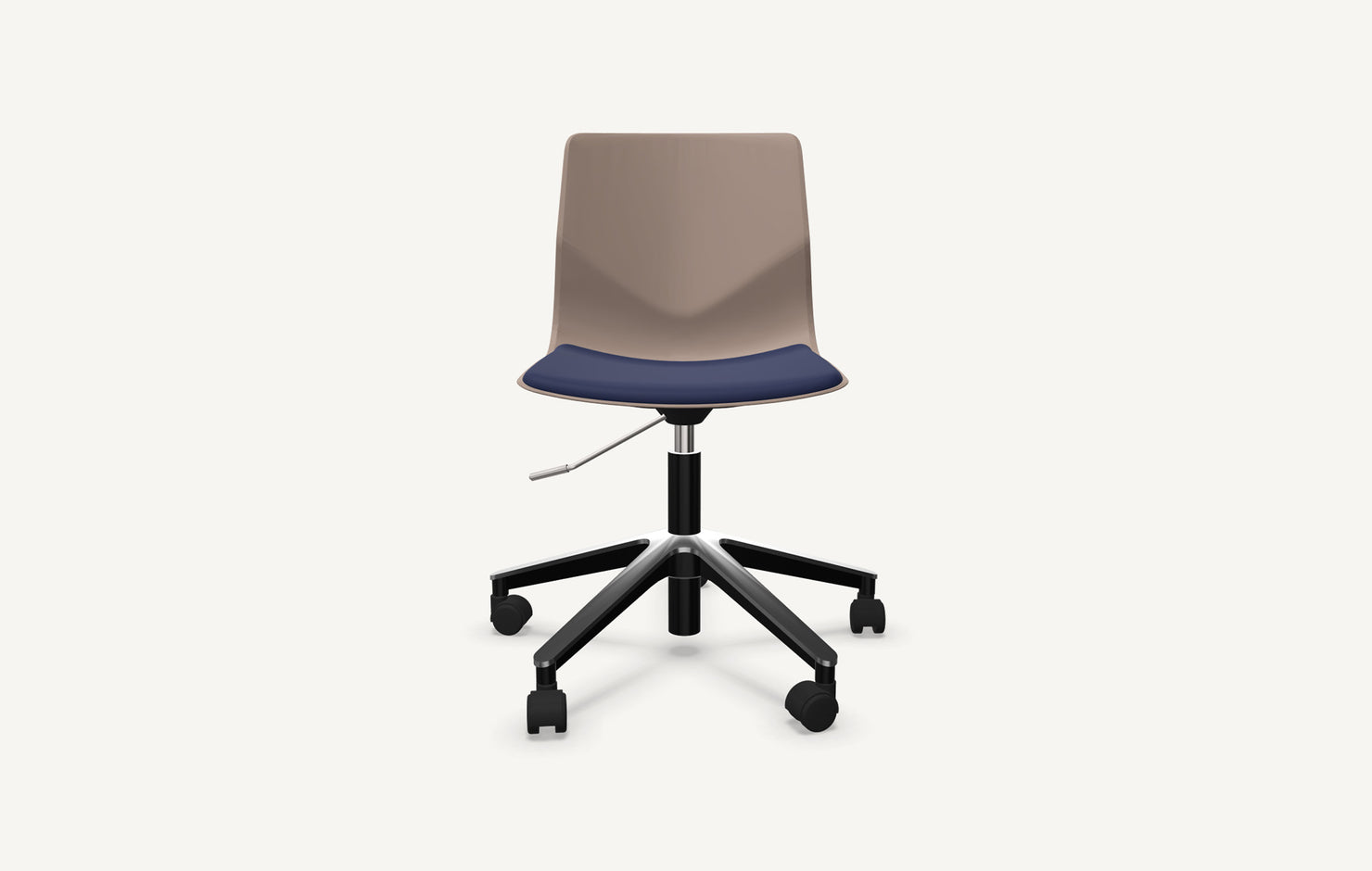 FourSure® has a durable seat shell with a generous seat and organic curves. Featured here with a swiveling wheeler base and polypropylene shell with an upholstered seat pad.