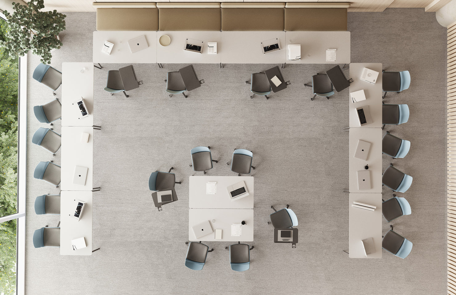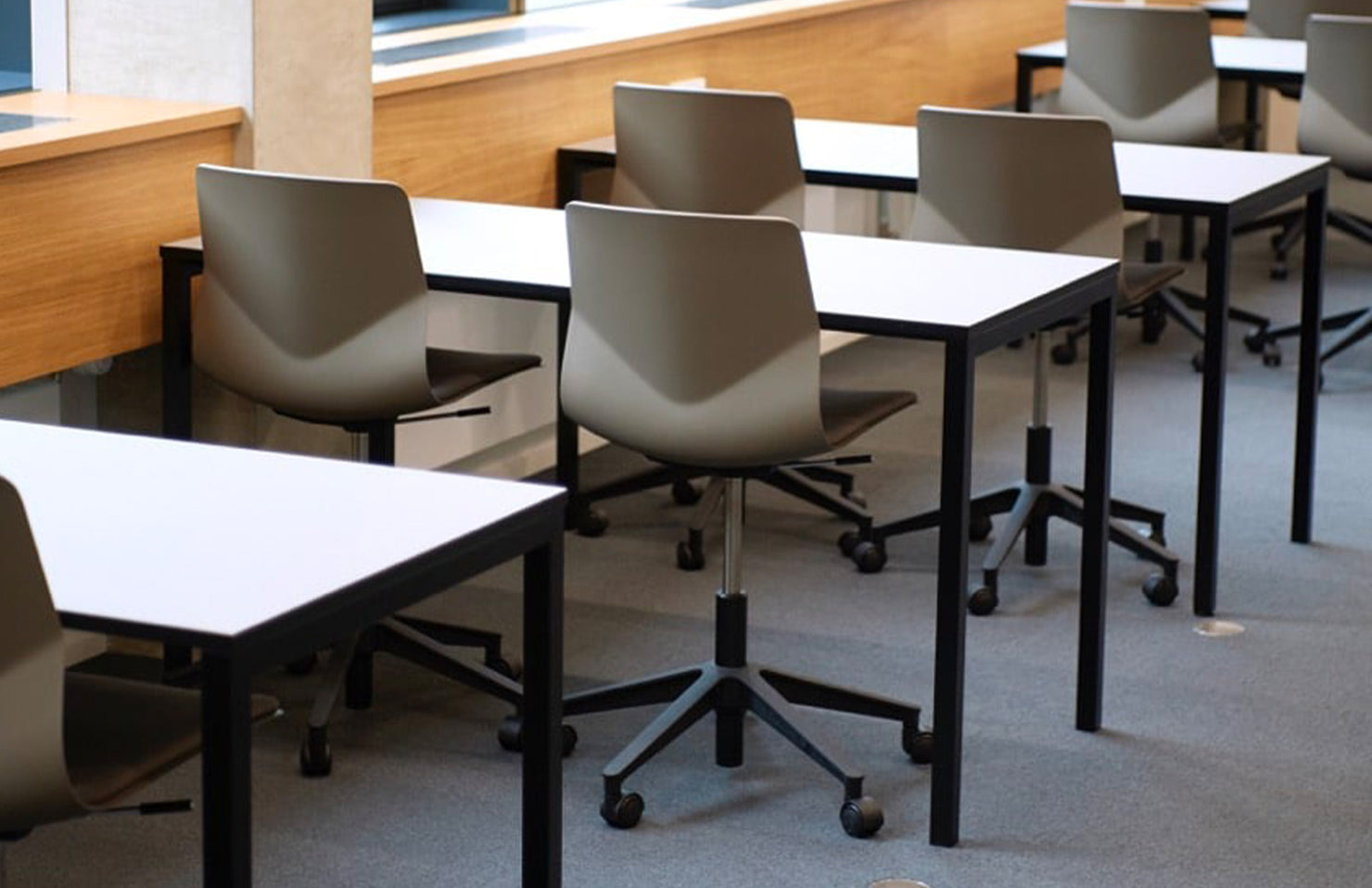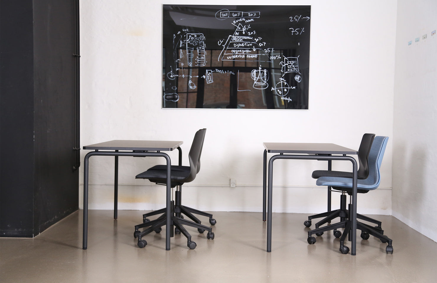 FourSure® has a durable seat shell with a generous seat and organic curves. Featured here with a swiveling wheeler base and polypropylene shell with an upholstered seat pad.