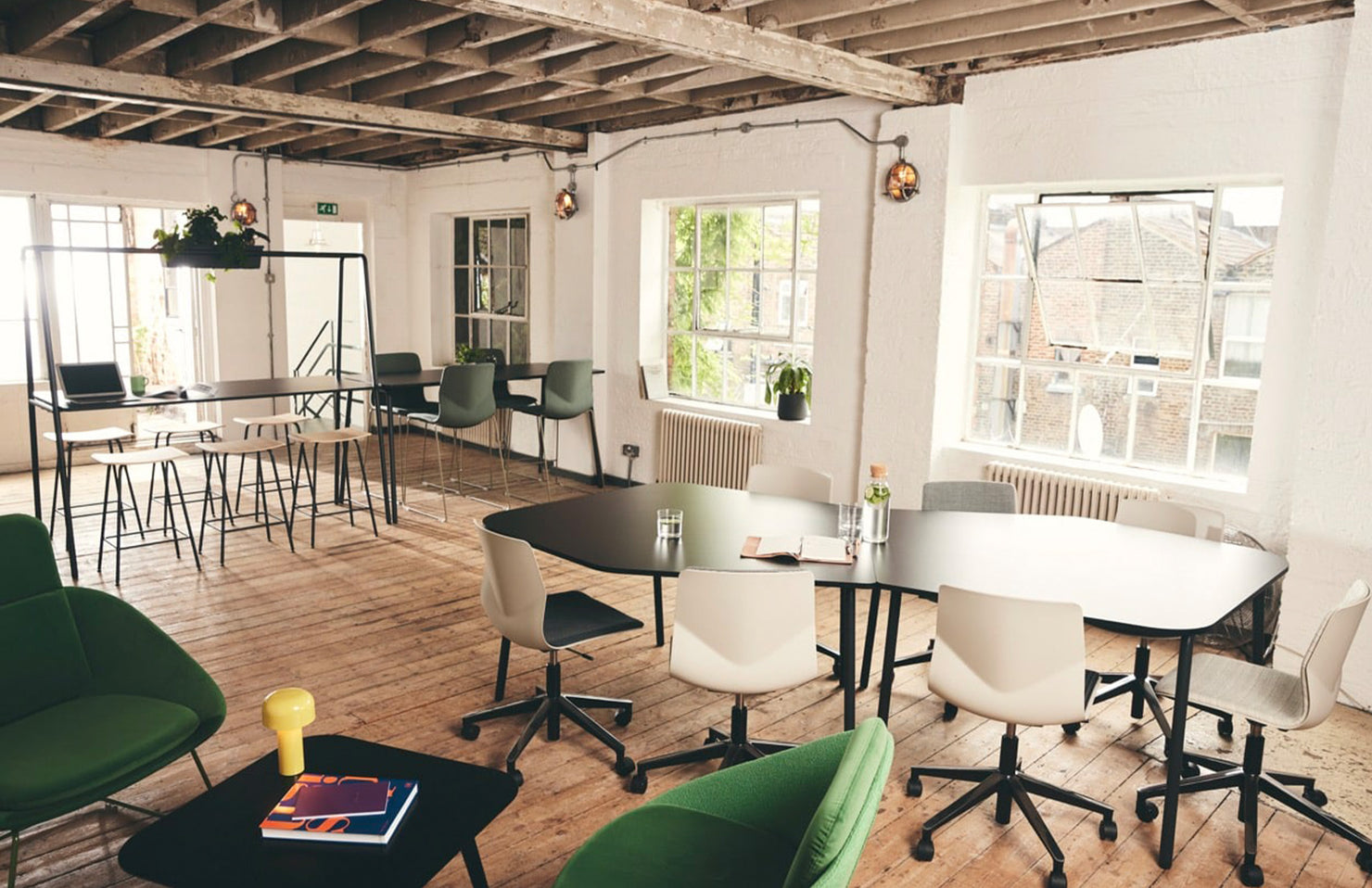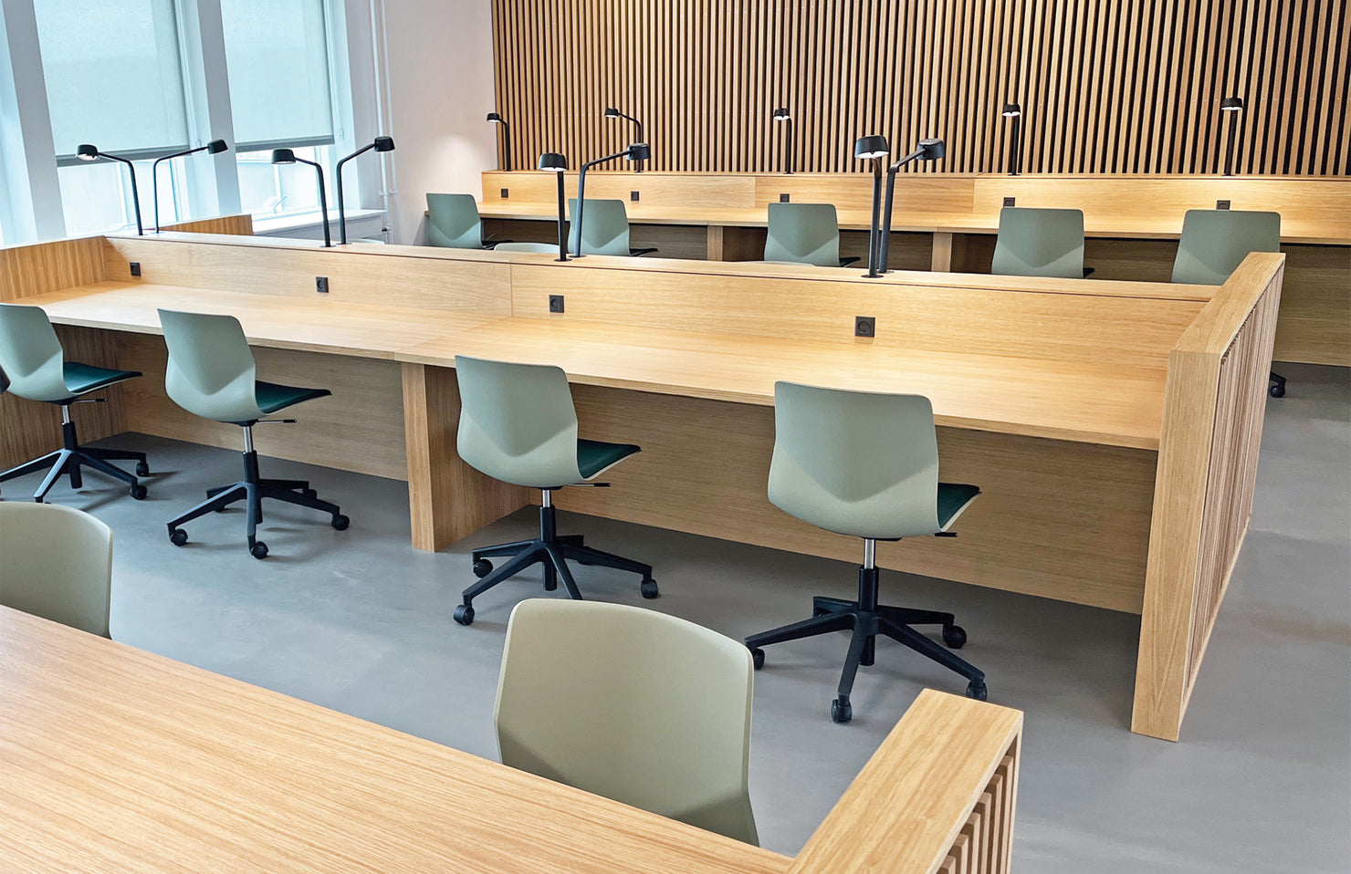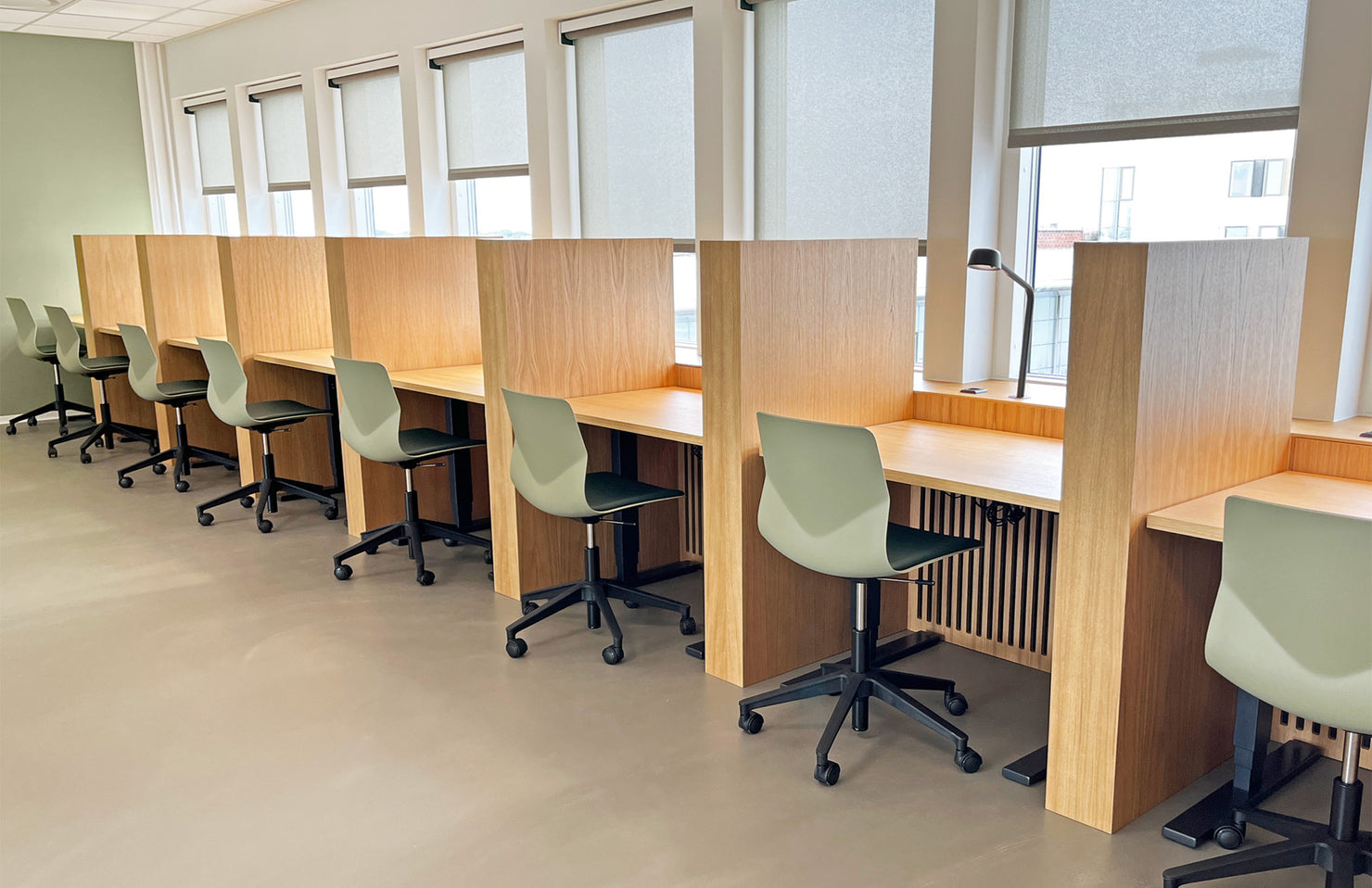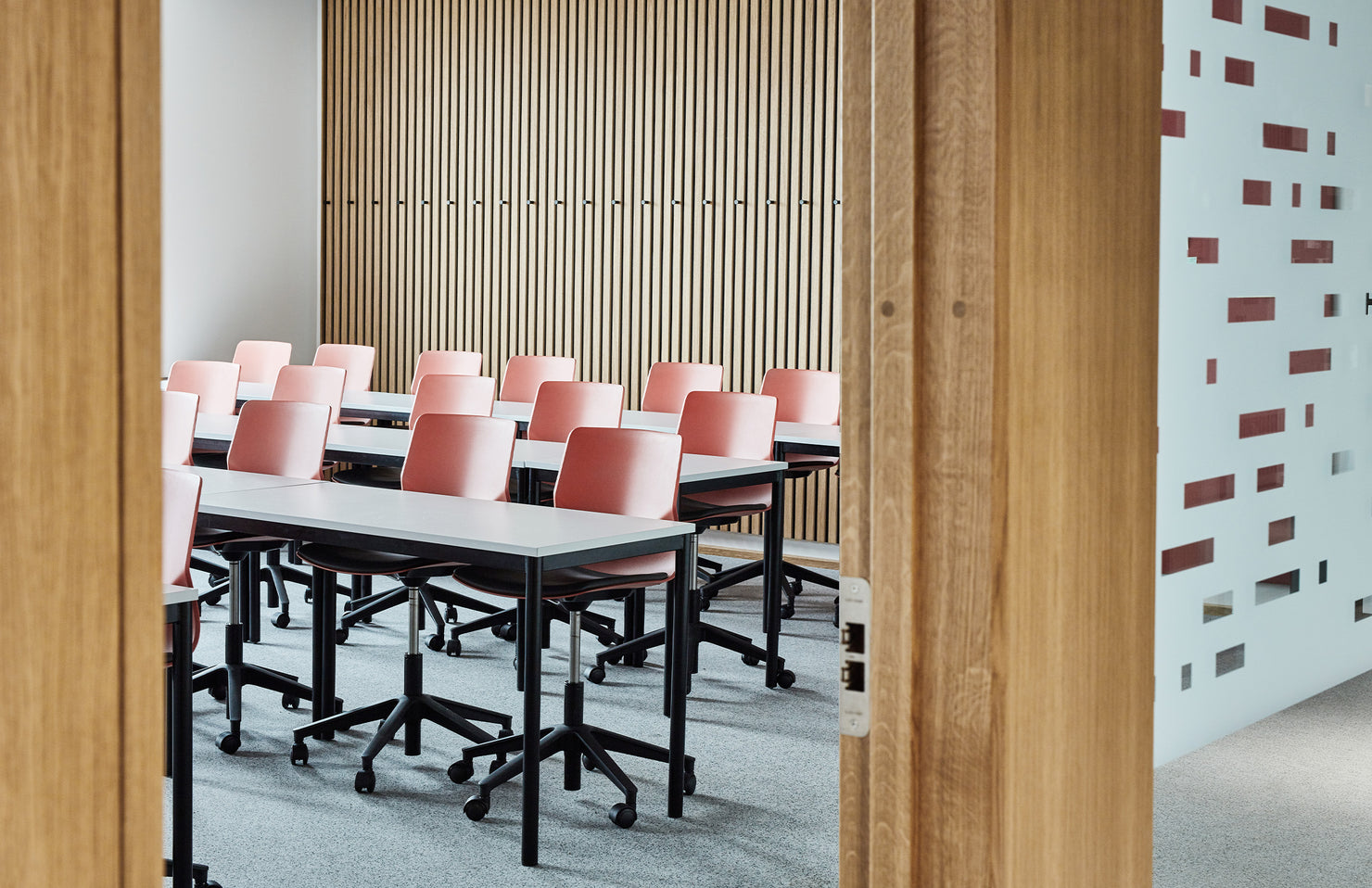 FourSure® has a durable seat shell with a generous seat and organic curves. Featured here with a swiveling wheeler base and polypropylene shell with an upholstered seat pad.