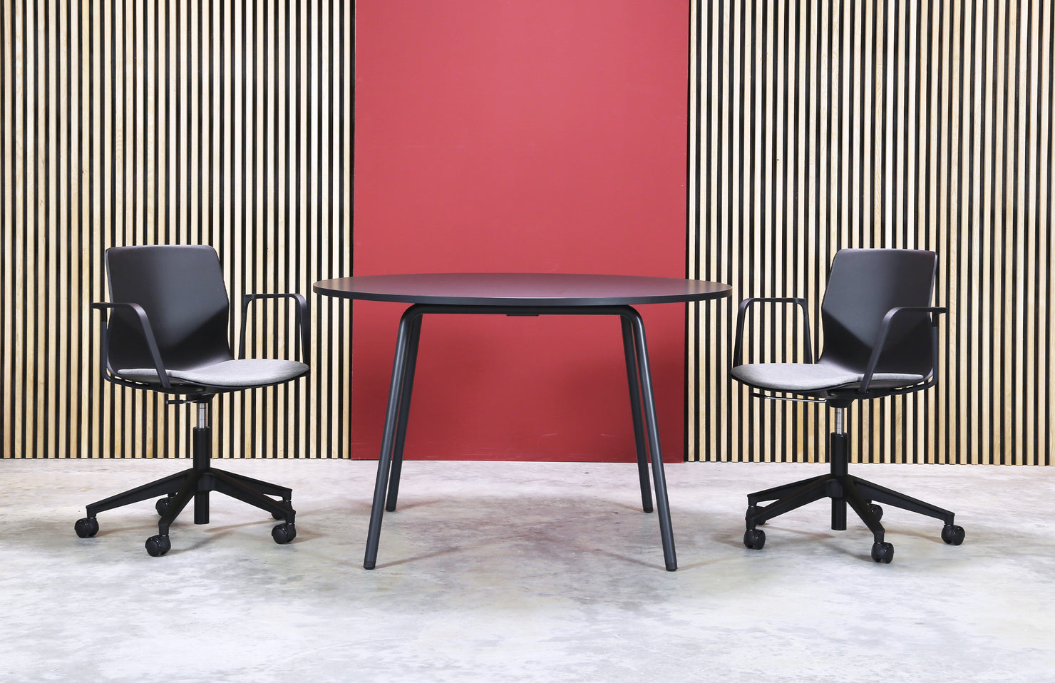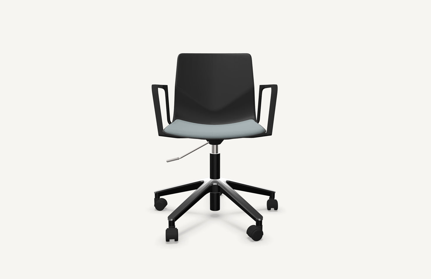 FourSure® has a durable seat shell with a generous seat and organic curves. Featured here with a swiveling wheeler base and polypropylene shell, upholstered seat pad, and arms.