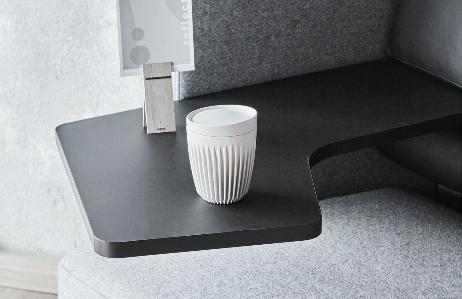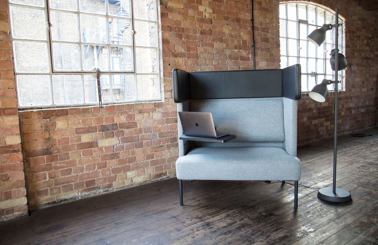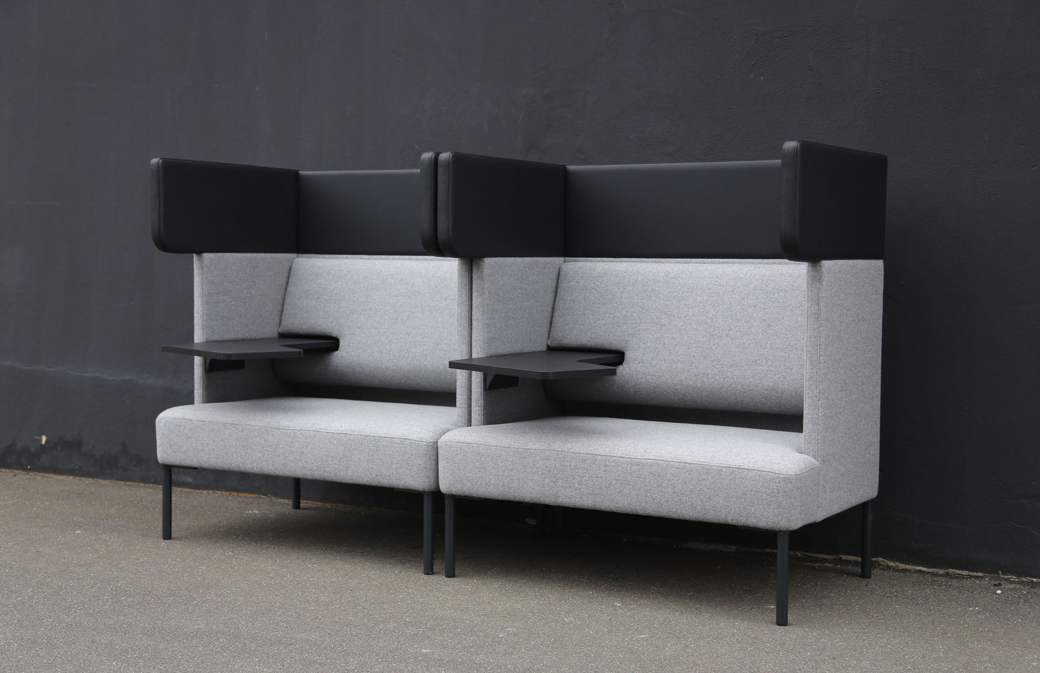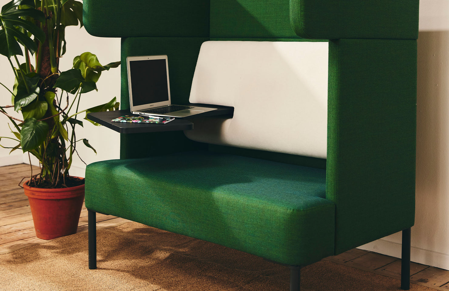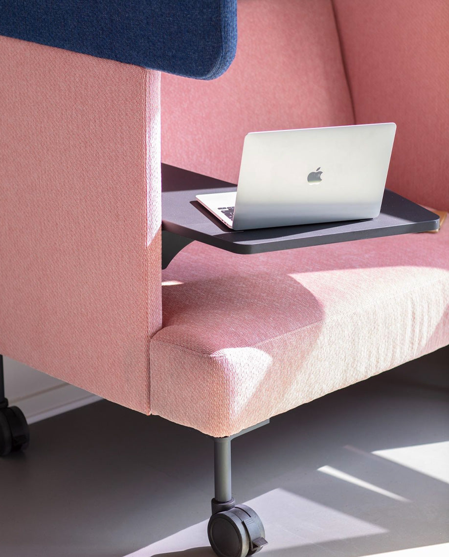 A cozy, modern work pod with visual barriers, acoustic features and a tablet arm that creates the perfect working space for those seeking privacy or for collaboration when paired front-to-front.