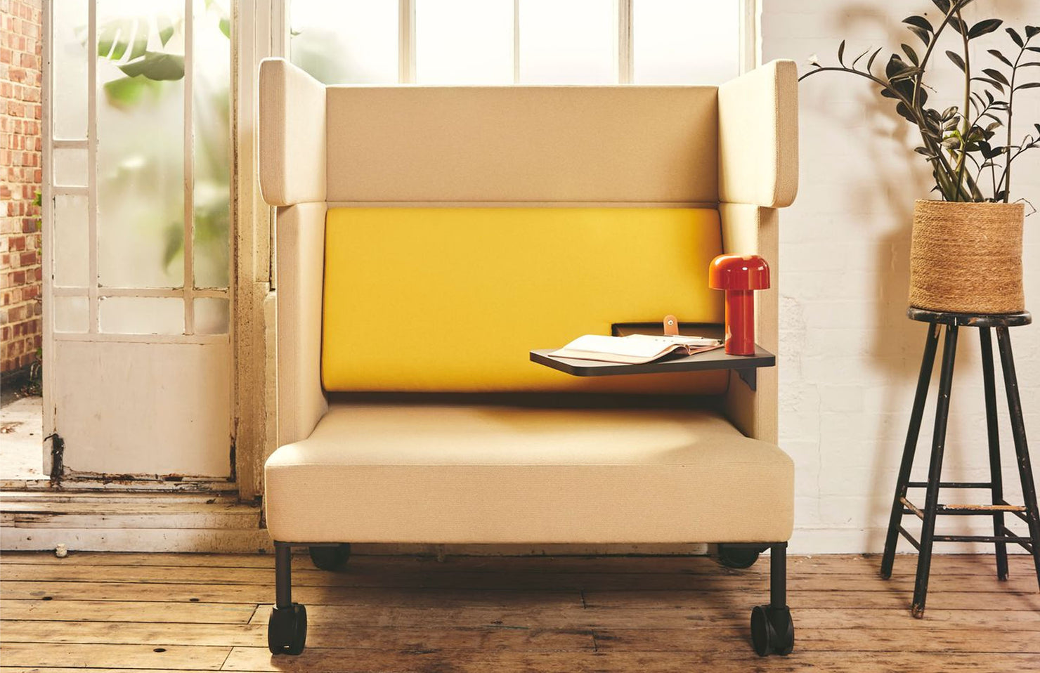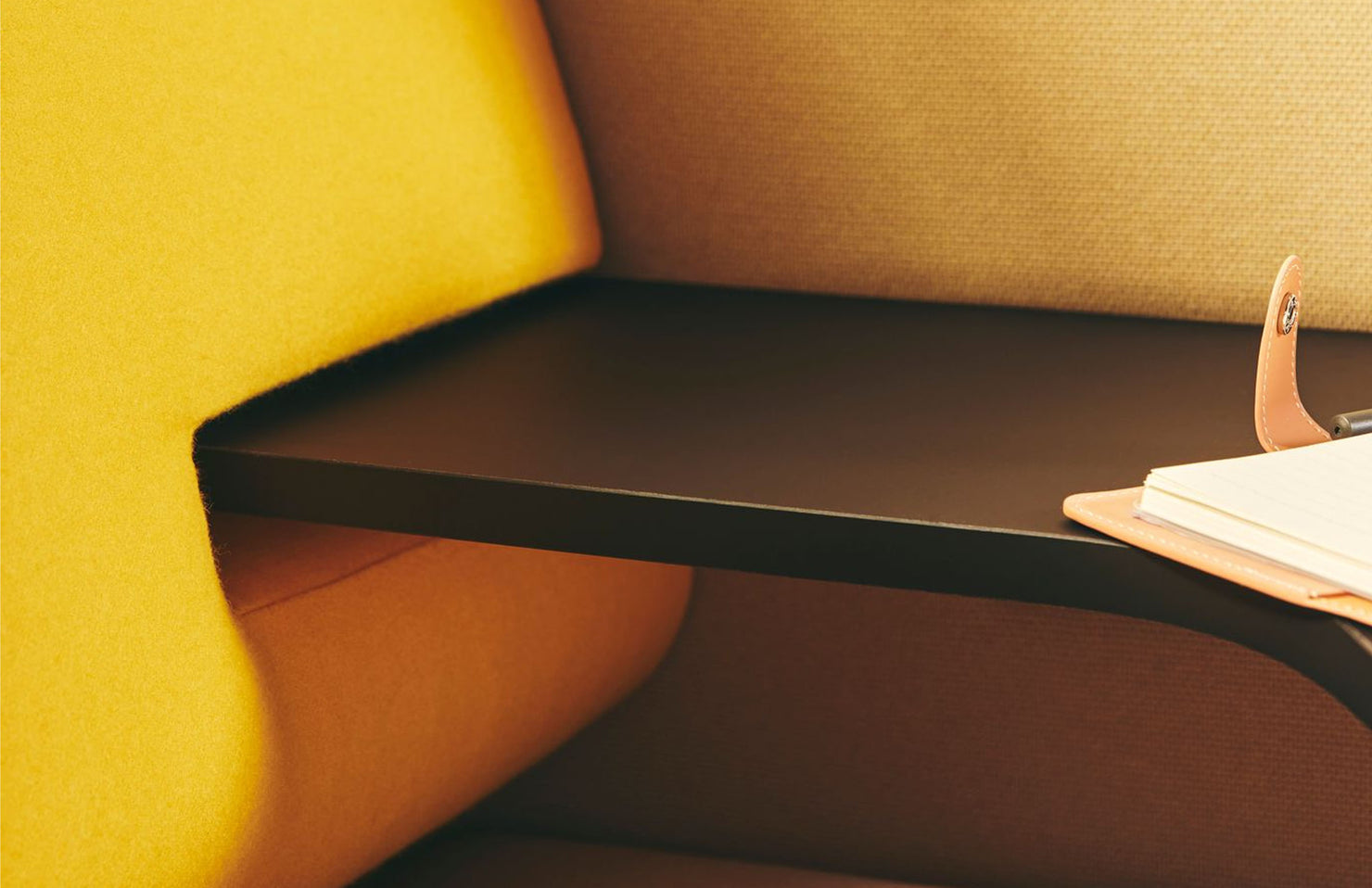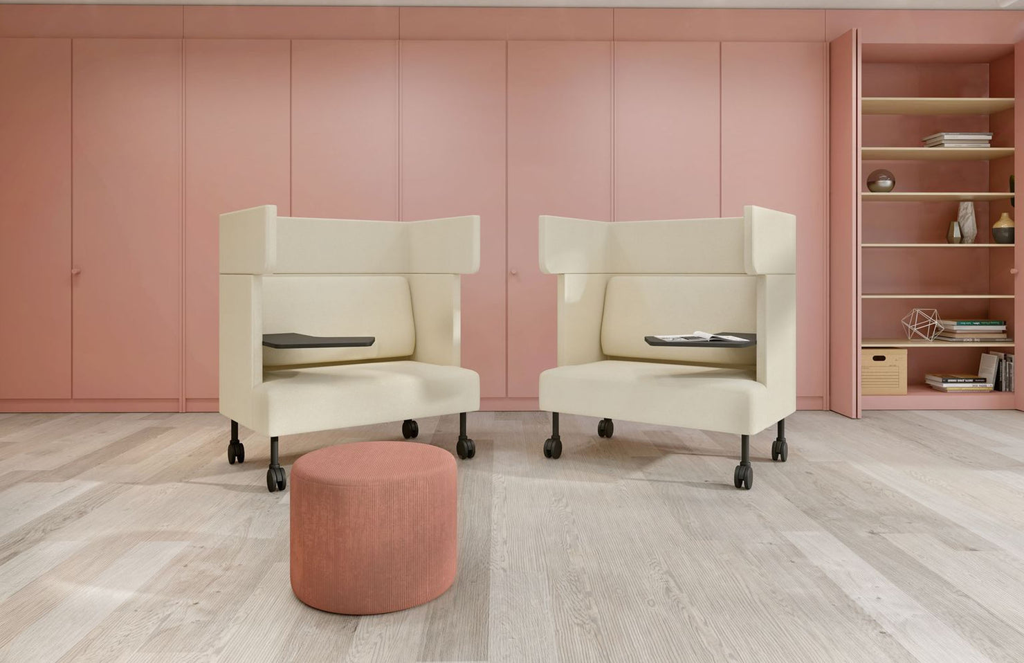 A cozy, modern work pod with visual barriers, acoustic features and a tablet arm that creates the perfect working space for those seeking privacy or for collaboration when paired front-to-front.