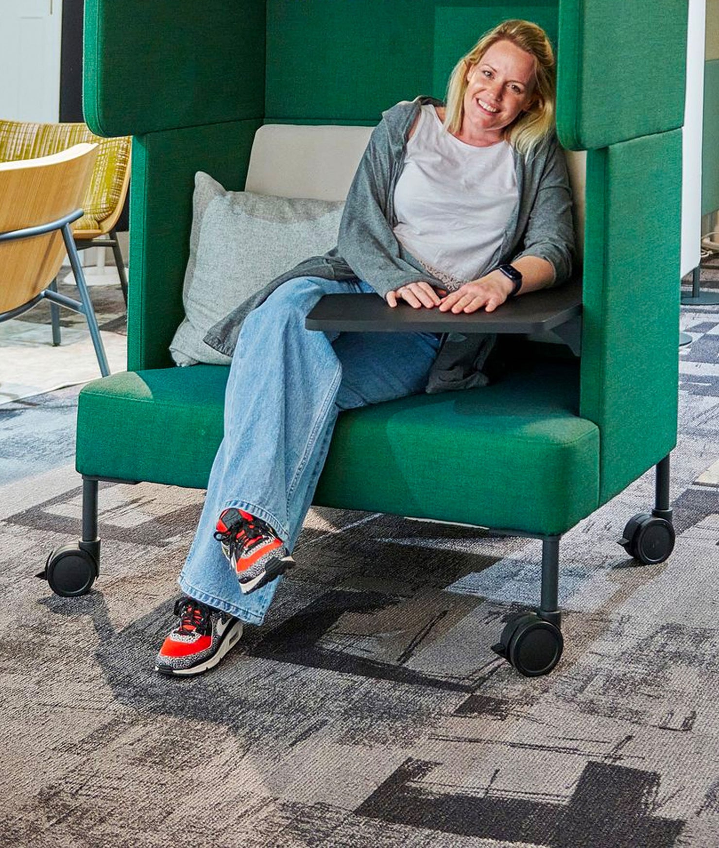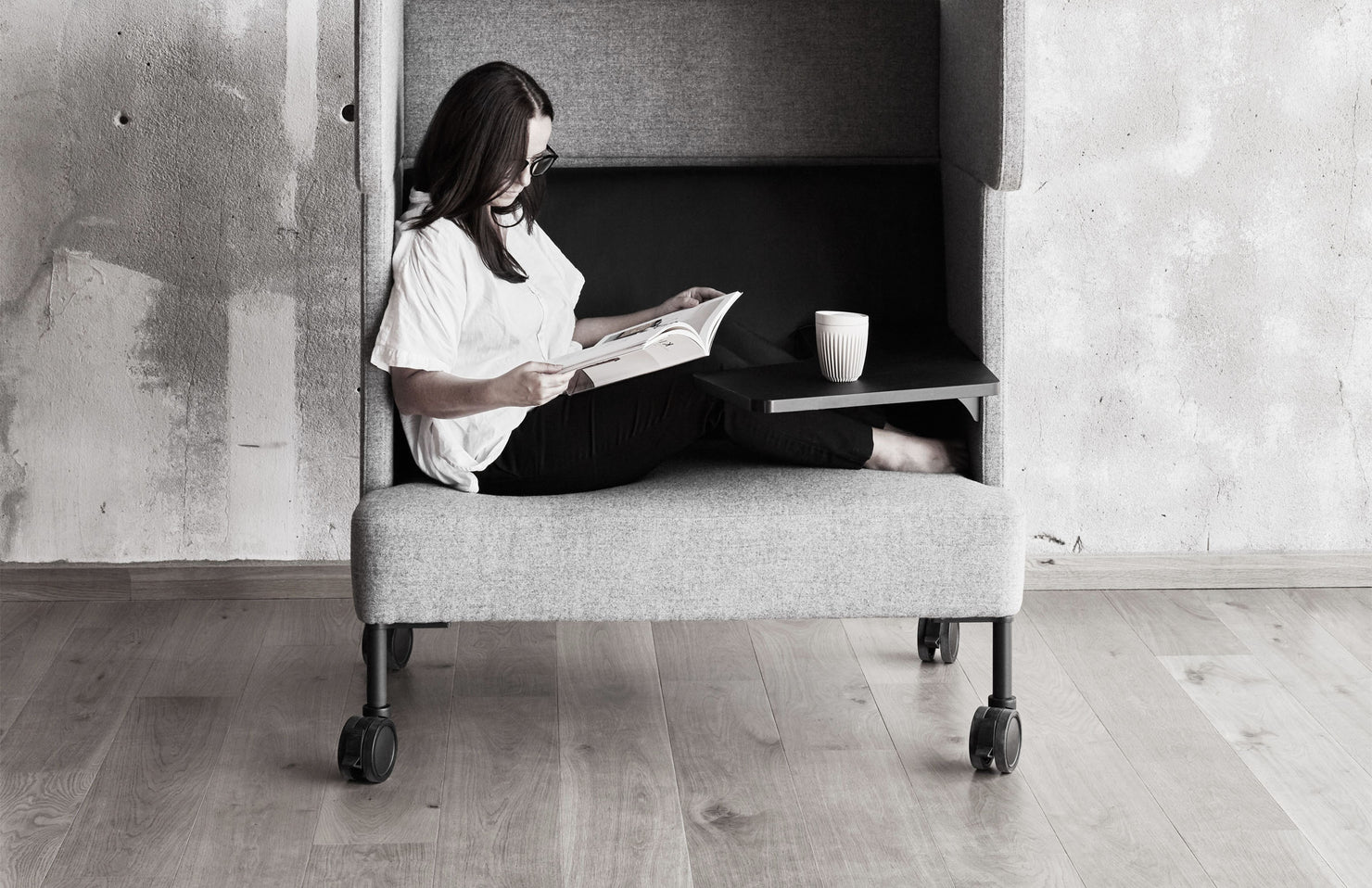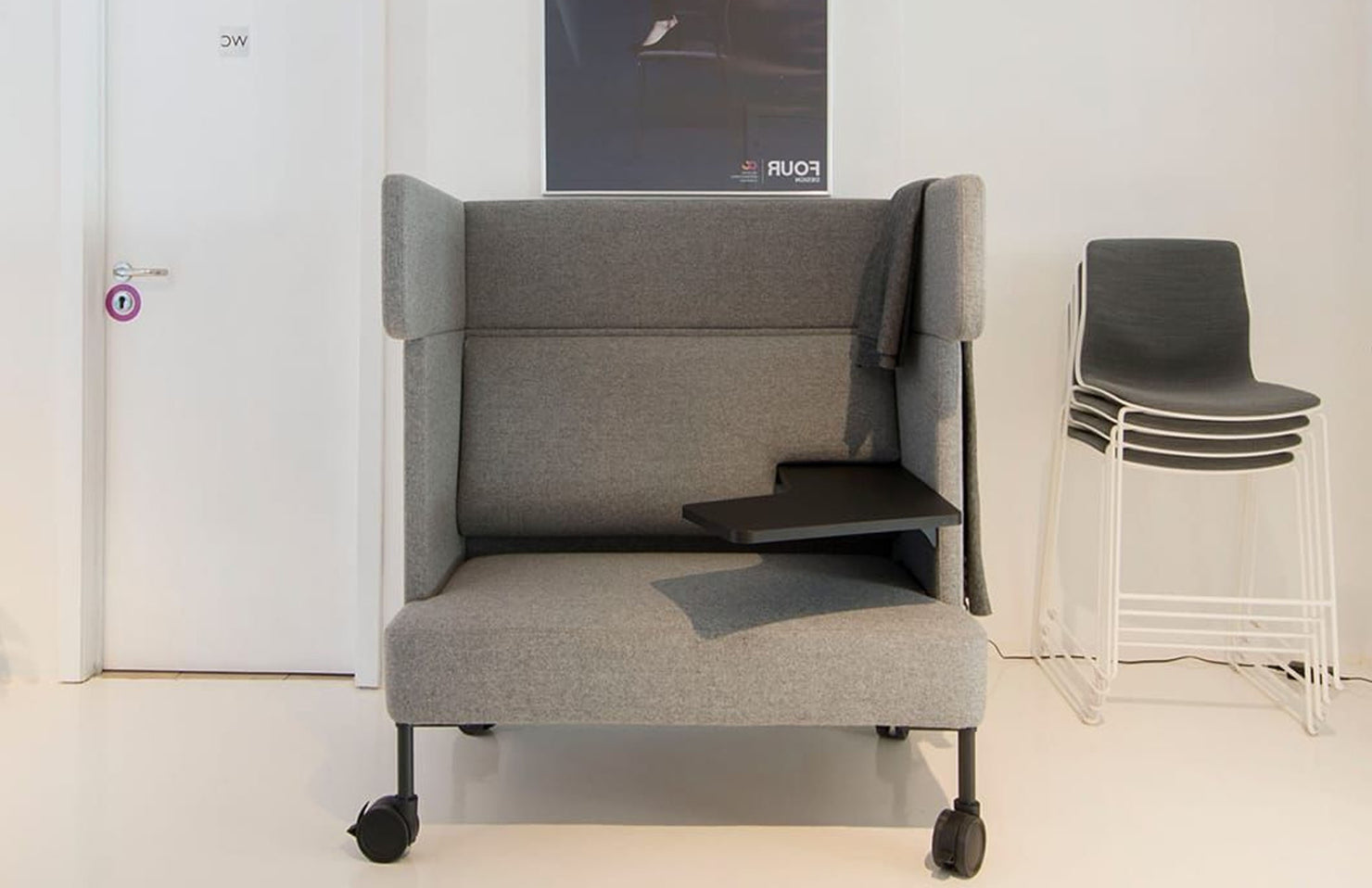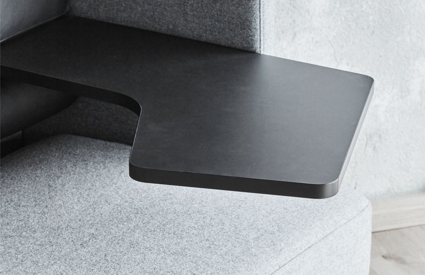 A cozy, modern work pod with visual barriers, acoustic features and a tablet arm that creates the perfect working space for those seeking privacy or for collaboration when paired front-to-front.