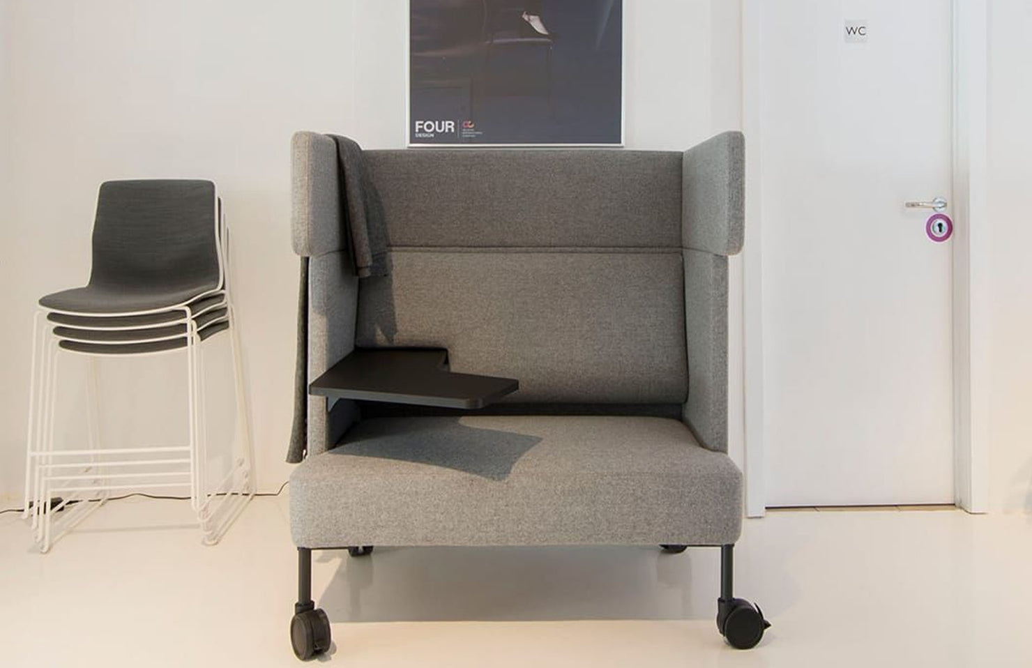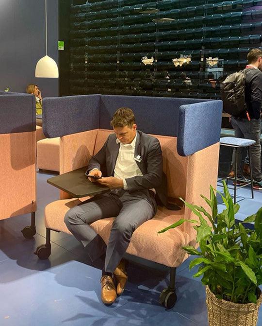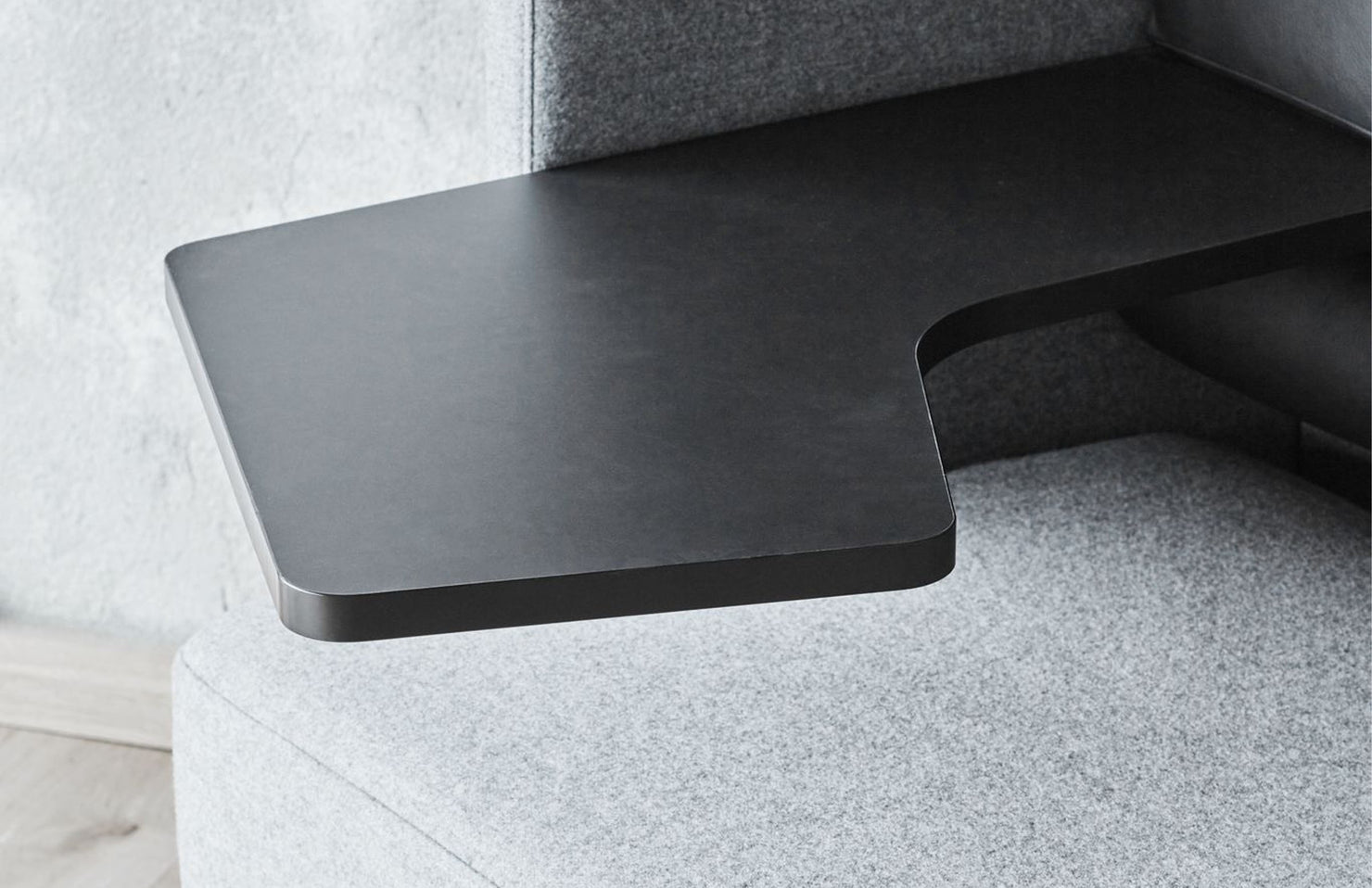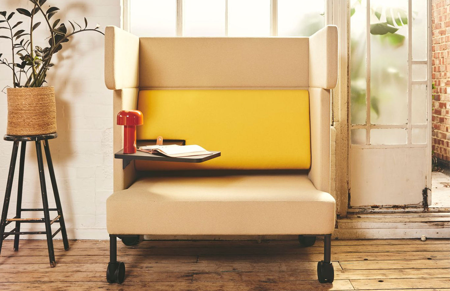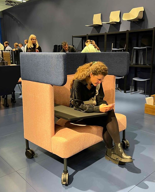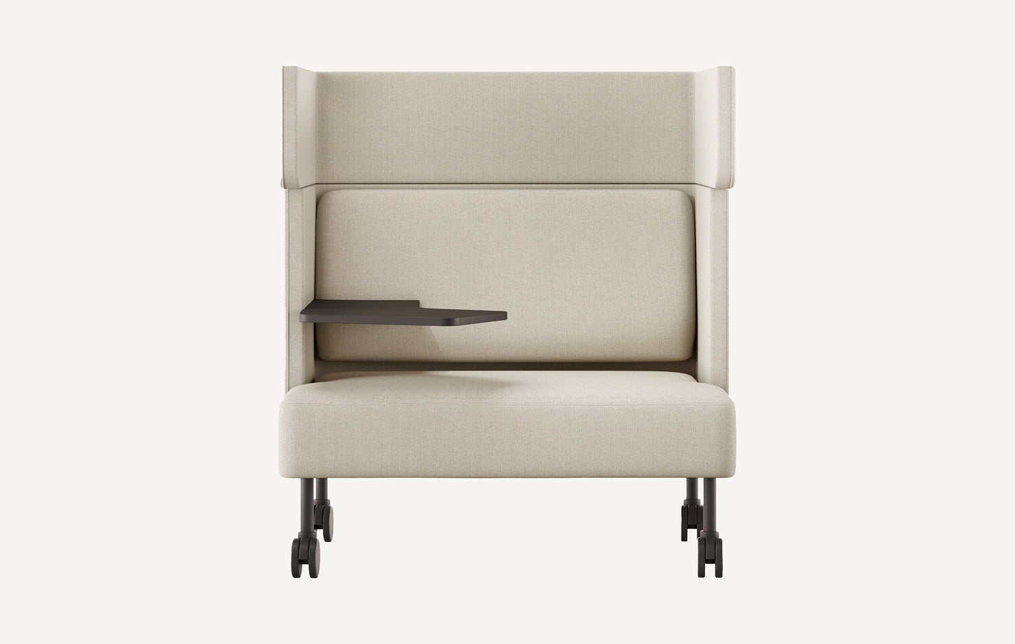 A cozy, modern work pod with a caster base, visual barriers, acoustic features and a tablet arm that creates the perfect working space for those seeking privacy or for collaboration when paired front-to-front.
