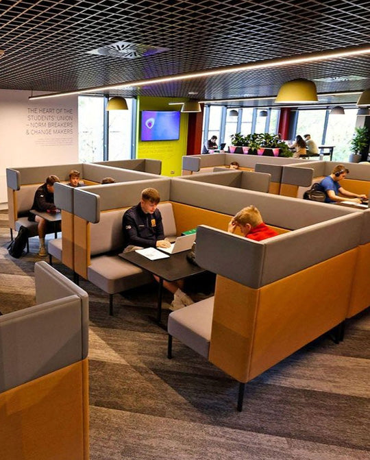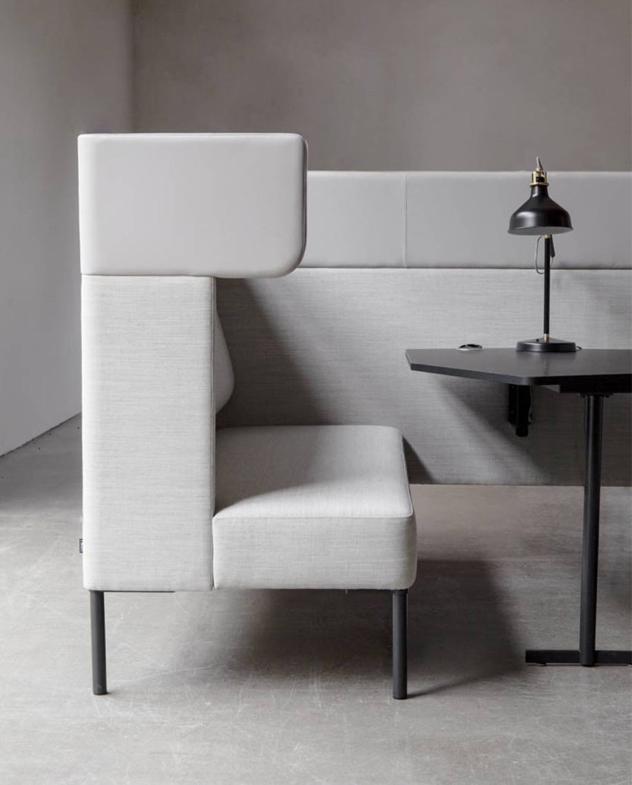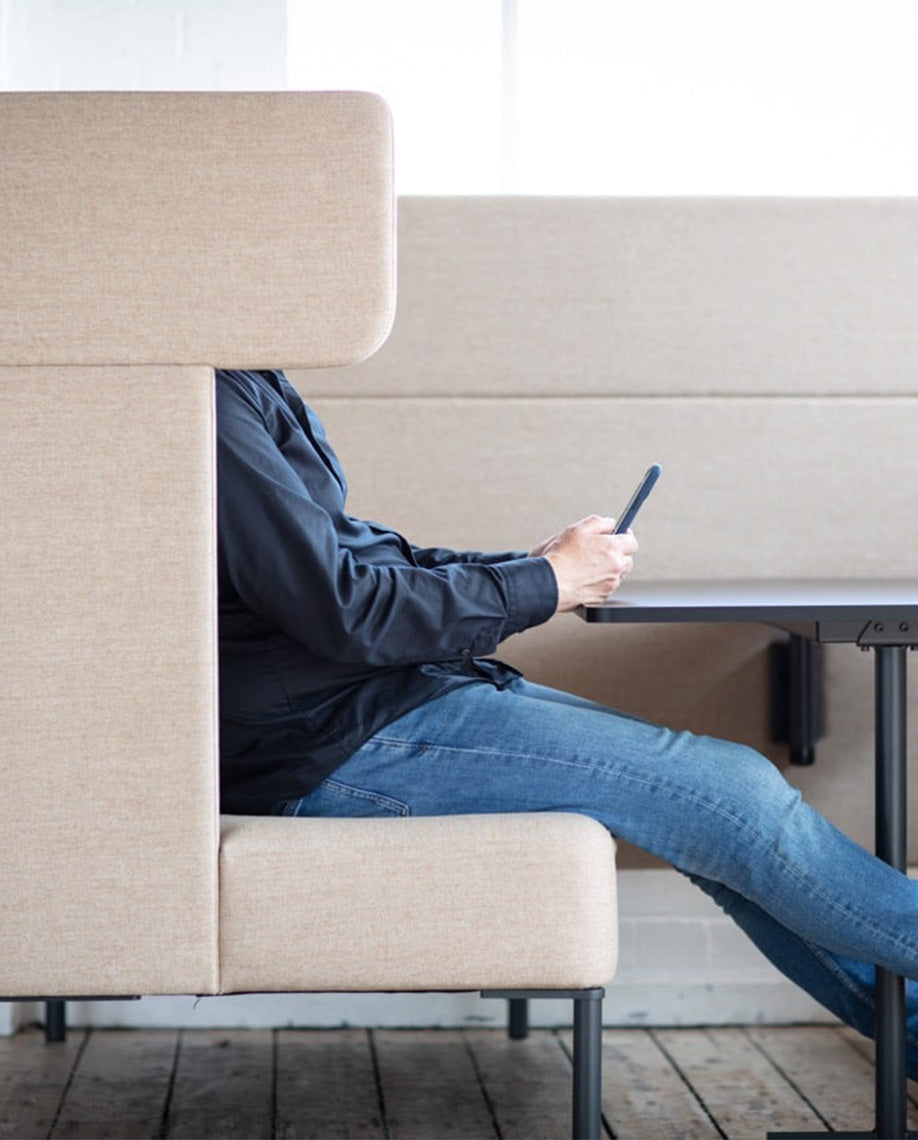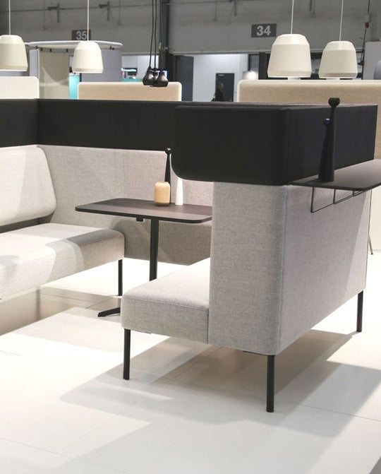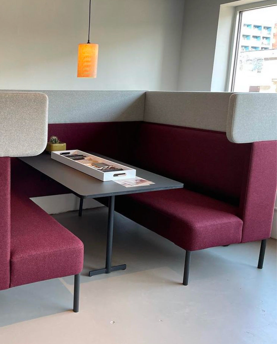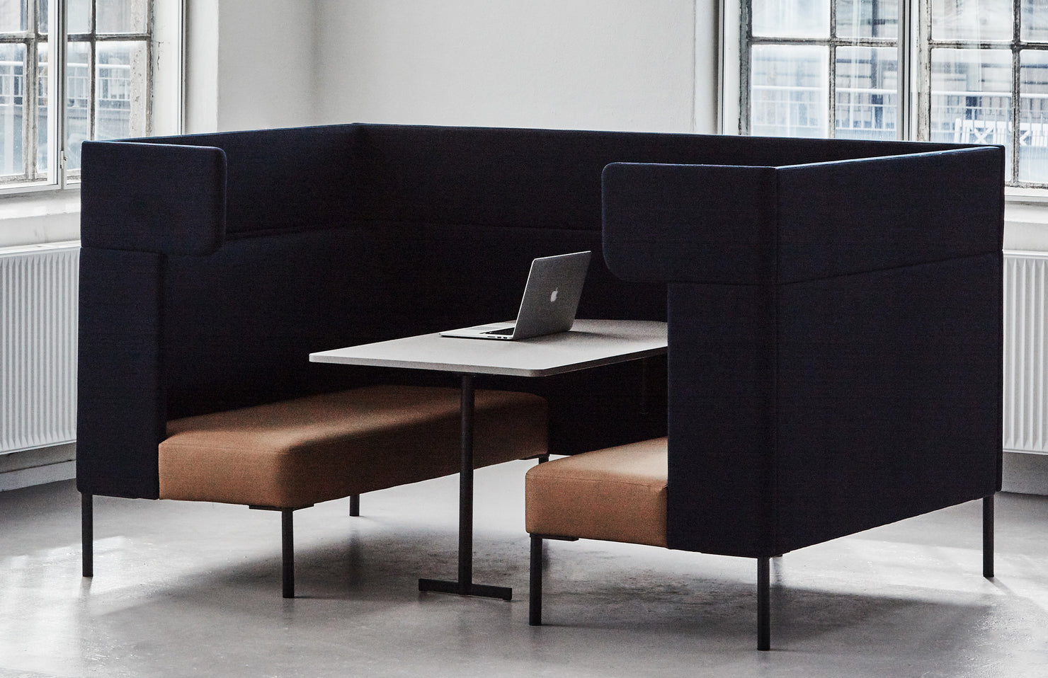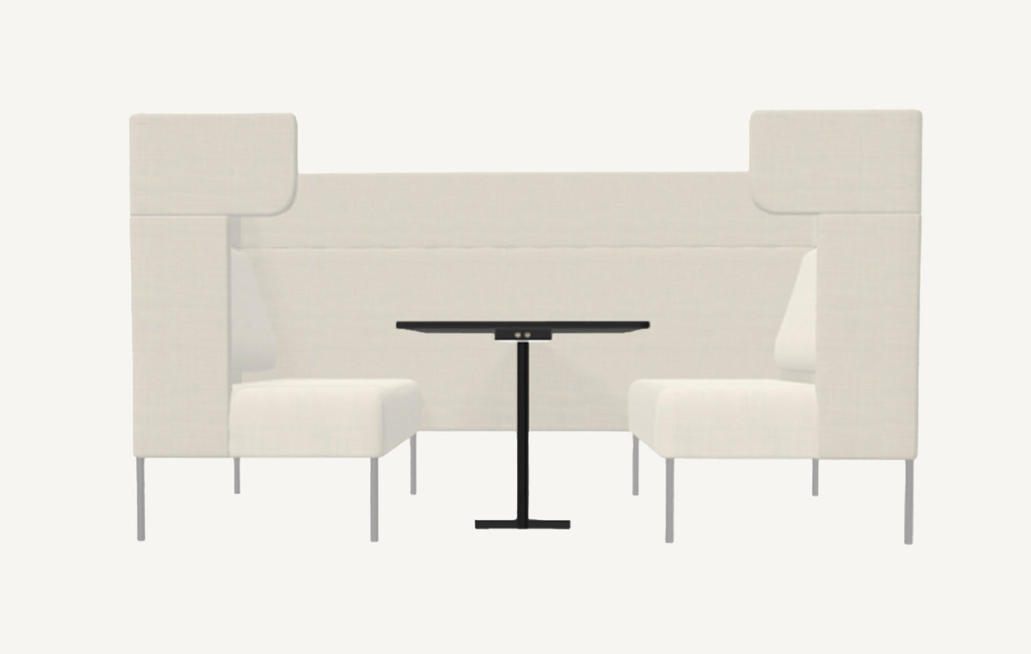 A clever table solution that pivots, allowing users easy entry and exit from the booth.