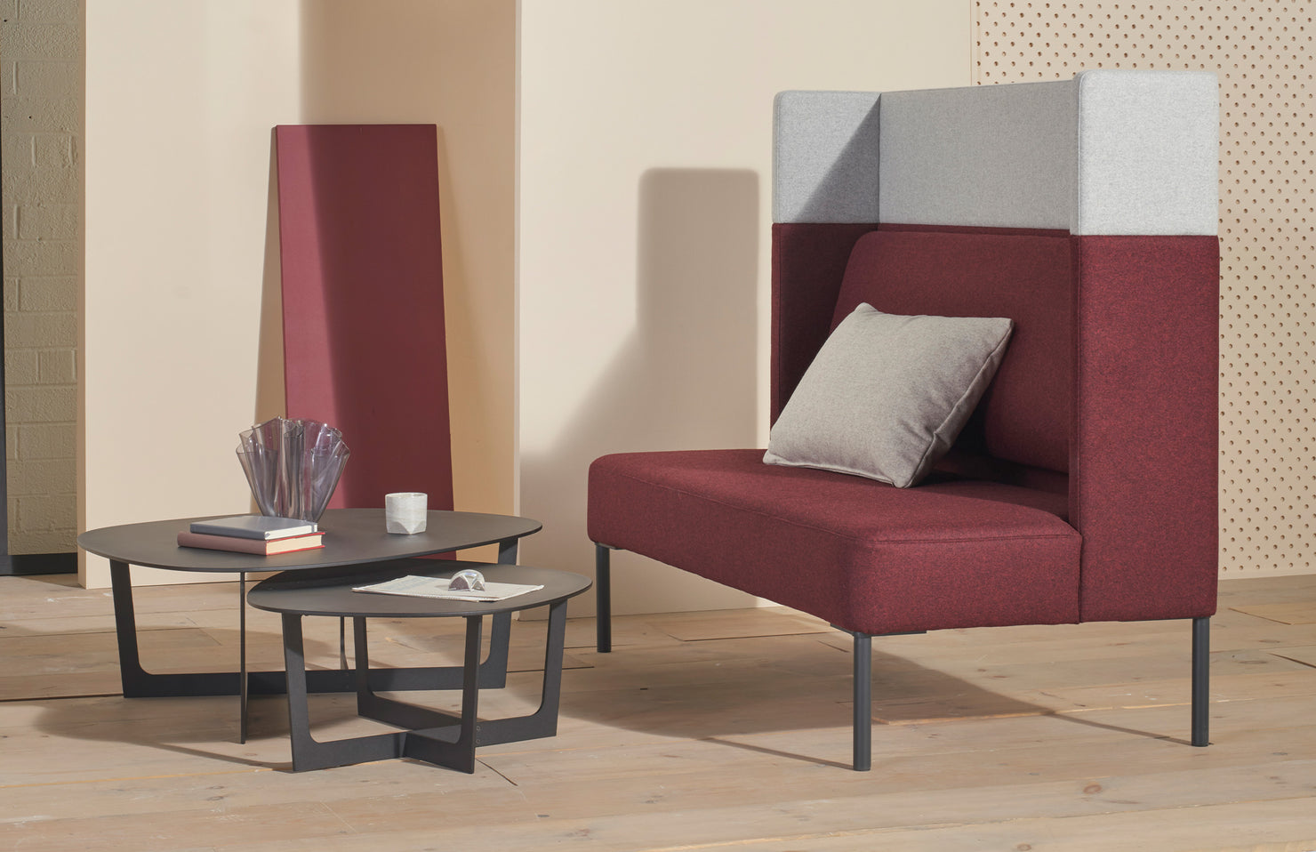 Modern, classic two-seat sofa with an extension top that provides privacy and improved acoustics within its clean-lined aesthetic.