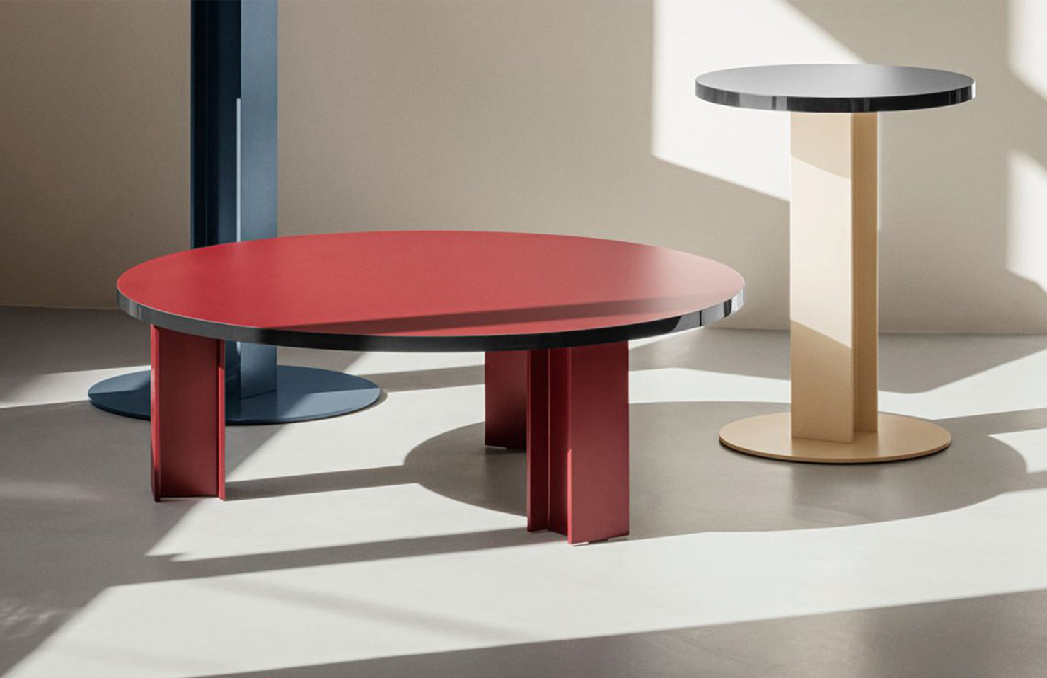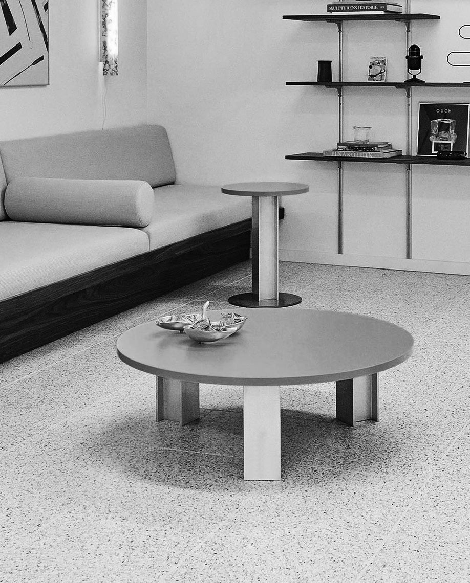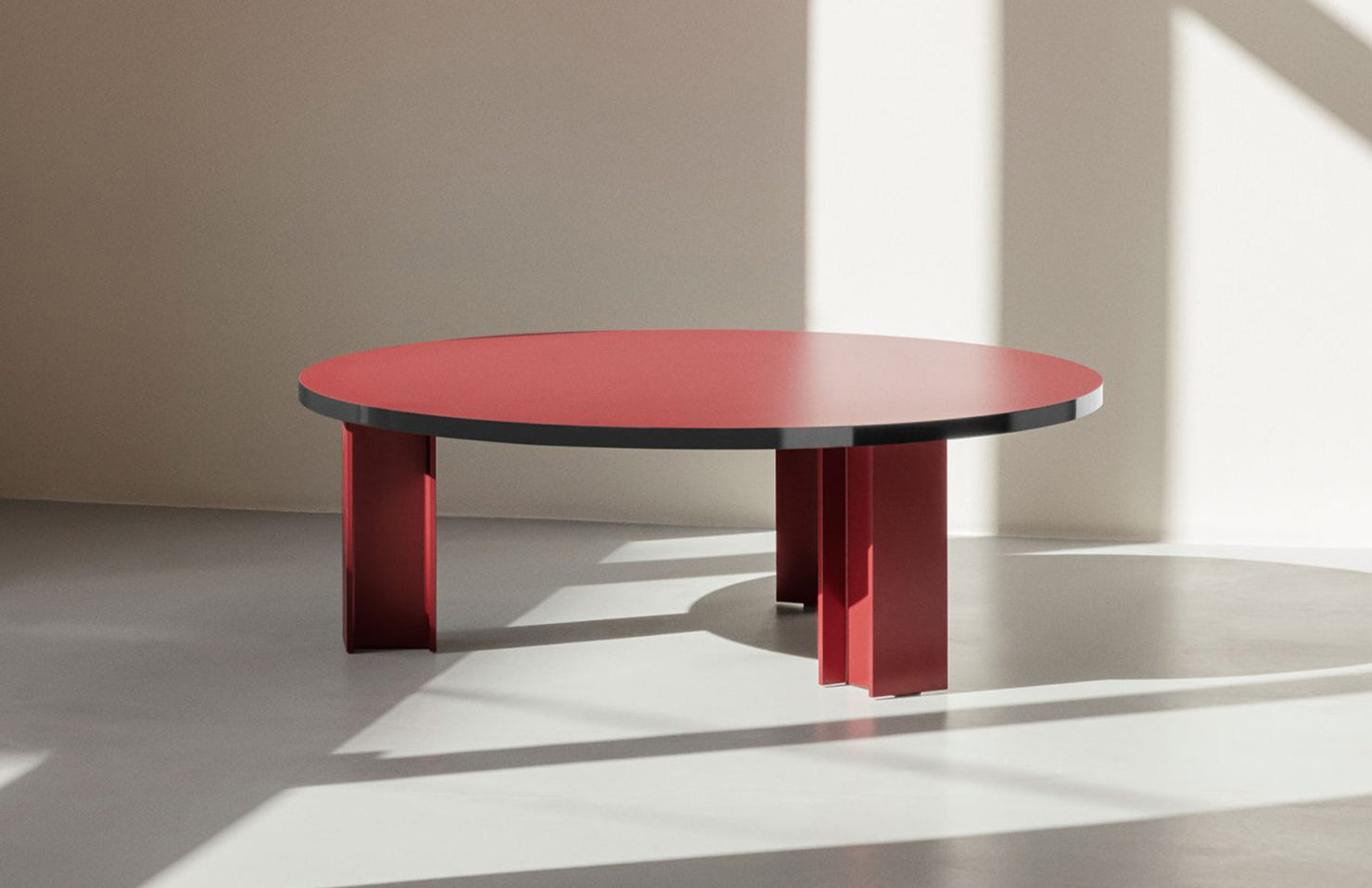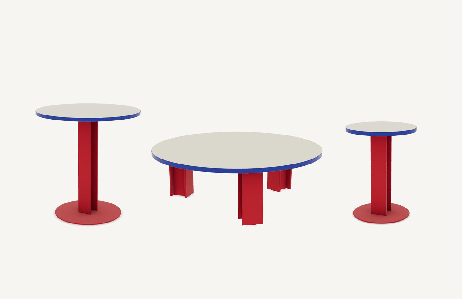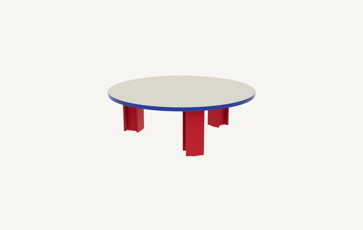 Part of a table collection that blends industrial craft with playful design, featuring aluminum beams and vibrant, customizable tabletops. Designed for versatility and connection, these sculptural tables bring durability and expression to any space.