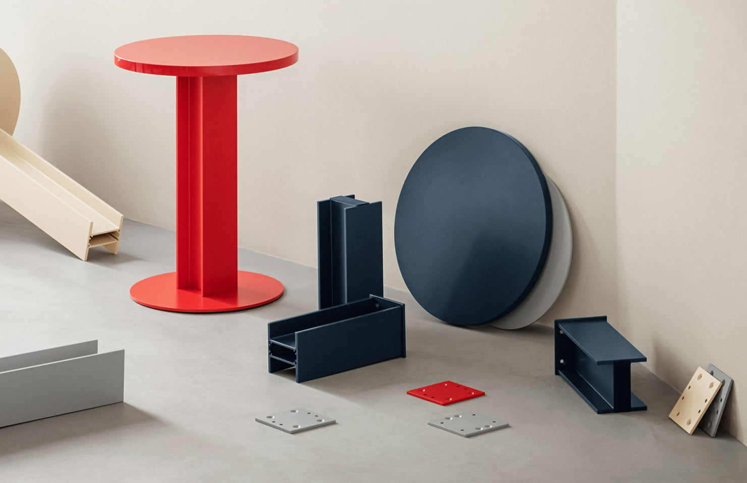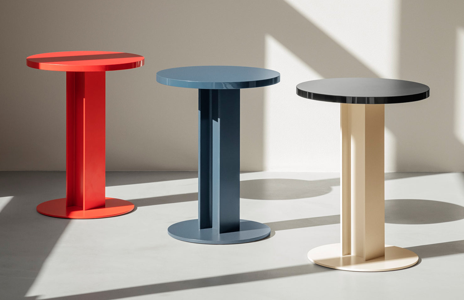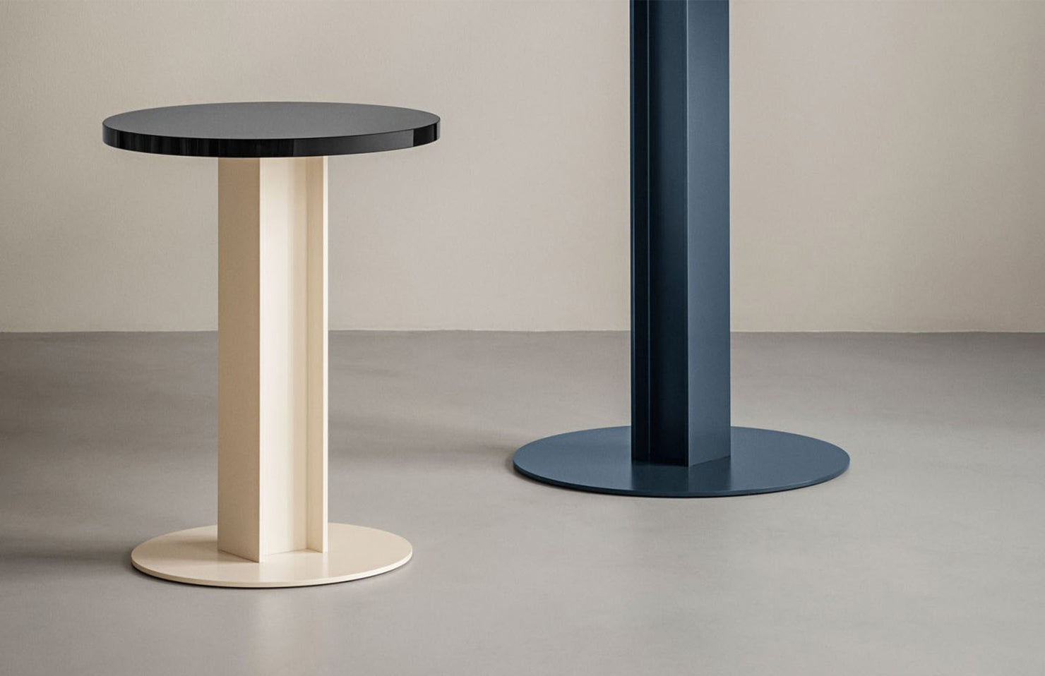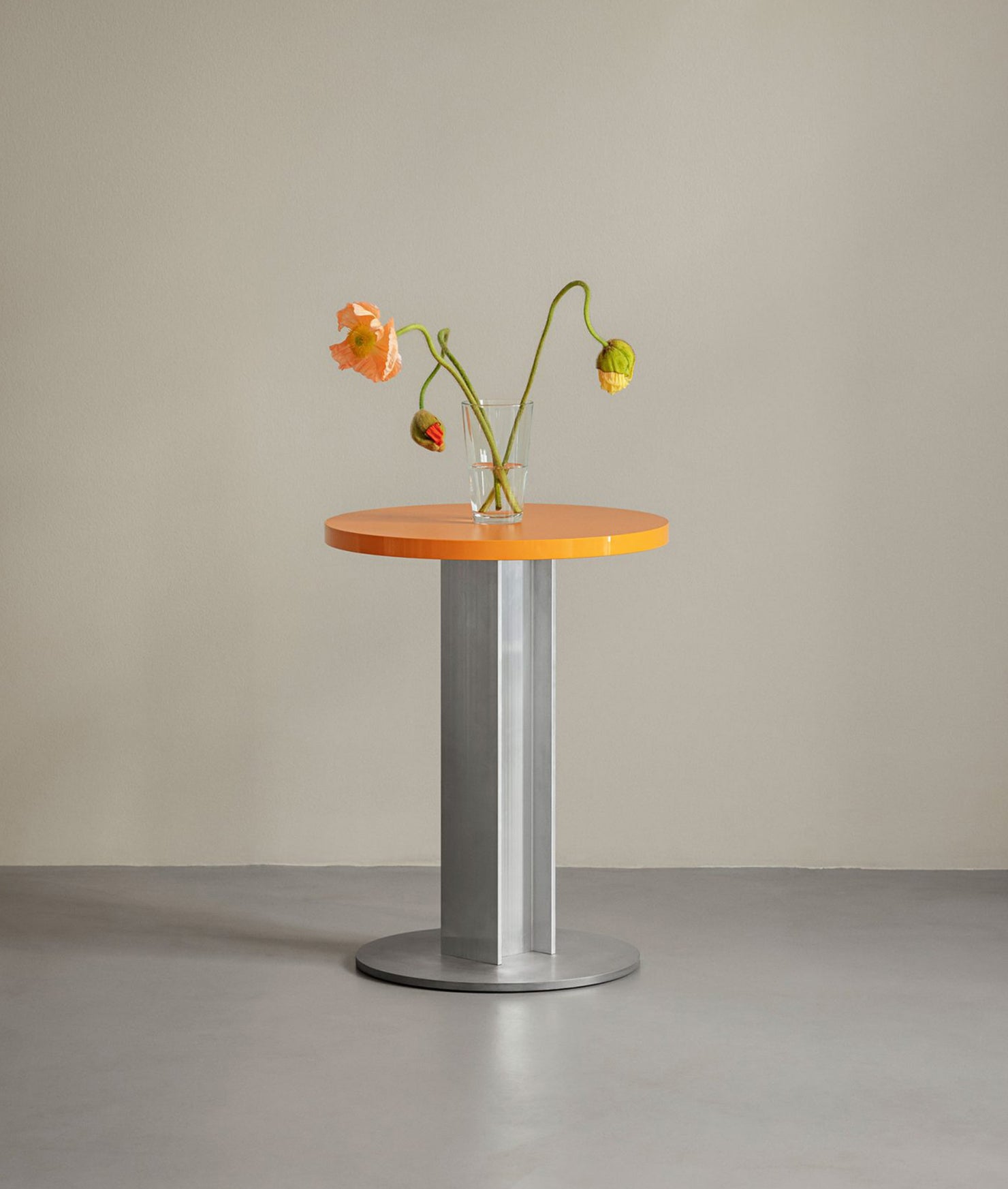 Part of a table collection that blends industrial craft with playful design, featuring aluminum beams and vibrant, customizable tabletops. Designed for versatility and connection, these sculptural tables bring durability and expression to any space.