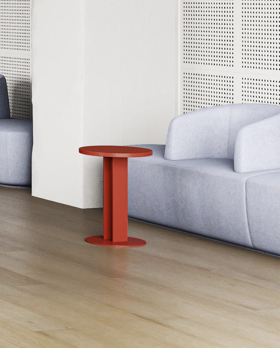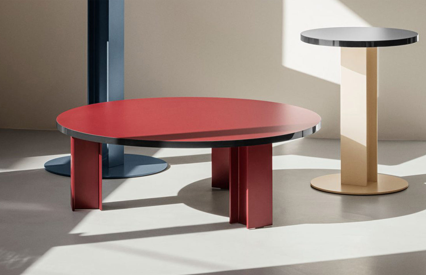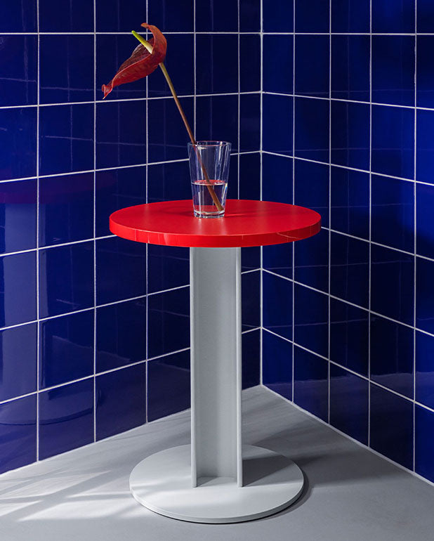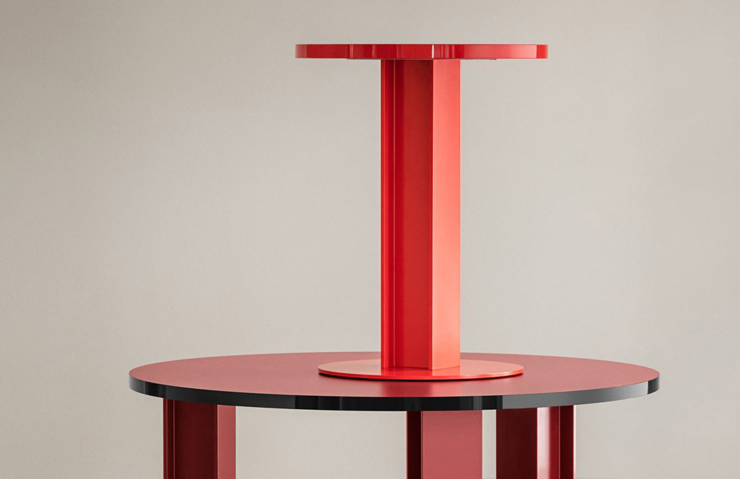 Part of a table collection that blends industrial craft with playful design, featuring aluminum beams and vibrant, customizable tabletops. Designed for versatility and connection, these sculptural tables bring durability and expression to any space.