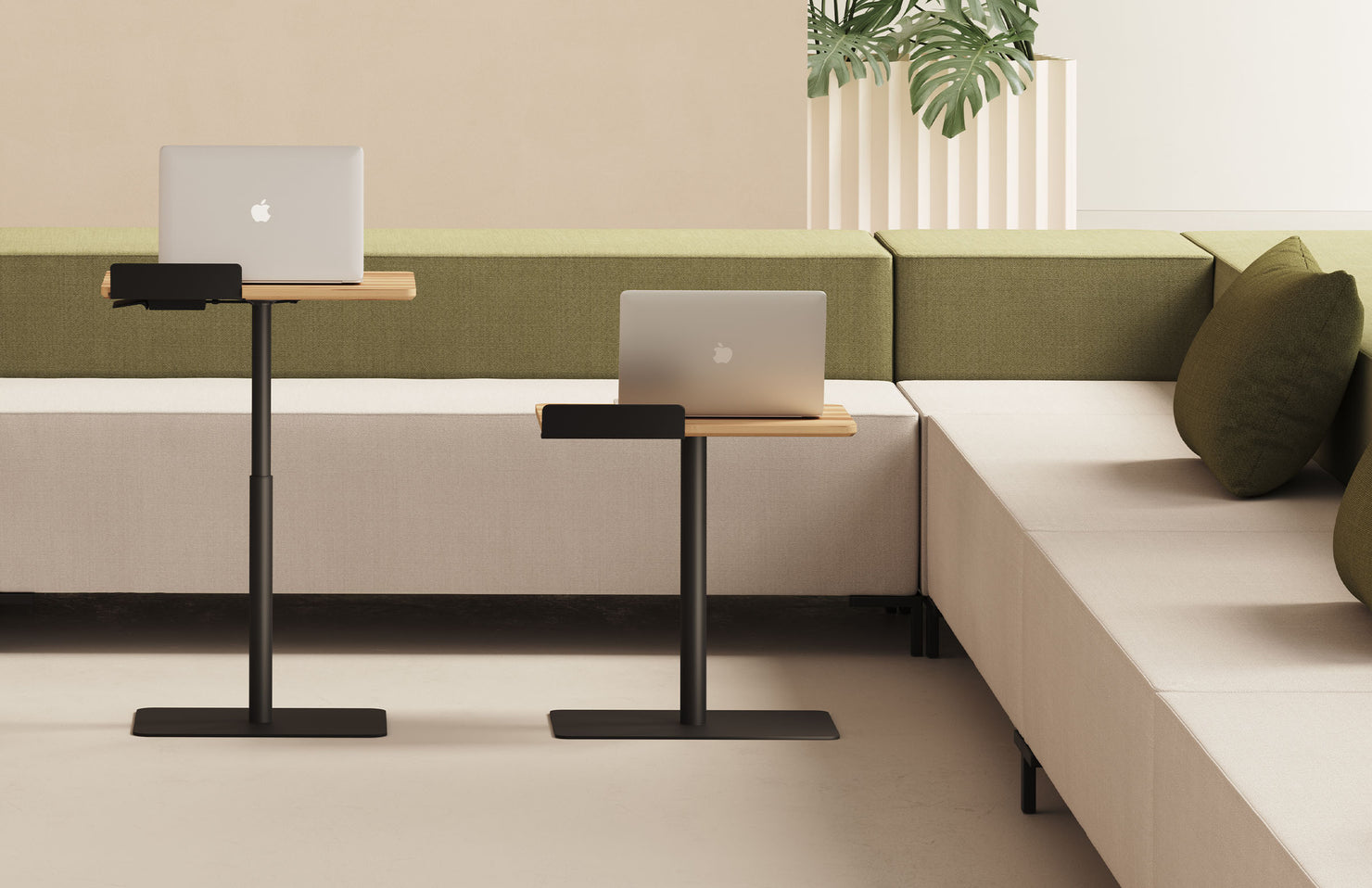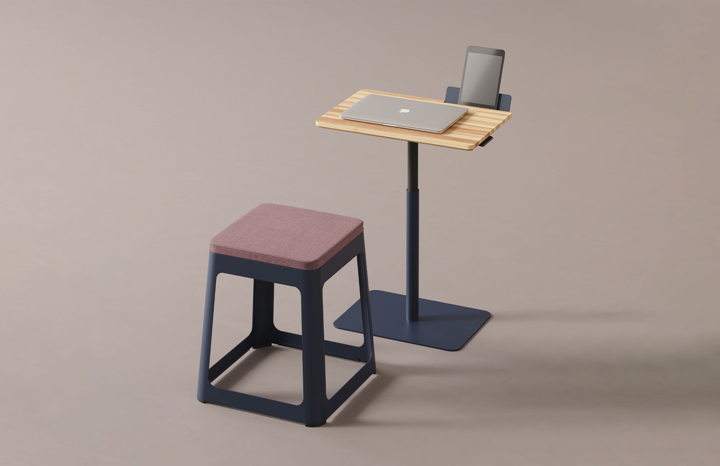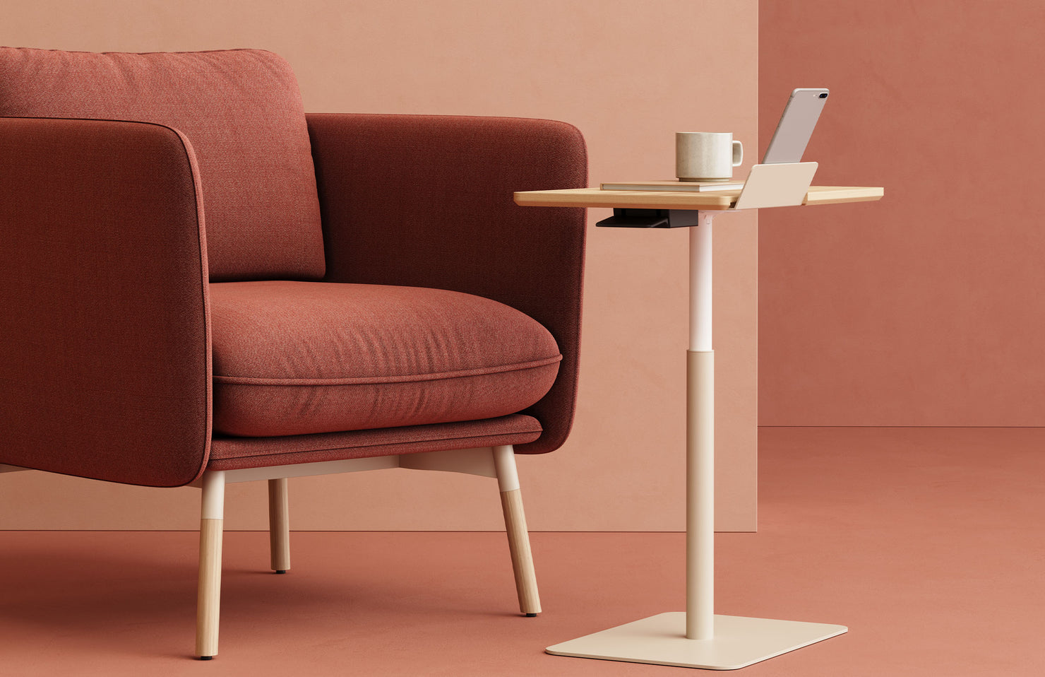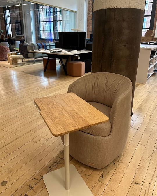 With a height range of 10 inches, an easy one-hand lift mechanism, and numerous powder coat finish options, this table can adapt to various spaces and working styles. The additional tablet holder offers easy access to mobile devices.