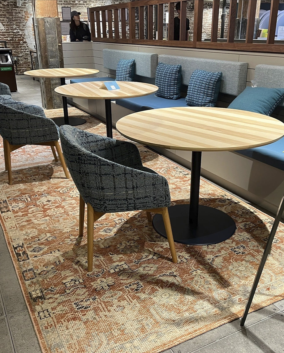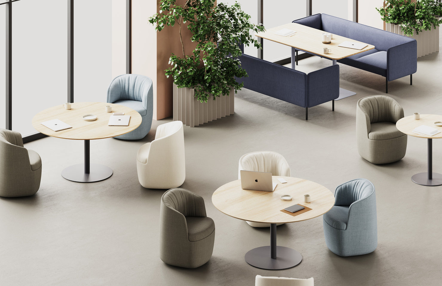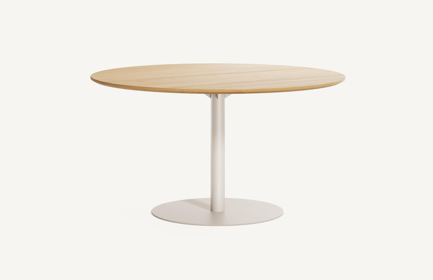 A wood top, powder-coated column base, and sturdy structure make Kona Tables the perfect fit for any kind of space. Featured here in a Round Standard Height.