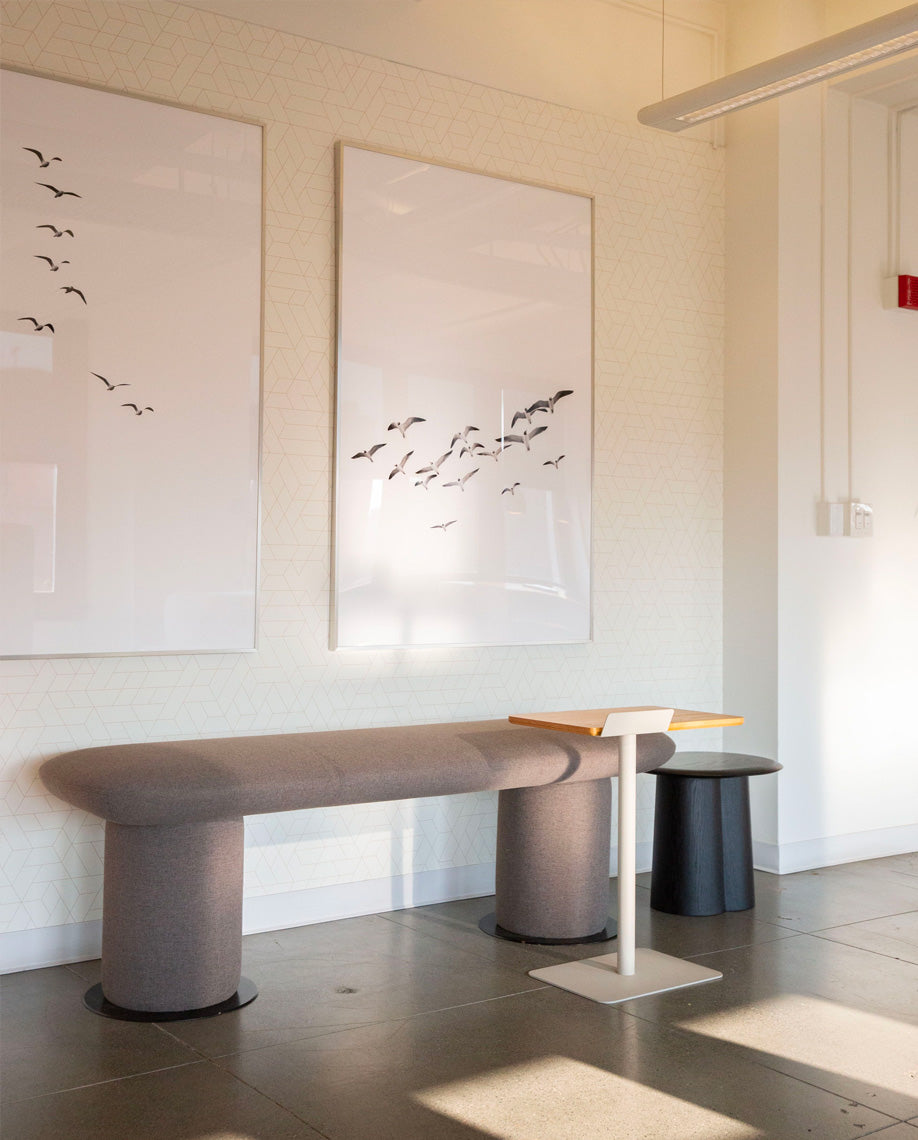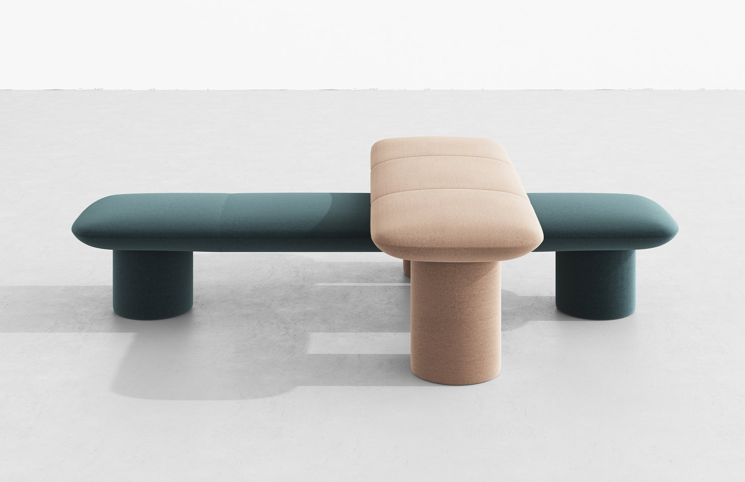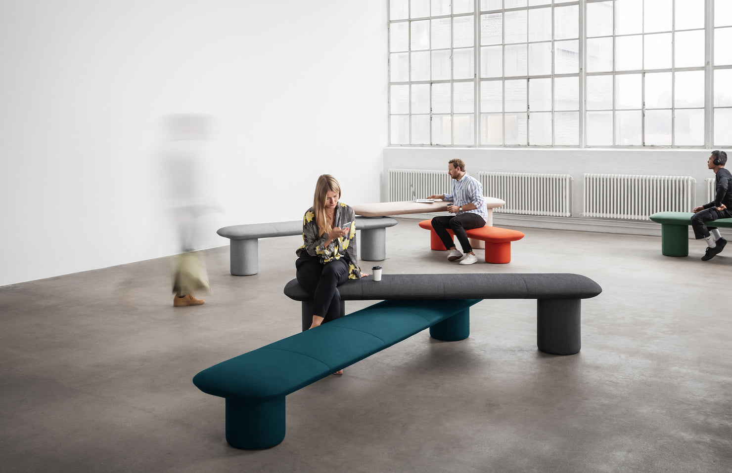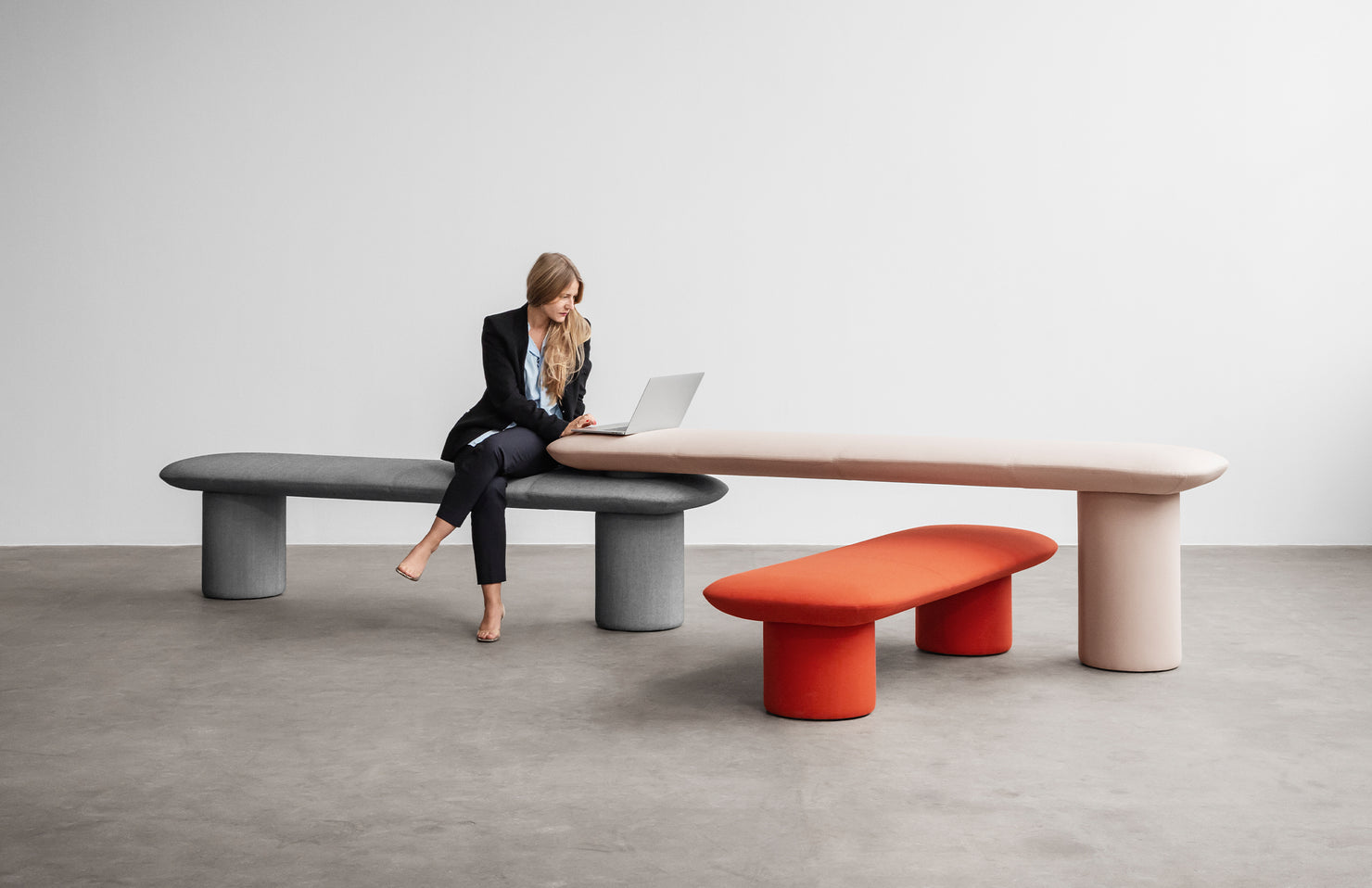 A single low bench rooted with column bases, Levels is ideal for an individual or small group touch-down space.