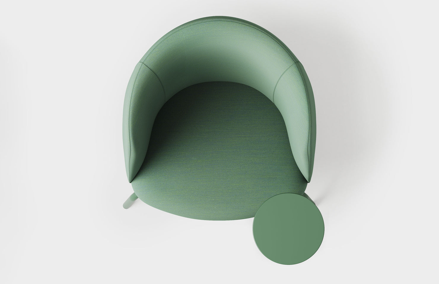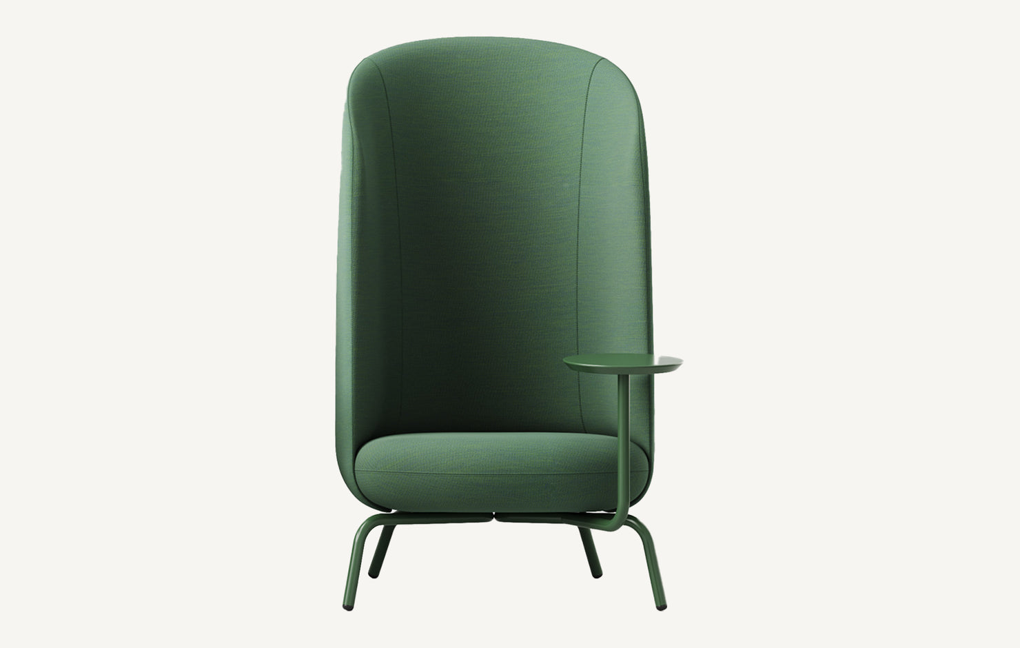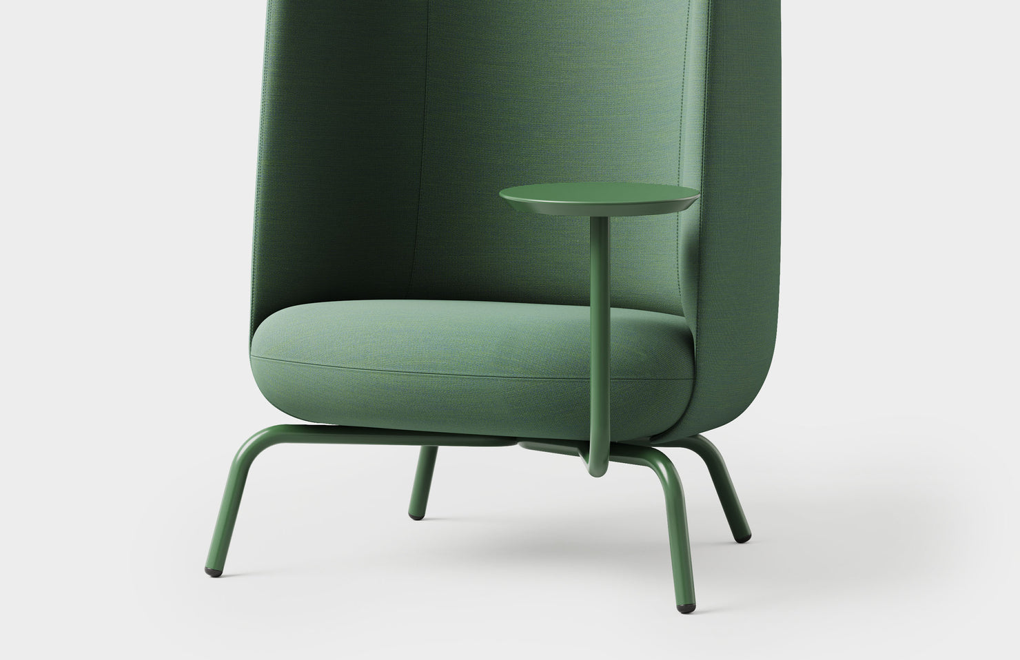 A dramatic, high back lounge seat that surrounds the user and provides a private, serene space to focus or relax. The integrated table takes this cozy place to nest to new heights with added productivity.