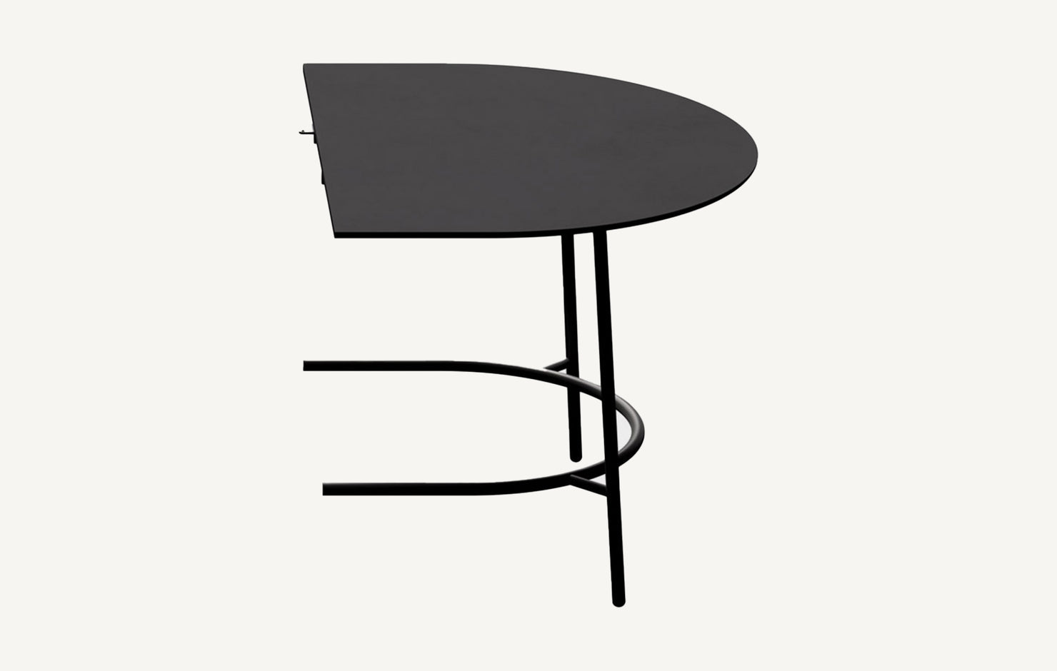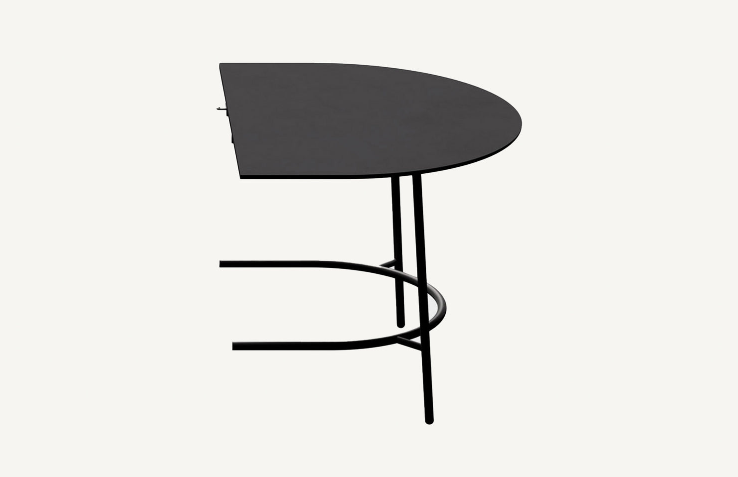 The wall-mounted end module to a modular table system that allows for both linear and curved configurations. Size and shape options are endless with this collection.
