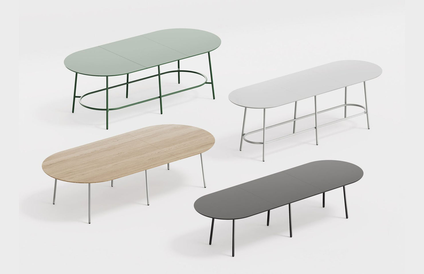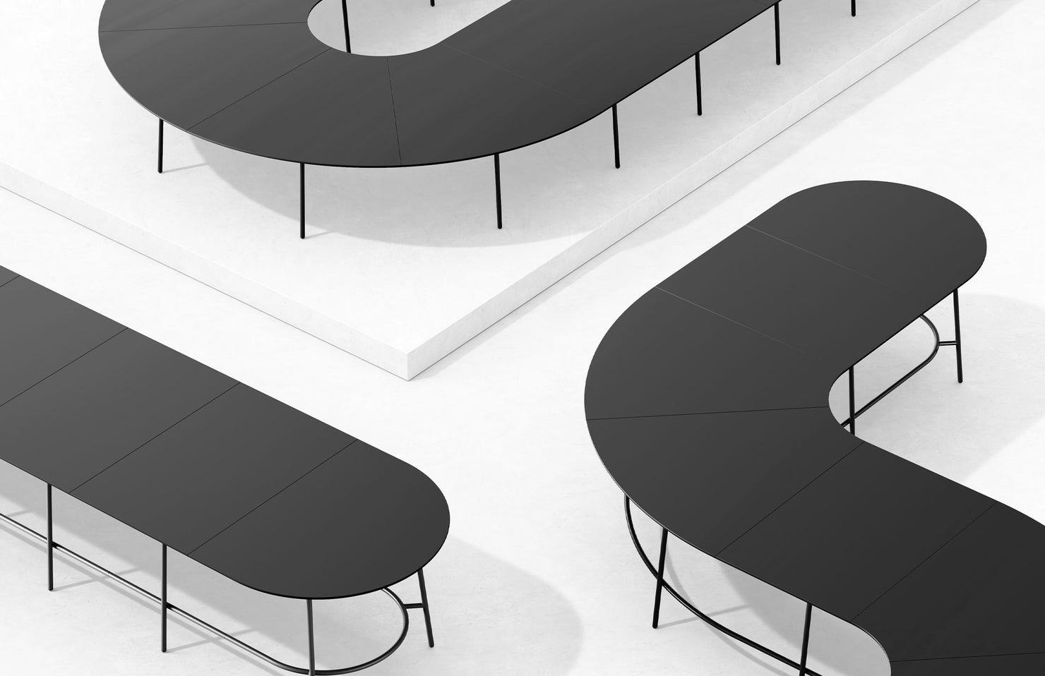 A modular table system allowing for both linear and curved configurations in two heights. Size and shape options are endless with this collection.