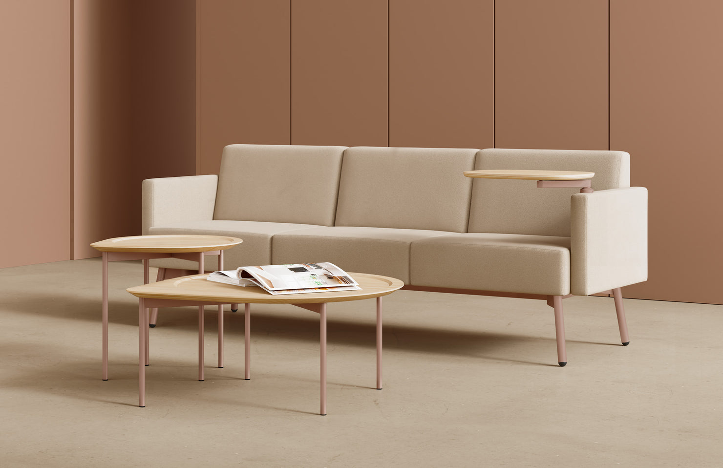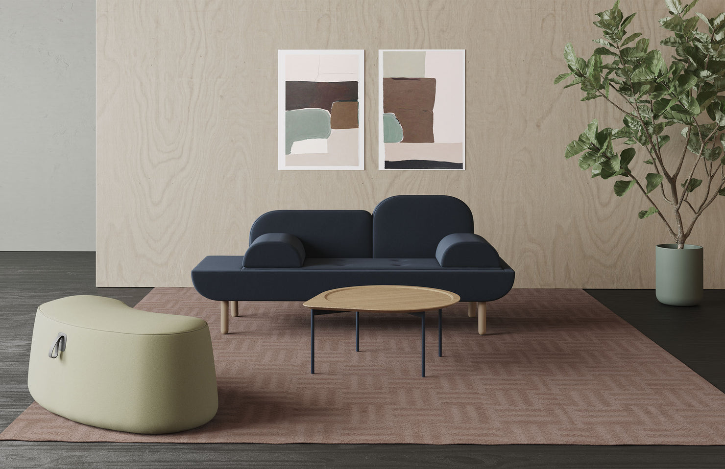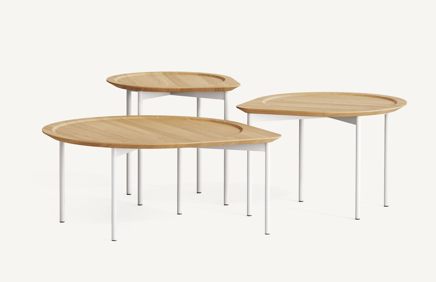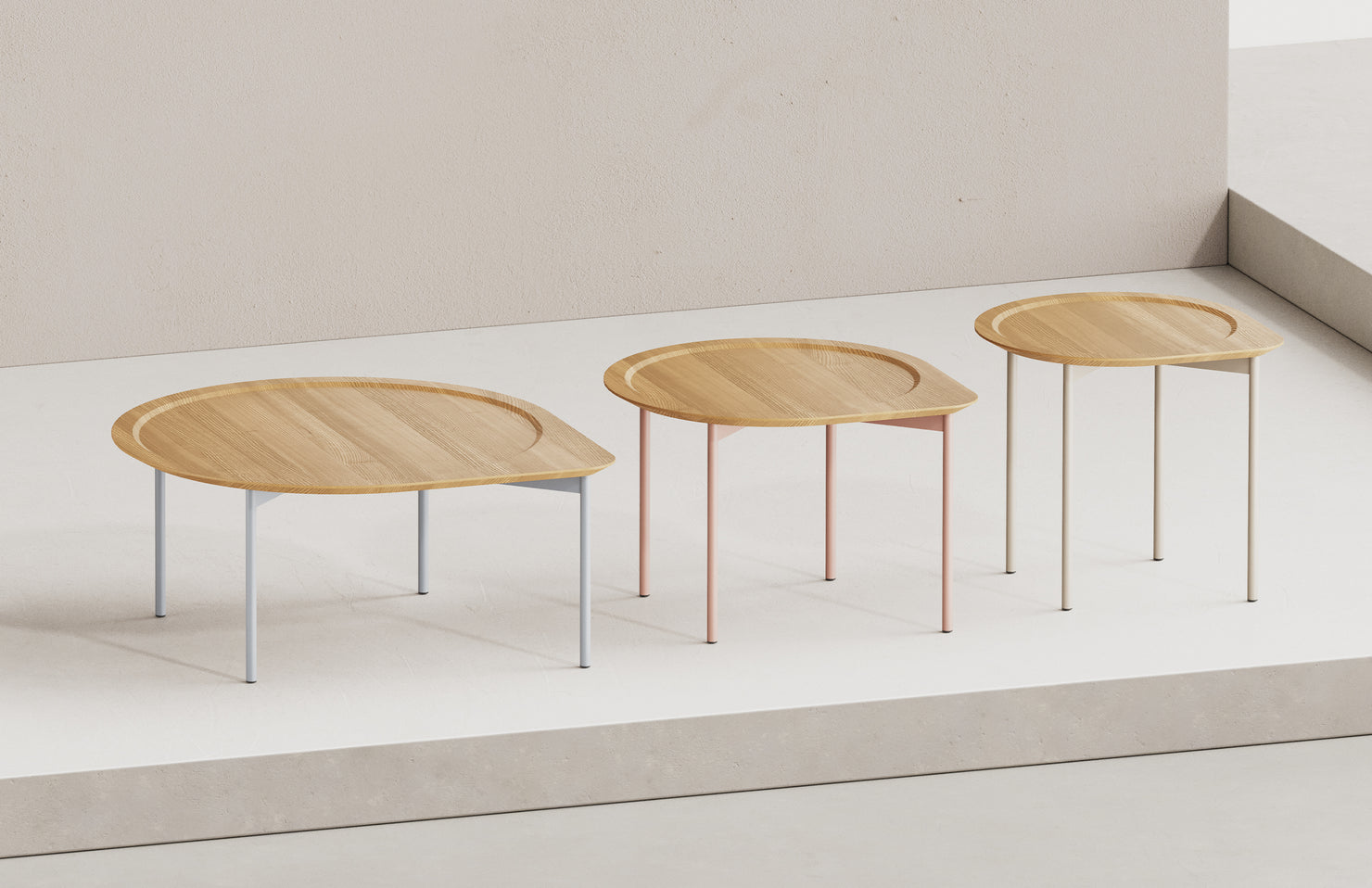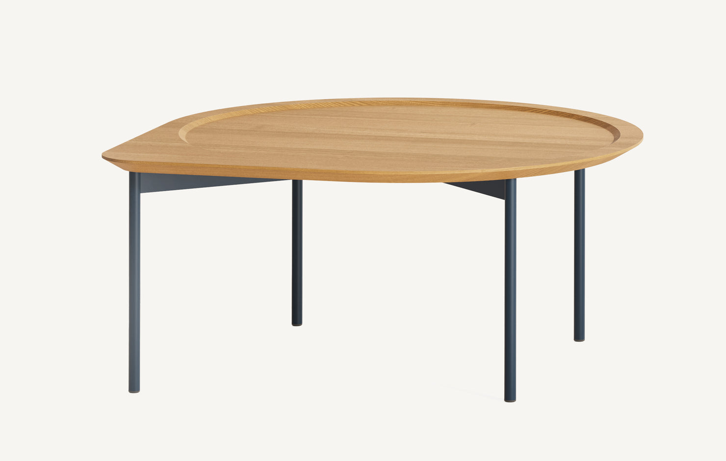 A playful coffee table with a teardrop shape and a recessed top that nests with others for a fun clustered aesthetic.