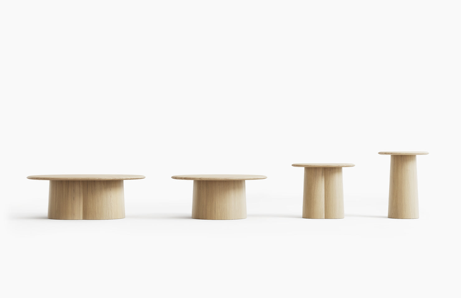 Made of oak, the tapered edge gives an added sense of tactility, adding a softness to the solid wood tops. Various sizes and shapes offered allow for easy combinations.