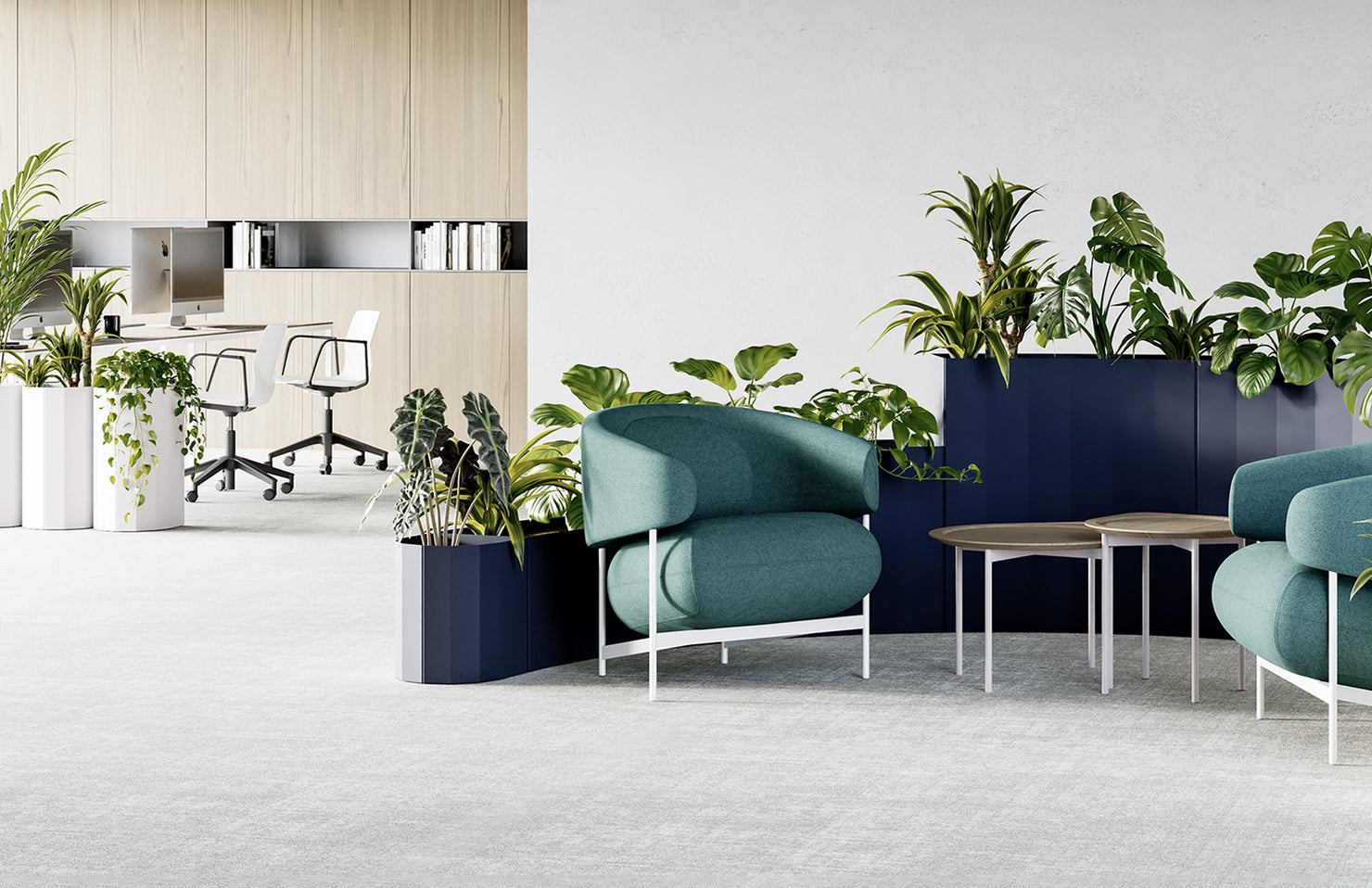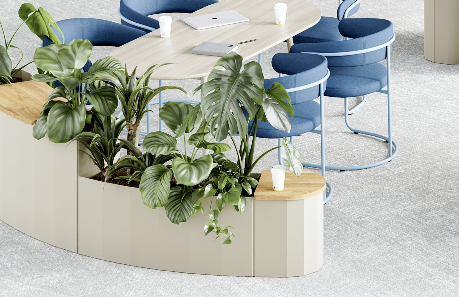 Part of a standalone/modular planter system featuring soft undulating curves, gentle visual facets, and optional wood surfaces; perfect for incorporating biophilia, creating quick touchdown points, and dividing spaces with a minimal footprint.