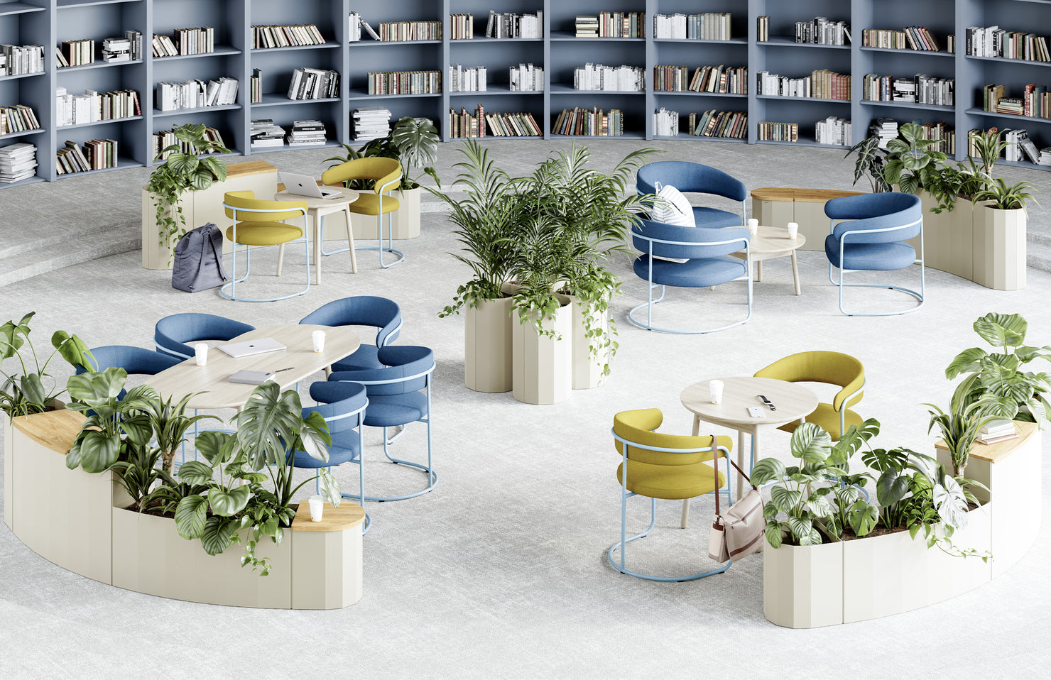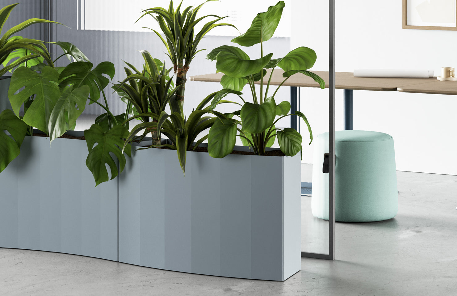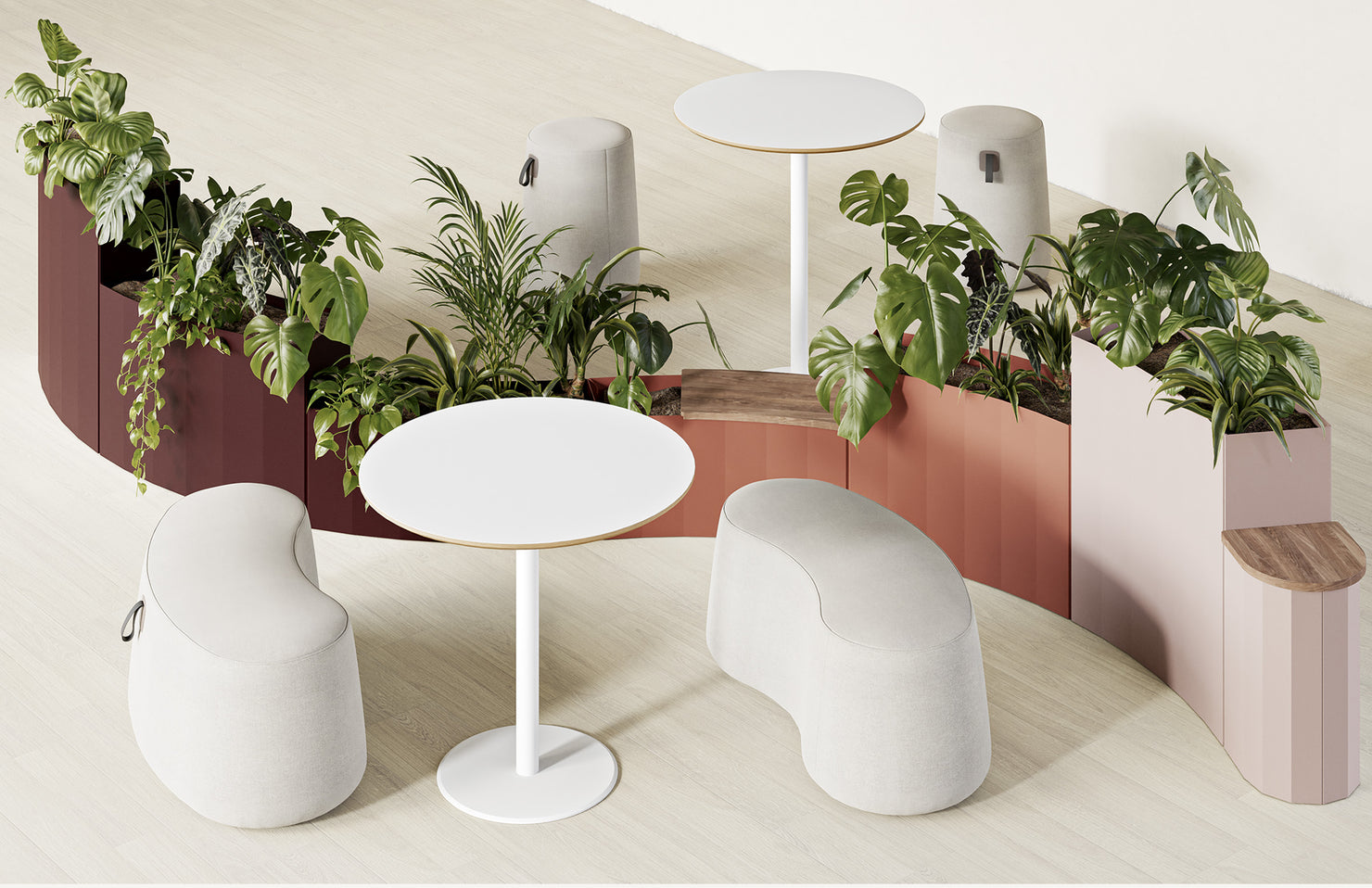 Part of a standalone/modular planter system featuring soft undulating curves, gentle visual facets, and optional wood surfaces; perfect for incorporating biophilia, creating quick touchdown points, and dividing spaces with a minimal footprint.