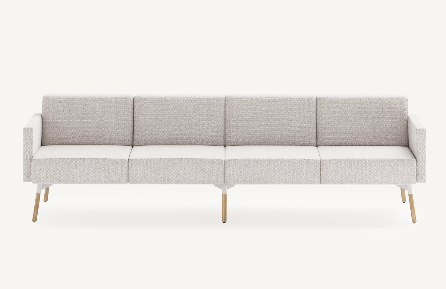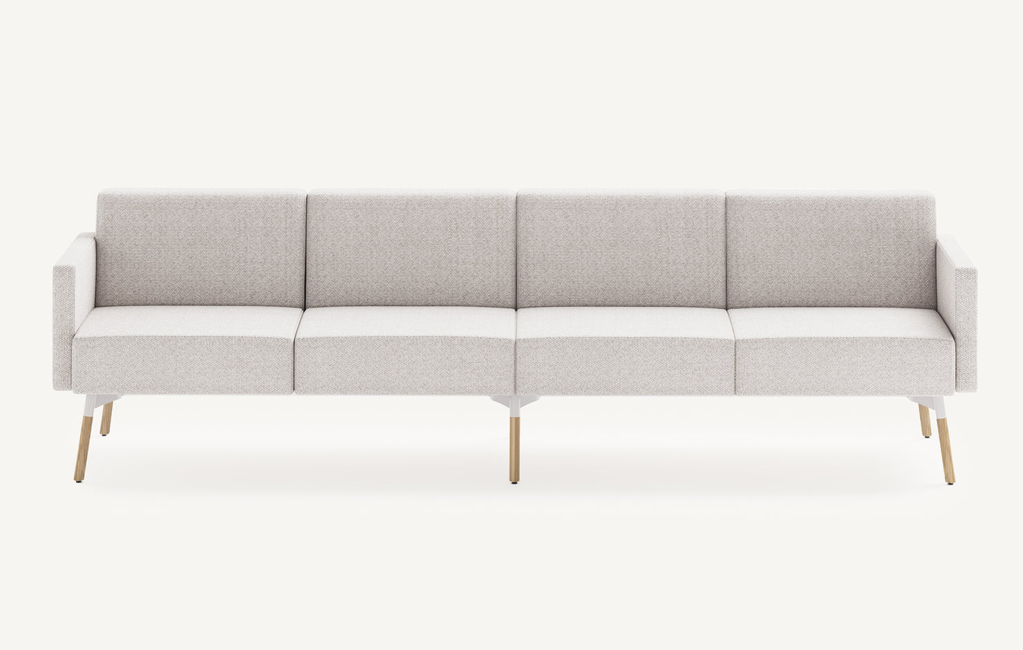 Wood contrasts with powder-coated metal creating an inviting seating option with arms for additional comfort.